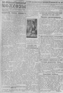 ы м и н я и т с ъ i По РСФОреРализовано Заём на5 миллиардов 537 миллионов 542 тыс. руб. Т р у д я щ и е с я P C Í f P с большой г , , и г а Сс|,с,” ' ого " к в т « ' - » » « с - » . ravM II ! ; 4, . J \ ü4 8{ 3 / 8) ИЮ Л Я 1940 Г . п я т н и ц а |Г о г над. рпдосп.ю подписы ваю тся на новый Заем. На 8 июля с у м м а п о д п и с ки по юродам и селам Р С Ф С Р сост авила 5 миллиардов 5 3 7 милс о о т в е т с т в у ю щ и й период пр ош л ою г о д а . Впереди д р у г и х по размещению З а й м а ю р о д а М о с кв а , Л е н и н гр а д , М о с к о в с к а я , Р о с т о в с к а я , Челябннлионов 5 4 2 ты с . р уб . Э ю на | с к а н , С м о л е н с к а я , Молотове к а я , один м иллиард 24(» миллионов I С а р а т о в с к а я и Т а м б о в с к а я области i о- ч 3 2 5 ты с . руб. бо льш е, чем за ' К р а с н о д а р с к и й к р а й , К р ы м с к а я Б а ш к и р с к а я , М ордовская, У д м у р т с к а я А С С Р . О бщ ая с у м м а подписки среди к олх озников за Б дней п р е в ы с и л а прошлогоднюю за с о отв етс твующ ее в р е м я — на 2 6 0 м иллионов 3 3 3 т ы с . руб. ( Т А С С ) . Н А Б И Р А Т Ь ТЕМПЫ СЕНОКОСА M l и rut f .n. om v ^ * ш Из i o t a н год р а с т е т и к р еп л е г н а ш е общ е ств енно е ж и в о т н о в од с тве , д а в а я бо льш ие доходы к о л х о з а м . Одним из ОСНОВНЫХ ф а к т о р о в , необходимых для его д а л ь н е й ш е г о у к р е п л е н и я , я в л я е т ся создание иронией кормовой ба зы . К о л хо зы н аш е го рай он а к атом то лько не выполняют норм ы , а и де з о р и н и з у ю с р а б о т у своими а я ги - колхозными р а с с у ж д е н и я м и . В сенокосной бригаде не организо - нано со циалистическое сореапо- нан||',( учет тр у д а пос тавлен плохо. Председатель колхоза той. Ч и к ун о в очень редко бы ва ет на сенокосе, не ! Ь6пч колхоза имени В о р о ш и лова (Канский район, Красноярского края) Л). 13. Андриенко с выхолим колхозников на поля перенесла «-вою работу и полевые бригады. ! ОБЕСПЕЧИМ ОБЩЕСТВЕННЫЙ СКОТ НОРМАМИ НА ВСЮ ЗИМУ ! i о , у д о л ж ны « г о т жи гь 5 5 0 т ы с я ч | лий па о р г а н н и ц ш ^ с и ^ е б о й - п е н т я щ « , „ _ се н з , убрав 3 5 . 0 0 0 га пои работы. П равленцы н е ' з а н и - с енокосной площ ади. Кроме э т о ю , необходимо з а л о ж и т ь деся ть т ы с я ч т о н н си л о с а . Кед и но время в ы п о л н я т ь э т у работу, то калхи зы н а ш е ю р а й о н а хорошо обзе- п е ч а г к о р м а м и на нею зиму общ е ств енно е животноводство. По, к а к видно из последних д а н н ы х , мы недопустимо отстаем с проведением сеноуборочных работ. Н а 5 июля ие району было сн ош ен о то л ь к о 3 . 3 5 2 ге к т а р а или 1 2 процентов п л а н а , а з а ст о г о в а н о вс его л и ш ь 5 . 2 2 0 цепт- неров . Э го -далеко не те п о к а з а т е л и , которые мы могли д а т ь . М н о г ие колхозы по большевис т с к и ос ознали необходимость и ме ть больше хо р ош и к кормов для с к о т а . Они своевременно выехали в ноле, по-настоящему о р г а н и зо в а л и тр у д ко л х о з н н к о з и с е й ч а с т а м работа в самом разг а р е . Н от. п а п р и м е р , с е л ь с к о х о з я й с т в е н н а я а р т е л ь « У д а р н и к » , Г р а ж д а и ц е в с ко го сельс ове та. Здесь п р ед с ед ат ел ь п р а в л е н и я Са велий И в а н о в и ч Сю б о д ч п к о в и п а р т о р г Обкома Ш £П (б ) то в Щ а п о в с у мели мобилизов ать колхозников на у д а р н у ю работу, организовали с о ц и а л и с т и ч е с к о е соревнов ание за в ы с о к у ю производительнос ть . Р е з у л ь т а т бо л ьш еви ст ско й о р г а н и з о в а н но сти н алицо : в колхозе п о лн о с тью заложен с и л о с — 2 1 5 т о н н , вы кош ено 2 5 0 гек та р о в сен о ко сн о й площад и из п лана 7 0 0 г а , к заскирдовано больше 9 0 0 ц е п г н е р о в с е н а . Ко л х