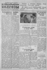 3 З А Б О Л Ь Ш Е В И С Т С К И Е К О Л Х О З Ы 51 (381) Д А З Д Р А В С Т В У Ю Т С В О Б О Д Н Ы Е Н А Р О Д Ы Э С Т О Н И И , Л А Т В И И И Л И Т В Ы ! Приветствуем освобожденные народы Коммунисты-отличники бх>вой и политической подготовки Н ской иодводиои лодки. Боензехнпк 2-го раега С. II. Белов (слева) к старшина В. С. Федотов, награжденные орденом Красной ивезды. День Военно-Морского Ф лота Дом культуры села Северного переполнен рабочими, интеллигенцией и колхозниками. Собралось около 250 человек. Председатель Исполкома райсовета тов. Верзун открыл митинг посвященный сообщениям о преобразовании Эстог- ской, Латвийской и Литовской буржуазных республик в Советские Социалистические Республики и о вступлении Литвы, Латвии и Эстонии в состав СССР. Слово предоставили секретарю райкома партии тов. Полякову. Чтение телеграмм ТАСС о событиях в прибалтийских странах докладчиком, неоднократно прерывается длительными аплодисментами, приветствующими свободные народы Эстонии, Латвии и Литвы. В зале раздаются крики! «Да здравствует великий Сталин!», «Да здравствует глава советского правительства и народный комиссар иностранных дел тов. Молотов!». Тов. Поляков в своем докладе указал, что трудящиеся народы Эстонии, Латвии и Литвы навсегда освободились от капиталистического гнета, провозгласили у себя советскую власть. Иботолько она несет подлинную свободу, равенство, обеспеченную культурную жизнь трудящимся. Трудящиеся Литвы, Эстонии и Латвии просят Припять их всостав вслик< - го Союза Советских Социалистических Республик. В единогласно принятой резолюции митинга присутствующие записали: «Мы, трудящиеся села В колхозах, организациях нашего района с большим воодушевлением проходят многолюдные митинги и собрания, посвященные установлению воветской власти в Эстонии, Латвии и Литве. На всех этих собраниях трудящиеся района одобряют мудрую сталинскую политику Советского правительства и приветствуют освобожденные от капитализма Северного, вместе со всем великим пародом своей родины,с чувством великого торжества и "радости приветствуем освобожденные народы Латвии, Литвы и Эстонии, Трудящиеся этих с т р а н находились под гнетом помещиков, капиталистов. В этих странах провозглашена советская власть. Мы прсоим Верховный Совет СС Р удовлетворить просьбу Советских Социалистических Республик—Литвы, Эстонии пЛатвии — принять их в состав великого Советского Союза. Помпя указания тов. Сталина о капиталистическом окружении и нашей мобилизационной готовности, мы всеми силами будем крепить обороноспособность нашей родины, неустанно повышать производительность труда. Каждый из пас будет честно работать на своем посту, всемерно укреплять наше колхозное хозяйство. Мы поведесмуровую борьбу против лодырей, прогульщиков. Мы все своя силы и средства направим на быстрейшее завершение уборки богатого урожая без потерь. Наши победы—есть победы первого в мире социалистического государства, зовущие к освобождению все человечество от экенлоатации капитализма. Да здравствует мудрая сталинская политика нашего социалистического государства! Даздравствует великий Сталин!». народы Эстонии, Латвии и Литвы, просят Верховный Совет СССР удовлетворить просьбу трудящихся Литвы, Эстонии и Латвии— при пять их в единую семью социалистической родины трудящихся СССР. В сиоих р