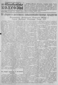 2 З А Б О Л Ь Ш Е В И С Т С К И Е К О Л Х О З Ы 54 (384) Об уборке и заготовках сельскохозяйственных продуктов Постановление Центрального К ом ит ет а В К П ( б ) и Совета Н а р о д н ы х К ом и с са р о в С о ю з а С С Р П р одолж ен . Нач . на 1-й стр. 2 0 . Обеспечить в к о л х о за х , МТС п совхозах подвое исполь зование всех колхознико в, рабоч и х МТС ц совхозов и я х рабоч е го времени на уборке и на деде п о к о н ч и т ь с недопустимой п р а к т и к о й в некоторых ко лхозах, М'ГС л совхозах, когда к о л х о з н и к и н работники МТС и совхозов вместо того , чтобы начинать работ у до 5 — 6 часов у т р а , выходит на уборочные н полевые работы в 8 — 9 часов и ко нчают работу в поле раньше захода солнца. Проверить и обеспечить по колхозам, МТС и совхозам оборудование полевых станов, к у х о н ь , о р га н и за ц и ю п и т а н и я в поле с тем , чтобы к о л х о зн и ки , работнн к н МТС и совхозов не были вы нуждены возвращаться на обед и на ночь в село и те р я т ь п а это дорогое рабочее время. 2 1 . Призиать неправильным , когда в колхозах после выполнен и я своих обязательств перед г о сударством все зерно и з н а ч и тельная часть кормов раздаются но труд одням, в результате чего колхоз остается без в с я к и х з а п а с н ы х страховых се менных, п р о довольственных н ф ураж ных фондов на случай н еурож ая в следующ и й год. Предложить к о л х о зам обеспечить правильное и с пользование собранного у р о ж а я с т е м , чтобы после выполнения всех обязательств колхозами пе ред государством и з асы п к и се м я н были созданы в колхозах на случаи неурожая страховые семенные, продовольственные и фур аж ны е фонды. 2 2 . Установи ть, что семенной страховой фонд зерновых к у л ь т у р в колхозах из у р ож ая 1 9 4 0 года создается в размере 15 проц . годовой потребности, а в колхо з а х засушливых областей, г именно : Саратовской, Сталин град с к о й , К у й б ы ш ев с ко й , Чкаловс кой , Занадно Ка зах с та нс к ой , А к тю б и п с кой областей и АССР Немцев Поволжья — в размере 2 0 проц . годовой потребности. Образовать из у р о ж а я 1 9 4 0 года в колхозах продовольственный страховой фонд в размере 2 п р о ц . от валового сбора продовольственных к у л ь т у р . У с т ан о в и т ь , что но вы полне н и и всех своих обязательств п е ред государством (возврат ссуд, зернопостав ки , по гашение недоимо к, натуропла та) правление колхоза и , н прежде в с е ю , председатель колхоза обязаны образовать все установленные общественные фонды зерновых к у л ь т у р (семенной и фуражный фонды, семенной страховой фонд, продовольственный страховой фонд, фонд вспомоществования) и лишь после образования их п р и с т у п и т ь к распределению зерновых к у л ь т у р по трудодням сверх тех ко ли честв ,котоиые в порядке аван сов выдавы колхозникам но т р у додням. 2 3 . Обязать Наркомсредяаш, Н ар ко м те к с тв л ь , Наркомчермет и Наркомхямпром закончить полностью в ближайшие дни о т г р у з к у запасных частей, брезеитовой т к а н и , мешков, ш п а га та , металла н резины Нарко мзему, Нар- ко м з а г у и Наркомсовхозов СССР в с р о к и , устапонленпие Эконом- советом при Совнаркоме СССР. 2 4 . Обеспечить проведение прополки п рыхление м е ж д у р я дий подсолнечника и д р у г и х мас л и ч ны х к у л ь т у р вплоть до я х у бо р ки , не ослабляя работ по уходу за ними в период уборки зерновых к у л ь т у р . 2 5 . Уборк а подсолнечника в каждом колхозе должна быть проведена в течение 6 — 8 дней с момепта созрева