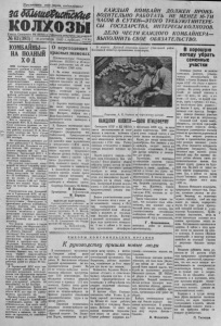 П р о л е т а р и и в с ех ст р а н , соединяйте сь ! за Ш&ше&итёШ е колхозы Га зе та С е в е р н о г о РК ВКП(б ) и Р а й г т . о т » „ „ _________ ' к р " ¿ » о -------------- ~ « < _ Н с о и е ^ д е п ^ т а т ^ ^ У д я ( Ц Н X с я «№ О о ( д У б ) [ 14 сентября 1940 г.субОотя К О М Б А Й Н Ы — ~ Н А ПОЛНЫЙ Х О Д ; Г О Д ИЗД I шестой* К А Ж Д Ы Й К О М Б А Й Н Д О Л Ж Е Н ПРОИЗВОДИТЕЛЬНО Р А Б О Т А Т Ь НЕ М ЕНЕЕ 16-ТИ ЧАСОВ В С У Т К И —ЭТОГО ТРЕ БУЮ Т ИНТЕРЕ СЫ ГОСУДАРСТВА, ИН ТЕ РЕСЫ КОЛХОЗОВ. Д Е Л О ЧЕСТИ К А Ж Д О Г О ВЫ П О Л Н И Т Ь СВОЕ ОБЯЗАТЕЛЬСТВО. 9220 гектаров площади ны нешнего у р о ж а я в нашем рай оне должны быть убраны комбайнами. Для выполнения э т о г о плана партия и правительство снабдили нас первоклассными машинами, н е т не д ост а тк а и в горючем . Д е л о только в людях, которым доверены ценные механизмы. На кол хозны х полях нашего района ра ботают 52 комбайна. Э т о —бо льшая сила , призванная б е з потерь убрать обильный у р о ж а й . Без усло вно , б о л ь шинство комбайнеров честно о т но сятся к ра боте, преданно от д аю т свой т р у д на х л е б о у б о р к е , а отдельные товари щи д аю т рекордные в услови ях района показатели. Вот, к п р им ер у , комбайнер С е вер н о й М Т С Н. 3 . Балохонов . С в о е с е з о н н о е задание он вы полнил у ж е на 150 проц., качес тво работы хорошее. Е- Д . Дов гу ле в (к о л х о з им. 6-го с'езда со ве то в ) к 10 сентября убрал 203 гектар а. П о -с т аха н о в ск и работает д е путат райсовета Г А Николаев. В ко л хо зе им . Тельмана он у б - рая больше 250 гектаров ( с е зонное задание 180 га) Ком байнеры Тартасской М Т С т. т. Быков, Яковлев и Колгеев так ж е давно выполнили г о с у д а р ственные задания . Но у с п е х и отдельных това-1 рищей не могут сл ужить ширмой для общего отставания комбайновой уборки хлебов. Разве допустимо то явление, что 55 комбайнов, находящихся на полях , к 10 сентября убрали только 5.196 га? Разве только это можно было с д е лать з а полтора месяца работы? Р у ко во ди те л и как Северной так и Т ар т а сско й М Т С не о р ганизовали по настоящему ком б ай н о в ую у б о р к у , проявляют недопустимое благодушие к срывщикам работы комбайнов. Только поэтому еще многие комбайнеры крайне б е з о т ве т ственно относятся к работе, д о п у с к а ю т огромные простои, зря ж г у т горючее , а пользы М Т С и к о л хо зу не дают и на копейку. Что можно сказать о таком к о м б а й н е р е , к а к Марьевич ( С е верная М Т С ) , которая в колхо зе .П а м я т ь К и р о в а “ у брал а 8 г е к т а р о в ? Э т о позорный п о к а затель! Б есчи сл ен ны е поломки, п е р е р а с х о д горючего, срыв у бор ки в к о л хо зе—вот лицо Марьевич. Комбайнер В е д е р ников (колхоз . Н о в а я ж и знь “ ) бе спе чн о относится к своей машине. Бывает так, что он на х о д у тер яет какую -ни буд ь пл ох о п р ек репленн ую деталь, а потом ищет ее часами. З а 35 рабочих дней он убрал 59 гектаров . В Тар та сско й М Т С есть три . С е в е р н ы х “ комбайна. В ре зу л ь та те неумелого использования эти прекрасные машины с т о я т , не работаю т , Комбайнер Тимофеев одной из этих машин „у м у д р я л с я “ убирать за пятидневку по 2,5 гектара. В с е комбайнеры брали на с е б я об я з ат е л ь с тв а . Ди рекции о б е и х М Т С все еще не у д о с у жи ли сь проверить их. Время у бор ки уходит. Почетный долг каждого комбайнера — выполнить взятое на себя об я зат е ль с тв о . Для этого необходим о р а б о т а т ь не менее 16 -ти ча со в в сутки , бережно относи ться к машине, не д о п у с кать ни п р о с то ев , ни малейших потерь з