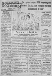 д р о л с т и р т о t o a и з д а н , 0 Рг »и С е в е р н о г о Р К В К П < « , , Р . Я е о е е , . » е п у т . т о , , р у ю и „ х с н ___________________ Новосибирской Облас ти с у д я щ и х с я В 77(407) 7 ноября 1940 г . , четвеог ■------- F шестой здравстзует XXIII годовщина Великой Октябрьской социалистической революции в СССР! В Е Л И К А Я Г О Д О В Щ И Н А Д в а д ц а т ь т р и г о д а прошло с т о го и с т о р и ч е с к о г о дня. к о г д а Л е н и н , стоявший у р у л я В е л и кой О к т я б р ь с к о й революции, заявил на весь мир: „ Топарищ и! Ра бочая и к р е с т ь я н с к а я революция , о н е обх од им ос ти к о т о рой все время говорили больш е в и к и , с о в е р ш и л а с ь . . Отныне н а с т у п а е т новая полоса в и с т о рии России, и д а н н а я тр е тья р у с с к а я р е в олю ци я д о л ж н а в своем к о н еч н ом и т о г е привести к победе с о ц и а л и з м а “. П р о р о ч е с к и е слова Л е н и н а сбылись) В н аш ей стр ан е, ведомой великим п род ол ж ате л ем д е л а Л е н и н а — Иосифом В исса рионовичем Сталиным ,— с о ц и а лизм победил . С о в е т с к и й н а род , единый и монолитный, п о строил в основном с оц и а л и с т и ческое общество . Скво зь неимоверные т р у д н о сти г р а ж д а н с к о й войны и вое стан о в и те л ь и р го п ери од а , ло мая все п р е г р а д ы , с овет ский н а р о д ,р у к о в о д и м ы й б о л ьш е ви с т с к о й п ар ти ей , п риш ел к в е личественной эпохе с т а л и н с к и х п я т и л е т о к . Воздвигались ф аб р и к и и заводы, шахты и р у д н и к и . Прокл адывались новые ж е л е з н о д о р о ж н ы е магистрали. К ан а лы соединяли р еки и моря в новые водные п у т и . И с т е кш и й го д ознаменовался п рисоедин ени ем к Советскому С о ю з у т р е х новых р ес п убл и к : Л и т о в с к о й , Л а т в и й с к о й , Эстонс к о й ,— гд е волей тр удящи хся был с в е р г н у т к а п и т а л и с т и ч е с к и помещичий строй у з у р п а т о ров и у с т а н о в л е н а советская власть. В семью с о в е т с к и х н а родов влились народы Б есса рабии и С ев е р н о й Буковины, о с в о б о ж д е н н ы е С ове тск им Со юзом и з -п о д и г а румынских ^ бояр. Ра зд в и н у л и с ь г р ан и ц ы нашей родины и н а северо за п ад е : д о блестная. г е р о и ч е с к а я Красная Армия с о к р у ш и л а белофинский плацдарм , п одготовленный имп е р и а л и с т и ч е с к и м и х и щ н и к а ми для н ап ад е н и я на Л е н и н гр ад . Благодаря м удрой сталинской пнешней п о л и т и к е советский народ избавлен о т у ж а с о в войны и п р о д о л ж а е т свой мирный с о ц и а л и с т и ч е с к и й т р у д . Но мы знаем , что надо быть на чеку ; надо весь наш народ д е р ж а т ь в мобили за ци онн ой готовности и с еще большей э н е р г и е й к р е пить х о з я й с т в е н н о е и оборонное м о гу щ е с т в о с о ц и а л и с т и ч е с к о го го с у д а р с т в а . П е р е х о д на 8-яасовой рабо чий день и 7 - д н е в н у ю р або чую неделю с л у ж и т интересам дальн ейш е го у к р е п л е н и я х о з я й с т венной и оборонной мощи СССР. О д е р ж а н ы большие победы. Но мы не вправе о станавли ваться на д о с т и г н у т о м . Мы должны стр ем и т ь с я еще и еще вперед, к д а л ь н е й ш е м у п р еус певанию н аш ей в еликой родины. росту е е б о г а т с т в а , к у л ь т у ры , военной и хозяйственной мощи. А это з н а ч и т , что на з а воде или в к о л х о з е , в у ч р е ж дении или и К р а с н о й Армии, на т р а н с п о р т е или в школе к а ж д ы й и з нас , гд е бы он ни нах о д и л с я , д о л ж е н быть бдительным, подт ян уты м, дисцип линированным, р або та ть еще л у чш е , е щ е и н и ц и а т и в н е е , еще п рои зв о д и т е л ь н е е на благо народа, 