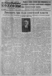 Т Т р о л ^ а р ш ^ с ^ с т р а н , с о е д и н я й т е с ь t ш ш т е Ъ и ш й т КОЛХОЗЫ № 78 ( 4 0 8 ) I ноября Ю40 г . , четверг J1о д и з д . шестой Первая и самая главняа наша обязанность-это дальнейше укрепление хозяйственой иобороной мощи социалистической родины. (Из д о к л а д а тов. М . И . Калинина на торжественном заседании в Б ольш ом театре 6 н оя бр я 1940 г .) . Двадцать три года советской власти Д о к л а д тов. М . И . К ал и ни н а на торжественном заседании в Б о л ьш ом театре 6 ноября 1940 года Тов ар ищ и , двадцать тре т и й год сущ ес тв ов а н и я советской власти займет видное место в истории Союза ССР. Эго — i од к р у п н ы х успехов к а к в социалистическом строительстве, т а к и в области внешней п о л и т и к и . В начале т е к у щ е г о го да выполнение производственного плана промышленностью встречало серьезные т р у д н о с т и , Я имею в виду не обычные тру д но с ти , обусловленные н аш им ростом, а тру д но с ти , св язанные с международной обстановкой, которая сложилась то гд а . Эти трудности п о ня тны вам без п о я с н ен и и . Гем не менее выполнение плана за 1 9 4 0 год о ж и д а е тс я , даже при осторожном подсчете, с п р и ростом в 1 3 , 6 миллиарда рублей, или на 11 нроц. больше по сравнению с 1 9 3 9 годом. Сюда, ко нечно, яе входит промышленность западных областей У к р а и н ы а Белоруссии и новых советс ких р е с п у б л и к . В этом геду м и имеем определенные сд в вгн в работе металл у р г и и и у гольной промышленн о с т и . Рост вы п л а в к и металла ц добычи ка м е н н о го у г л я идет ие- укл онио . Напр им ер , добыча каменного у г л а по с р а в н е н и ю с соответствующими месяцами п р о ш л о ю го да составила : июль 1 1 2 проц. а в т у с т 1 1 4 , 3 ароц. сентябрь 116 нроц. З начи тел ьны х успехов добилась цветная м е т а л л у р ги я . Вообще, т ов ар ищ и , во второй половине т е к у щ е г о года наблюдается зн ачител ьный рост нашей тяжелой и н д у с т р и и по всем ее разветвлени нм. Удовлетворительна работала л е г к а я промышленность. Из многочисл енных новостроек мне хочется отме тить только две. которые у ж е в с т у п а л и б п у с к о вой церпод. Пе рвая— это У г л и ч с к а я гидрос т а н ц и я на 1 1 0 т ы с я ч к л в т . Она п у с к а е т с я ск ромно , хо тя в два раза пр евосходит Нолховстрой. Эта с тан ц и я я в и т с я серьезным вкладом r эи е р1е тпчес кое хе зчй - ство центрально го района , в час т н о с т и — Москвы, и увеличит глубокоьодзоеть Волги вниз от Hi анькивской плотины километров на двести. Вторая— это Ч и рч яи с к а н ги дростанция в Узбекистане с мощностью первой очереди и 43 тыся чи ы в т . На базе этой с т а н ции построен азотный завод, ко т о р и й будет добывать азот из воды и воздуха. Тем самым в значител ьной степени разрешаетс я проблема удобрений для хлоп- к с в ы х полей среднеазиатских советских р е с п у б л и к , а транспор т избавляется от соответствующих переаозок. Ваш железнодорожный тра н спорт сп р ави л ся с работой и усп о т н о выполнил чрезвычайные задания . Немало достижений имеет и сельское хозяйство, хотя по веге тационным услониям 1 9 4 0 год был для пего очень ка п р и з н ы м . З а тя н у вш и ес я весной холода повелительно требовали проведен и я сева в крайне сокращенные ср о ки . Наше колхозное кр ес ть янство удовлетворительно справилось с этой задачей. Надо прямо с ка за ть , что без той т е х п и к и , коей насыщено социалистическое сельское хозяйство, было бы невозчожпо одолеть кап р изы природы. И результат на