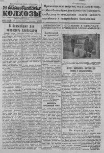 этека. i M U b U U . Пролетарии всех стран, соединяйтесь! 2аШшшяЗисшЫ КОЛХОЗЫ Орган С е вер н о го НК ВКП(б/ и Райсовета депутатов трудящихся Новосибирской области г . , вторник | ‘ »íaot i областная научная Приложить в сю энер гию , все усилия к т о м у , чтобы в ближайшие дни полно стью завершить х л е б о с д а ч у — неотложная задача каж до го партийного и непартийного большевика. В ближайшие дни завершить хлебосдачу Передовые к о л х о з ы наш е го р а й о н а у ж е д а в н о вы п о л н и л и перед г о с у д а р с т в о м свою п е р в у ю з а п о в е д ь — х л е б о з а г о т о в к и . Ови т а к ж е п о л в о с т м о у п л а т и л и н а т у р о п л а т у з а р аботу МТС , вы п о л н и л и в о с т а л ь н ы е свои оба» з а т е л ь с т в а . О с т а в ш и е с я излишки хлеба в к о л и ч е с т в е 2 3 т ы с я ч п удов передовые ко л хо з ы продали к о о п е р а ц и и в п о р я д к е х л е б о з а к у - н а . У с п е х п е редовы х к о л х о з о в — я р к о е д о к а з а т е л ь с т в о т о г о , что все ко л хо з ы р а б о п а имели по л н е й ш у ю в о з м о ж а о с т ь у ж е давно в ы п о л н и т ь п л а н хлебоза готово к . И атом год у у р о ж а й удался на с л а в у . К о л хо зы собрала большое к о л и ч е с т в о хлеба , вполне до ст аточное д л я т о г о , чтобы р а с с ч и т а т ь с я с го с у д а р с т в о м . У нас им е ю т с я все в о з м о ж н о с т и для т о г о , чт обы п л а н хл ебоза готово к был вы пол в е н . Однако в де й с т в и т е л ь н о с т и это го н е т . В ы п о л н е н и е п л а н л хлебосдач и по с о с т о я н и ю на 1 0 дек&б р я с о с та в л яе т т о л ь к о 7 8 я р о ц . Отдельные к о л х о з ы , к а к , н а п р и мер, вм е н и Ч е л ю с к и н ц е в , «Се п е р в ы й Та рта с с > , « Н о в а к ж и з н ь » п л а н в ы п о л н и л и т о л ь к о в а з б — 3 8 п р о ц . Где п р и ч и н ы т а к о г о провала? Весь к о р е н ь з л а з а к л ю ч а е т с я в т о м , ч т о о тд ел ьны е р у к о в о д и т е ли п а р т о р г а н и з а ц и й , председатели се л ь и с и о л ко м о в , ко лхозов п р о я в и л и н е д и с ц и п л и н и р о в а н н о с т ь в деле в ы п о л н е н и я з а к о н а о з а г о т о в к а х , д о п у с т и л и я д о п у с к а ю т либерал ьное о т н о ш е н и е к н а р у ш и т е л я « с о в е т с к и х з а к о н о в , а в отд ельны х с л у ч а я х д о п у с к а е т с я явное п о к р о в и т е л ь с т в о с р ы в щ и к а м и д е з ор гани затором хлебозагот о в о к . Р а й о н н ы е о р г а н и з а ц и и т а к ж е н е д о с т а т о ч н о о п е р а т и в н о р у к о в о д и л и ходом х л е б о ш о т о в о к Вс« »то вместе взятое и привело к т а к о м у позо р н ом у о т с т а в а н и ю . И с к л ю ч и т е л ь н о неудовлетв ор и т е л ь н о об с то и т дело с хлебосдачей в к о л х о з е и м е н а К р у п с к о й . H t 2 3 9 0 ц е н т н е р о в арте ль сдала т о л ь к о 1 1 3 ? , т . е . п л а н в ы п о л н е н неего иа 4 7 , 3 п р о ц . Здесь имеет ся м но го хлеба, есть все у с л о в и и р а с с ч и т а т ь с я с г о сударс твом Но правленце к о л х о з а во гл а в е с председателем то й . •Ивановым и с к л ю ч и т е л ь н о бесп е ч н о о т н о с и т с я к в ы п е л в е я в ю первой за п о в е д и , п р и м и р е н ч е с к и о т н о с и т с я к е р ы н щ н к а ч и дезорга н и за т о р а м х л е б о с д а ч и . Свыше Ю О ц е н т н е р о в зерна про л е ж а л и 7 дней н а с у ш и л к е колхоза имен и Т е л ь м а н а , а правление все э г о время рядил ось — к о ю ж е п о с л а т ь для о т п р а в к и хлеба на п у н к т з а г о т з в р в о . В этом к о л х о зе т а к ж е более 3 9 0 центнеров хлеба л е ж и т в амбарах и па т о ч к а . Зерно т р е б у е т по д р а б о т ки , но председатель п р а в л е н и я то в . И в а нов не п р и н и м а е т н и к а к и х мер в т о м у , чтобы быст