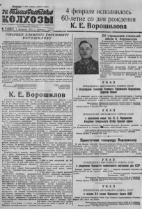 Ш р ь у щ д р ш в е л х с т р а н , с о е д и н и » т е с ь ! Зй<Ш бшеШ т схке К О Л Х О З Ы Орган Северного РК ВКП(б.» и Райсовета д е п у т а т о в тр у дящ и х с я ___________________ Новоси б ир с кой области № 9 (424)1 7 февраля 1941 г. пятница ‘шестой 4 февраля исполнилось 60-летие с о дня рождения К. Е. Ворошилова Т О В А Р И Щ У К Л И М Е Н Т У Е Ф Р Е М О В И Ч У В О Р О Ш И Л О В У Цен трал ьны й К о м и те т бол ьше ви стской партии и Совет Н ародны х Ксмиссаров С о ю за ССР горячо п р и в е т с т в у ю т тебя, вер н о го сора тни ка Ленина и (.талина, одн о го из а к ти в н е йш и х строителей к о м м у н и с т и ч е с к о й партии, виднейшего о р ган иза тора в о о р у ж е н н ы х сил С о в е т с к о г о го судар ст ва и вы дающ е го ся п ол к о в о д ц а Кра сн ой Армии —в день т воего шестидесятилетия. Всю свою ж и з н ь с ю нош ески х лет ты посвя тил револю цион ной борьбе з а д е л о р а бочего класса, за к о м м у н и з м . В годы первой р у с с к о й револю ции 1905-1907 г .г . ты боролся в передовы х рядах р е в о л ю ц и о н ны х д о н е ц к и х р а б о ч и х и вместе с Л е н и ным и Сталиным строил нашу б о л ь ш е в и с т с к у ю п артию . Ты был одним и з а к т и в н е й ших у ч а с т н и к о в В ел и кой О к т я б р ь с к о й соци ал истич е ской рев о л ю ц и и и б о л ьш е в и с т с ким р у ково ди телем ее в Д о н бассе, одним из первы х о р га н и з а то р о в Р а б о ч е -К р е с т ь я н с к о й Красной А рм и и . Под твоим командованием 5-ая У к р а и н с к а я армия в 1918 год у совершила г е р о и ч е с к и й п о х од к Ц а р и ц ы н у , прорвав кол ьцо белоказачь ей к о н т р р е в о л ю ции. При твоем р у ково дящ ем участии была создана Первая К онная армия, покрывшая себя неувядаемой славой. Ты -пр ош ел с ней славный п обедоносный п у т ь , с о кр уш ая д е н и к и н с к у ю к о н т р р е в о л ю ц и ю , громя белополякон, л и к в и д и р у я белые банды В ран ге - ли* Твоей н е у с т а н н о й многолетней работе по р у к о в о д с т в у К р а с н о й Армией —она во многом обязана тем, что выросла в м о г у ч у ю и г р о з н у ю силу. 11а всех э тап а х твоей сланной рев о л ю ц и о н н о й дея тельности п арти я знает тебя к а к м уж е с т в е н н о г о и последовательного борца против вра гов пар ти и и с о в е т с к о го народа. Своей не утомимой и плодотворной работой в качестве п а р т и й н о г о р у к о в о д и т е л я , г о с у д а р с т в е н н о го деятеля, строителя Красной Армии ты з а с л у ж и л л ю бов ь и у в а ж е н и е нашей па эти и н с о в е т с к о г о народа От всего сердца желаем тебе, наш д оро гой д р у г и боевой товарищ, м н о г и х лет здоровья и дальнейшей плодотво рной рабо ты на благо нашей п арти я и С оветского го с у дар с т ва . О б учреждении стипендий имени К. Ворошилова В о зн а м е н о в а н и е 6 0 - л е т и я К л и м е н т а Еф рем ович ; В о рошилова Совет Н а р о д н ы х К о м и с с а ро в Союза СС1 постанов ил у ч р е д и т ь с т и п е н д и ю и м е н и В о р о ш и л о в для наиболее в ы д а ю щ и х с я у ч а щ и х с я в в ы с ш и : у ч е б н ы х з а в е д е н и я х ; В военной а ка д е м и и и м е н и Ф р у н з е 1 0 с т и п е н д и ! по ООО р у бл е й в м е с я ц к а ж д а я ; В а кад е м и и м е х а н и з а ц и и и м о т о р и з а ц и и К р а с н о А р м и и и м е н и И. В. С т а л и н а 1 0 с т и п е н д и й п о 9 0 рублей в месяц к а ж д а я ; В а р т и л л е р и й с к о й а ка д е м и и К р а с н о й А р м и и и м е в Ф . Д з е р ж и н с к о г о 1 0 с т и п е н д и й по 9 0 0 р у б л е й в ме с я ц к а ж д а я ; В Московском а в и а ц и о н н о м и н с т и т у т е и м е в С. О р д ж о н и к и д з е 1 0 с т и п е н д и й п о 4 0 0 р у б л е й месяц к а ж д а я ; В Д