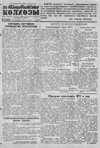 Т Ц ю л е т а р п п в с е х с т р а н , соеди н я й т е с ь ! заШ т е 8ит№& КОЛХОЗЫ О р г а н С е в е р н о г о Н К В К Щ б ; н Р а й с о в е т а д е п у т а т о в т р у д я щ и х с я ______________________ Н о в о с и б и р с к о й о б л а с т и № 11 ( 4 2 6 ) 12 февраля 1941 г . среда Годизд. шестой „ В Л К С М является активным помощником партии во всем государственном и хозяйственном строительстве . К омсомольские организации должны быть н а д е ле активными проводниками партийных директив во в с е х о б л а с т я х социалистического строительства, о с о бенно там, где нет первичных партийных органи- 3 а Ц И И ” ' / Устава У Л У Ч Ш И Т Ь ПАРТИЙНОЕ РУКОВОДСТВО комсомолом Выполняя исторические решен и я X V I I I съезда В К И ( б ) , комсомол значительно у л уч ш ил свою работу. П а всех у ч а с т к а х социалистического строительства комсомольцы показывают образцы т р у д а , борются за дальней шее процветание н а ш е й родины, 8а у кр еп л е н и е ее обороноспособности Комсомольцы н аш его р а й она т а к ж е по-большевистски борются за отличное выполнение всех хозяйс твенно пол и ти ч ес ки х задач, с т о я щ и х перед районом. Комсомольцы колхоза «Луч Света» (с е к р е та р ь тов. Яковлев) с то я т в авангарде подготовки к весеннему севу . Н а всех у ч а с т к а * они показывают ириыер в работе, перевыполняют нормы выработки , проводят массово п о л и т и ч е с к ую работу среди колхоза 7 0ч . Комсомольцам неплохо поьч,Р&ет в работе первичваи п а р т о р г а н и з а ц и я . Н а своих собр а н и я х она часто з аслуш ивае т с екр е тар я первичной ор ганизации В Л К С М , дает ему советы, является контролем над работой ком сомольцев. Недавно создана первичная комсомольская o p i a u i m m u i при Севервой М Т С . Член э той о р г а низации т р а к т о р и с т м о н т а ж н и к т о к Друзслевич н а 2<)0 процентов выполняет дпеваое задание. Редактор стенной газеты К . К у ликов за полтора месяца выпустил 1 0 номеров г а з е ты . По нни ц иа тиве комсомольцев в колхозе «Новый п у т ь » создан к р у ж о к • 1 ротехучебы. Союзная и трудо вая д исциплина в этой органи высоком уровне являются примером на производс т в е , массовую рабтту среди колхозников не проводят. Поэто му веслу чай ио колхоз имени К а - гап ов н ч а постоянно о т с т а е т в проведении хозя йств енво-иолити- че с ких к а м п а н и й . П е р н и ч в а я ор ган и зац ия ВЛКСМ Н А В С Т Р Е Ч У XV I II П А Р Т И Й Н О Й К О Н Ф Е Р Е Н Ц И И Соревнование д в у х М Т С Колл е к ти в наш ей МТС в подготовке к весеннему севу соревну ется с Т а р г а с с к о й М ТС . Рабочие ремонтной м а с т е р с к о й , вкдю чившись в социалистич е ское соревнование имени W i l l конференции В К П ( б ) , взяли н а себя обязательство з акончить ремочт при колхозе «Боеэик» совершен- т р а к т о р н о г о п а р к а к 15 февраля, по оторвала от колхозной ж ч з - в в * * 4 стоит на чее '¡«ожно пр ивести и еще ряд примеров хорошей р<боты ком еомола. Но этим нельзя затенить н и . В ноябре 1 1)4 0 года на своем собрании комсомольцы заслушали о т ч е т председателя к о д \ о з а , но не дали ему н и к а к и х советов в работе, пе помогли н делом. С т е х пор не было проведено пи одного комсомольского собр а н и я . С о ц и н л и с п н е с к о е соревнование здесь не организована , подготовка к севу проводится плохо. Ни ч его нельзя с к а з а т ь хорошего о работе и т а к и х первичных ор I а н ИЗЯЦ1Й В Л К С М , к а к ш>н колхозе «Осоавиахим» и « Г и г а н т » , где комсомольская работа з а п у щ е н а , а з н а ч и т слаба н с о - 1 иы