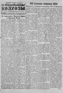 Пролетшрии ternг стран, соединяйтесь! тШммШШсйие КОЛХОЗЫ • р г а н С е в е р н о г о Р К ВКМ(б^ и Р а Л с о в е т а д е п у ю т о в трудящих»» Н о в о с и б и р с к о й о б л а с т и 14(429) ] 23 февраля 1941 г . воскресенье Г о д и а д шесто» Д а здравствует Красная Армия и Красный Флот! О г о д н я н а ш а любимая и сланная К р а с н а я Армия, наш лю б имы й и сланный К р а с н ы й Военно-Морской Флот п р а з д н у ют свою X X I I I годовщину. Кея ге роическая история Кр ас н о й А р и и и , начиная с ее зарож дения в б у р н о м . 1918 году, свидетельствует (Г том, что у н аш ей славной и доблестной а р м и и нет д р у г и х интересов. кроме интересов т р у дового народа. И в атом ее коренное отличие от армий в а ш г п и и с т я ч е с к в х стран. « Н а ш а а р м и я , — говорит т о варищ С т а л и н , — есть едмнет в енная в мире, которая имеет «очувствме м поддержку со отороны рабочих и крестьян. этом ее сила, в атом ее ^ ' ' к р е п о с т ь » . К р а с н у ю Армию — армию освобождения рабочих и к р е с т ь я н — лю б я т и уваж ают не только в н аш ей с тра не : ее лю бят т р у д я щ и е с я всего мира. В п о м н и м , с каким восторгом встречали к р а с н ы х воньов-ое- вободитолей народы Западной У к р а и н ы и З а п а д н о й Белоруссии, П р и б а л т и к и и Б ессарабии! ромные ценности, созданны» в е ками человеческого труда. В о й н а пылает на трех к о н ти н е н т а х : в Европе , А з и и , Африке. Благодаря мудрой с т а л и н с кой внешней политике советс ко г о п р а в и те л ь ст в а С С С Р находится вне войны. Н а ш народ продолжает м и р н ы й , созид а те л ьн ы й труд по построению к о н ч у нистичеекого общества Советское правительство не дало и не дает и м п е ри ал и сти ческим гр у п п и р о в к а м вовлечь С С С Р в войну. Десятки миллионов советс к и х граа.дан, п р о н и к н у т ы е гл у б о ко й любовью к Красной А р м и и , делом п о к а з ы в а ю т велик ую силу морально-политического единства советско го общества. Д а т ь К р а с н о й А р м и и и К р а с н о м у Ф л о I у б о л ь ш е в о о р у ж е н и я и л у ч ш е г о к а ч е с т в а , д о б и т ь с я д а л ь н е й ш е г о р а с ц в е т а с о ц и а л и с т и ч е с к о г о х о з я й с т в а — вот искреннее ж е л а ние всех советских патриотов. П а р т и я больш евико в требует от каждого и) нас, где бы мы XVII Всесоюзная коференция ВКП(б) Угпреннее и вечернее з а с е д а н и я 18 и 19 ф е в р а л я З а 2 3 года своего с ущ е с т - пи работали: на предприя тии , ■оианил К р а с н а я Армия п о б и л и в колхозе, или в у ч р е ж - к р ы л а свои боевые з н а м е н а !д«*н и и, — р а б о т а т ь е щ е л у ч - я с у в я д а с и о й славой. Созданная мсликими г е н и я м и человечества Л е н и н ы м я С та лины м , К р а с н а я А р м и я , з а щ и щ а я з а воевания первой в мире соцв а л и гт а ч е ск о й революции, разб и л а п о л ч ищ а белогвардейцев i * интервентов. И после г р а ж - ш е . е щ е п р о и з в о д и т е л ь н е е , е щ е и н и ц и а т и в н е е . Под личным руководством Народного комиссара обороны С С С Р маршала н Г е р о я Советско го Союза С. К. 1имош енко в а ш и войска , вы п о лн яя у к а з а н и я великого Ст а л и н а , и з у - д.чнекой войны К расная А р ми я ( ч а ю т о п ы т современных войн, ве раз би ла врагов , осмолив-1 в оспитываю тся в д у х е беспре- н и х с я п о с я г а т ь на свящ е вны е J когловкой д и с цип лины , четкой рубеж« соци ал и стическо го го - о р г а н и з а ц и и , упорства, нае- •ударетиа рабочих и крестьян , j тойчиаости, храбрости, н в н ц и - Бои у озера Х а с а н , у ре ки а ти н н о ст и . Войска проход я т I a i x i H -Гол, б