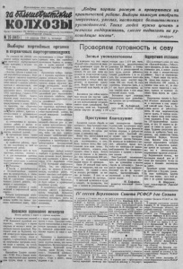 - П р о л е т а р и и всех с т р а н , с о ед и ня йт е сь ! шШтеЯисшЫ КОЛХОЗЫ О р г а н С е в е р н о г о Р К В К П ( б ) и Р а й с о в е т а д е п у т а т о в т р у д я щ и х с я _____________________________ Н о в о с и б и р с к о й о б л а с т и № 2 6 ( 4 4 1 ) I 10 апреля 1941 г . ч е т в е р г »шестой „ К а д р ы партии р а ст ут и проверяют ся на практ ич е ской р а б от е. Вы бо ры помогут отобрать э н е р г и ч ны х , у м е л ы х , н а с т о я щ и х бол ьш еви ст ски х р у к о в о д и т е л е й. Т а к и х л ю д е й нужно ценить и всячески поддерживать, смелее выдвигать на р у к о в о дящ и е п о ст ы а. ( , П Р А В Д А “ ). В ы б о ры п ар ти й ны х органов в первичных п ар то р гани зац и я х Проверяем готовность к севу нн р ой ед Н н п ы о е е рв р и в еш ч ы н с б ы нп о х г р о ып Ц п а К а р р т т и о В й р К н га П ы н ( х б и ) за о ц р и г о а й ч е будут проведены в течение рели и мая. Выборыруководящих оргяи а о п в —большое событие в жизни кяж д в о о й й п п ар ар ти ти й и ной я о в р л г я а ю н т и с з я аци п и ер . ви О ч с н н ы о е партийные организации, которые тесно связаны с массами рабочих, с к щ е р е д е с н с т т е в в ь л н я е о н ни и е и х з и м а н о д т б а е и ч л л , л и и з г п у е ю о н т с ц т и а н и в а л , енн о п ы с о у х в XVIII партийным с'ездом и XVIII конференцией ВКП(б). Задачи, т с и то й я н щ ым и и е пе о р р е г д ани п з е а р ц в и и я ч м ны и, ми ч п е а т р ко сформулированы в уставе ВКП(б), где говорится, что «Первичная п а р н а я организация связы- ваех^ассы рабочих, крестьян и интеллигенции с руководящими органами партии. Ее задачей является: цион а) ная агит р а а ц б и о о т н а ная в и ма о с р са г х анизапо проведению партийных лозувюв и решений, с обеспечением руко- % водства заводской прессой; б) привлечение новых членов в партию и их политическое воспитание; му в и ) л с и од п е о й л с и тв то и т е де р л а у йк в о о му в , сей гор е к г о о практической работе; т с п т . р в и е г п н я ) . н т о и м д г я о о л х я б , ил с в о и ы в з п а х о ц о л и з н я а е х н , м и а я с к с о п л п х р а о ои за п зв х р о е д д и плана, укрепления трудовой дисциплины и развитии монистического соревнования и к о л и ч е с т в а ; д) борьба с расхлябанностью н бесхозяйственным ведением б з д о а е т л х а а , к о н о б л а х п о у з р а л е х у д ч п ш и р е и н п а и о т в и и с я е х д , н к е у в в л н ь а т я с у о р в з н х а о о б ж ы а т щ е ов и ) ы х а х к и ти ус в к л н о о о л в е х и о й з у н ч и а р к с а т о б и в о ; е чи в х, эк с о л н у о мической и политической жизни страны». Выборам предшествуют отчет- ф по-выборпые собрания, которые д ве ол рк ж и ны вы пр п о о й л т н и ени но я д з з а н д а а к ч о , м с п ф р о о р мулированных в уставе ВКП(б), проверки того, как партийные о ни р е инпз в аци ж н из б н о ь рю р т е с ш я ен з и а й прове X д V е I II ю ц В и т с е и с П . с о р ю е п з д н е с о т ри й о о я д щ п ом и а е р т п и в о й ы д н о б г ой р т о о ы вк к и он с о и ф в е п р п а е р д н о а ведения весеннего сева. На от четно-выборных собраниях в х м н е о е у р - з н п и а и о т , с л ь т е М ы в д ы Т е С м д я о те л в р л ж а ь н п б н ы о о о д т с г а т о в м ь т д , о у в м к ч с е и во в е к о го ве к п к с о р е о м л о н обеспечить д в к ы а о л п г ь о о н л с е н е й е л ш н ь и и с е к й ог г о р ос о у ст д х а о р з с я с т о й в ц с е и т н в а н а л о , и г с о ти п п ч л е е а р с е на урожайности. Необходимо заострить т н н и и и й з е а н ц о п и - е п й р о в л н и и а ч т н и ы р ч а е х з с в к е о п р й а т р ы ти ва й н н и ы и х в о н р п и г а м а р а работы, без которой немыслимы ные успехи. Проведение отчетн х о оз в яй