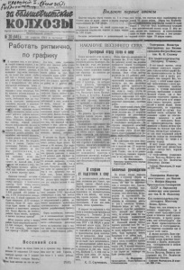 яйтееь! ; ' м м # Ье&г Л стран, спет н чаШтМтёШ КОЛХОЗЫ О р г а н С с н е р н о г о РК В К П ( б ) и Р а й с о в е т а д е п у т а т о в т р у д я щ и х с я ____________________________ Н о в о с и б и р с к о й о б л а с т и № 30 (445 )| 2 4 а п р е л я 1 9 4 1 г . ч е т в е р г I о д и з д шест ой В ы д а ю т первые авансы Молочво -товарная ферма колхоза им. 6 го с ‘ езда Советов пл а н по иадою молока в первом кварта ле пер е выпо лнила на 9 4 0 ли т ро в . До ярк а т . Д рю чина по своей гр уп п е коров перевыполнила ква р та л ьн о е задание по надою молока па 5 3 0 литро в. Согласно постановления о дополнительной о п - ' ла те т р у д а , она п о лучила св ер х выработанных т р у додней 8 0 литров молока. Д о яр к а то в. Курбатов а т а к ж е перевыполнила к в а р т а л ь н о е задание по надою молока и получила с в е р х вы р аб о тан ны х трудодней в с ч е т дополнительной о п ла ты тр у д а 21 литр мол о к а , д о я р к а тов. А л е й н и к о в а за перевыполнение п л а н а по надою молока по л уч и л а в сч ет дополнит е л ь н о й о п ла ты труда 3 9 л и т ро в молока. Р а б о т а т ь ритмично, по графику * В прошлом году в эт о время, во второй половине а п р е л я , в в а шем районе ве сенле полевые р а боты были в полном разгаре . Н нынешнем году весна за п а зды в а ет , на полях еще л е ж и т г лубокий с п е г и п о эт ом у сроки полевы х работ бу д у т особенно с ж а т ы - ми и н а п р яж е н н ы м и . Э т у неблаго п р и я т н ую особенность весны в 1 9 4 1 году надо предвидет ь и серьезно к э то м у г о т о в и т ь с я . Что бы прове сти весенне-полевые р а боты орг ан и зо вап п о , в с ж а т и е с р о к и , необходимо еще раз т щ а тельно проверить всестороннюю готовность колхозов и м а ш и н н о - т р а к т о р н ы х с т а н ц и й к се в у , и о б д е т ь самое серьезное в н и м а - п равильпое , че ткое с о с т а в ление рабоче:о гр аф и ка ве сенних работ. Надо т а к все р а с ч и т а т ь , чтобы, б у к в а л ь н о , к аж д а я т я г л о вая единица, к аж д ы й рабочий человек использовались па полную мощность. И дни полевых работ к а ж д а я бр и г а д а , звено, к а ж д ы й ко л х о зни к должны работать бесперебойно, калг'часовой м еханизм . Граф ик должен то чно в ы п о л н я т ь с я нзо дня в день без ш т у р м о в щи ны и ры вков . Г р а ф и к — это р а с п и с а н и е . Р а б о т а т ь по график у — зн а ч и т работать по т о ч ному р а с п и с а п и ю, т . е. работать т а к , к огда лю бой ко л х о зни к то чно знает, что именно оп должен сделать за к аж ды й день. У нас и м е е т с я все у сло в и я к т о м у , что- б Я ь / о в е с г я врсе н н п е работы в этбм году наиболее о р г а н и зо в а н но, в самые корот кие ср о ки . Посевная площадь колхозов в нынеш нем году с о с т а в л я е т 1 9 . 9 1 0 г е к т а р зерновых и т е х н и ч е с к и х к у л ь т у р . 6 1 6 5 г е к т а р имеет ся заю тр в ле н в о й земли. В районе на полевых работах будет занято 2 . 2 0 8 лошадей, 1 3 6 рабочих волов, 2 . 2 5 5 м е х а н и ч е с к и х лошадо- % н ы х си л . В общей слож нос ти это будет с о с т а в л я т ь 4 5 3 3 т я г л о в ы х еди н и цы . Около 10 проц. этого т я г л а будет з а н я т о на подвозке горючего и см азоч но го м а т е р иа лов. Т а к и м обр а зом , па полевых работах будет з а н я т о , примерно, 4 т ы с я ч и т я г л о в ы х е д и н и ц ? 0 6 ‘ ем поле вы х работ в нашем районе будет сл ед ующ ий : п а х о т а — 1 3 . 7 4 0 г е к та р о в , б о р о н о в а н и е - 1 9 . 9 Ю г е к т а р о в , пос ев зернов ы х к у л ь т у р — 1 8 . 2 0 0 гектаро в. Для т о го , чтобы прои звести об'ем э т и х полевых работ в один девь. п р и м е р но , потребуется 4 2 . 5 9 2 т я г л о в ы х единицы. В пашем р