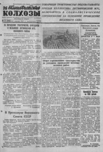 2й П ро л ет а р и и всех стран, соединяйтесь! ТОВАРИЩИ ТРАКТОРИСТЫ! ПОДХВАТЫВАЙТЕ ПРИЗЫВ КОЛЛЕКТИВА ЛИТВИНОВСКОЙ МТС, imteßumMte к £41 Л Х 0 3 Ы ВКЛЮЧАЙТЕСЬ В С О Ц И А Л И С Т И Ч Е С К О Е СОРЕВНОВАНИЕ ЗА УСПЕШНОЕ ПРОВЕДЕНИЕ ВЕСЕННЕГО СЕВА. Орган Северного РК ВКП(б,) и Райсовета депутатов трудящихся Новосибирской области №31 (446) ¡ 2 7 а п р е л я 1 9 4 1 г . в о с к р е с е н ь е ¡ ¿ „ ой ОБ ОБЩРАНЕИИТРАНТОРИСТОВ, БРИГАДРИОВ Реализация билетов 15-й И МЕХАНИКОВ ЛИТ8ИН0ВСК0Й МТС, (МИНСКОГО РАЙОНА Постановление бюро Новосибирского обкома В К Щ б ) и исполнительного комитета областного совета депутатов т р удящ и х ся Бюро обкома ВКП(б) п исполнительный комитет облсатного совета депутатов трудящихся постановляют: 1. Одорбить инициативу коллектива рабочих, специалистов и служащих Литвиновской МТС о социалистическом соревновании за лучшие показатели работы МТС в 1941 году. 2. За перевыполнение плана урожайности по колхозам, обслуживаемым МТС, полное и досорч ное выполнение плана натурой- л < £ перевыполнение плана трактовых работ не менее как на 20 проц., снижение себестоимости тракторных работ против установленной промфинпланом на 8 проц., экономию горючего на 15 проц. установить для МТС: а) первых премий (одну)— автомашина и 5.000 рублей на улучшение культурной работы среди рабочих и служащих МТС. МТС, получившей первую премию, вручается переходящее знамя обкомаВЕП(би) облисполкома; б) пять вторых премий по 5.000 рубелй на улучшение культурной работы среди рабочих и служащих МТС. Для бригадиров тракторных бригад и трактористов устано- в^ГрШремии: V ) бригадирам, выработавшим за сезон по бригаде 1.000 га на 15-сильный трактор—патефон и велосипед; —выработавшим за сезон по бригаде 800 га на 15-сильный трактор—велосипед; Секретарь обкома ВКП(б) Г . П у го в ки н . —выработавшим за сезон по бригаде 700 га на 15 сильный трактор-карманные часы; б) трактористам, выработавшим за сезон на 15-сильный трактор 1.000 га —велосипед; л т . - ч * » ' —выработавшим за сезон на 15-сильный трактор 800 га— патефон; —выработавшим за сезон на 15-спльный трактор 700 га— карманные часы. 3. Бригадиры тракторных бригад и трактористы кроме количественных показателей в своей работе, должны добиться экономи горючего не мене 15 проц. к фактическому расходу 1940 г., экономии средств на полевом ре- мепте тракторов не менее 10 проц. и сдать колхозу производственные полевые работына »хорошо» в »отлично». 4. Обязать райкомы ВКП(б), райисполкомы, райкомы ВЛКСМ, директоров совхозов, МТС и их заместителей по политчасти, партийные организации совхозов, МТС и колхозов, обком союза рабочих МТС и земоргавы обсудить обращение коллектива работников Лвтвиновской МТС и настоящее постановление во всех тракторных бригадах, организовать и возглавить социалистическое соревнование между тракторными бригадами, трактористами, колхозниками п колхозницами за усиешное выполнение ими своих производственных заданий и обязательств в 1941 г. Председатель облисполкома Г. Годовицин. В Президиуме Верховного Совета СССР Указами Президиума Верховного Совета СССР от 23 апреля 1941 года паграждепы: Таджикский Государственный театр онеры п балета за выдающиеся успехи в развитии таджикского оперного и балетного искусства—Орденом Ленина. Таджикская Государственная филармония за выдающиеся успехи в развитии таджикского музыкального искусства—Орденом Тр