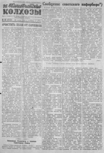 П р о л е т а р и и всех с т р а н , соединяй imech! заШше&шпскЬе Г ’ Г П Г 0 |,КН = " Р С К0»С'' Я Х Ц Г ™ т р у д я щ и х с я № 58 (473)1 28 июня 1941 г . суббота 1 1(f e a ОЧИСТИТЬ ПОЛЯ ОТ СОРНЯКОВ для р а з в и т и я Г ь с к о Хо ^ К ( ? 1 ^ ~ ;/ ! Г ^ о ^ в ы х к Ул ь т >'Р- 5 * е и а чи н ае т к ° - п ы х ко л хо зни к ов н а ^ ншщоАке лоситься озимая р о ж ь , д р у ж н о работает 9 . П р е д с е д а т е л ь к Т х 0. развивается яровая п ш е н и ц а . В за Михалевич прополочные X нынешнем году даже поздние п о - т ы п у с т и л па само тек 1 сены, благодаря обильным о сад к ам ,! Точно т акое ж е по ложение в в ы гл я д я т п р е к р а с н о . О бщее с о ею - соседнем колхозе «Борьба за ,.я яние посевов дает полное основа- ¡ щ е т к у , , где на нр полке раТо- ние п о л у ч и т ь колхозам н а ш е г о , т а е т только 7 человек и н Х раиона в нынешнем году обидь- лоно л и ш ь 15 г а . Не о р га н изо - ный у р о ж а и . Но у р о ж а и самоте- вана прополка в к о л х о з е «В хv n u п р п п и х т н т р г п т м г п л о а . гг. . . ___ » / Сообщение с о в е т с к о г о и н ф о р бю р о *) ком не п р и х о д и т , его н у ж п о з а воевать у п о р н ы м т р у д о м . В борьбе за п о л у че н и е вы соко го у р о ж а я о гр о м н у ю роль игр ает п р о п о л к а , о ч о с т к а полей от сор н я к о в . Передовые ко лхо зы в аше го р а й она полным ходом развернули прополочные работы. В колхозе им. Карла М ар кса у ж е прополоно 1 8 6 г а . На этой работе занято 8 0 челове к. Председатель колхоза тов . Подрядчиков р асс ка зы в а е т, что «к о л х о з н и к и воодушевленные постановлением п а р т и и и п р а в и т е л ь ства о дополнительной оплате т р у да д р у ж н о работают на своих п о л я х , пе ре вы по л няю т нормы выраб о т к и , в к л ад ы в аю т все свои силы на то , чтобы п о л у ч и т ь высокий у р о ж а й . I I э т о т т р у д даром не п р оп а д ае т .В нынеш пем ю д у мы имеем хорош и е виды па у р о ж а й . Даже о зимы е, которые осенью расценивались, к а к пл о х и е , т е перь н ас то л ь ко и справил ись , что и х можно о тн е с т и в к а т е го р и и х ороших посевов» В колхозе «Красногвардеец» (председатель тов . Харитонов ) ежедневно на п р оп о л ке работает Тарский» (председатель Маслаков). Па прополочные работы здесь выходят поздно, кончают рано. Колхозница Прокопова 3 дня без всяких нрнчии не выходила на- рабогу, член колхоза Клещен- ко II. вместо прополочных работ проводит время на рыбалке. Однако к дезорганизаторам трудо- вон дисциплины не принимаются никакие меры. Сорняки—злейший враг культурных растений и с ними "нужно вести упорную борьбу не только на посевах, но и на обочинах дорог, межниках, всюду, где бы они не появились. Руководители колхозов не должны успокаиваться па том, что виды на урожай хорошие и поз тому можпо ослабить работу но уходу за посевами, борьбу за получение высокого урожая. Если сейчас пе будет напряженной работы на прополке, значительная часть урожая будет потерява. Прополка посевов—должна стать общеколхозпым делом. Крайне важно четко, до мелочей организовать работу на прополке, необходимо строго сохранить звенье I I течение 24 и ю н я п р о т и в н и к продолжал р а звив ать н ас т у п л е ние на ш а у л и й с ко м , к а у л а с с к о м , гр о д п е н с к о -в о л к о в и с с к о м , коб- р н н с к о м , Владимир-волынском и бродском н а п р а в л е н и я х , встречая упорное сопротивление в о й с к Красной А р м я н . Все о с та т к и п р о т и в н и к а на шаулийс ком направлении были отбиты с большими для него п о т ер ям и . К о нтр уд а ра м и п а ш и х меха ни з и 