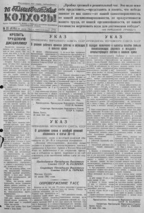 11 ^ е ш р ^ всех стран, соединяйтесь/ заШше^итскке колхозы •*’.•■ ' г а а г . ? - . — „П робил грозный и решительный час. Э т о надо ясно себе представить,— представить и понять, что победа зависит от нас с а м и х— от нашей самоотверж енности , от нашей дисциплинированности, от продуктивности нашего т р у д а , от нашей организованности, от нашей готовности жертвовать всем для достижения п о б е ды “ . ( И З П Е Р Е Д О В О Й „ П Р А В Д Ы 1). КРЕПИТЬ Т Р У Д О В У Ю ДИСЦИПЛИНУ б п о ал й и н Ф и а к н ш и а и , с н т н с а с к ш и у о е б‘ р я о г в е д л р и я м н я а у н . в с о к и О и н п е и ы, р н н а а а з с в г к я о о з е а р л а и г с о п с л н у а а д м т а я р т в с с о т я й в . о ну н М а и о н г е у з с ч а е е т е это с С о о д к о в р е р у о т шительный удар агрессору. Товарищ Молотовв речи по радио22 июня 1941 годасказал: «Эта война навязана нам не г ск ер и м м а и нск р и а м боч н и а м р и о , дом к , ре н ст е ьян ге а р м м и ан и и р н ы т х елли м г ы енци х е о й р , ош ст о рада п н о и н я има к е о м т , оа кликой кровожадных фашистских п ш р и а х ви ф те р л а е н й цуз Г о е в р , ма ч н е и х и о , в, пор п а о б л о я т к и о в в , с н е и р ю б , ов, Го Н л о л р ан ве д г и и ю ю , , Г Б р е е л ц ь и г ю ию, и д Д ру а - ие народы». д м е а т н Н с а к с с м а т я е а т л е ф н а г а ш ро и з с с н т ы л ск и й а ц я а час м , з р к е а о м з г л ь д и а . г б е М р у ы твердо уверены в своей победе, потому что наше дело правое. Но чтобы эта победа досталась с ж ци н н п о а л и и м к н а е у н к ь и ш н е о и й р к г з о а а г н т д р и а а з т о о в й а к н р к н е р о п о с и в т т и ь ь , , н р д у и а сботать на оборону и для защиты родины не покладая рук. Сегодня мы публикуем Указ Президиума Верховного Совета С м ен С е н н С о и Р е р в « а О р б е о м ч р и я е х » ж . и и ме сл р у а ж бо а ч щ е и го х в вр в е о рич В еск э о т е ом зн У ач к е а н з и е е , , им д е а ю н щ о ем п и р с а т в о о д с п п и р о р и р е я к т т т а и о , й рам п с р е и о л м ь р ы с у к к ш о о л г в е о о н д н и о т х с е т о л и з я я , м йс п т т р р в е а а д н и т ш о е р н г и ов я ли Со у в с н т а а р н к а о в м л а иват С ь ою с за ра С зр С е Р , как для всех рабочих и служа- д р н д е а ы и л б е х ь о н ч с и ы п в х р х е е р и д ц х п у е р р с х л о о и в ч у я , н ж т ы и у а и ч щ е а , и с р т х т а к а б о к о в ты и об и я п д з г р л а р о т я у е до п л о л п ь т жительностью от 1до 3 час. в день. Родина требует от всех граж дан, чтобы они почувствовали всю ответственность за судьбу социалистического государства честно и самоотверженно, не считаясь с временем, работали на предприятиях, учреждениях, в колхозах и жертвовали бы всем для достижения победы. рио Т д от н к а т п о ря п ж ы е т н а н ет о с й я се о й б ч с а т с а , но в вк п и е , нарушать трудовую дисциплину, вносить в наши ряды панику, тот будет рассматриваться как предатель родины. Сейчас, как никогда, каждое предприятие, колхоз, учреждение д п н о о и л л я ж н . н я ы т Э ь то р г п о а р б о о т и т р з а е в т б о ь у д е с т р тв и е о т н т м н и ы ч п е н а о с , з р а в о д ы а д ина, коммунистическая партия, правительство. гией Р — або д т о а л т г ь с к у а д ж е д с о я г т о ере г н р н а о ж й дан эн и е н р а великой страны социализма. В этом сейчас залог в скорейшей победе над врагом. Наше дело правое. Враг будет сметен с лица земли. У К А З П Р Е З И Д И У М А В Е Р Х О В Н О Г О С О В Е Т А С С С Р О режиме рабочего времени рзбочих и служащих в военное время В целях обеспечения выполнения производственных заданий, св я зан ных с нуждами военного врем