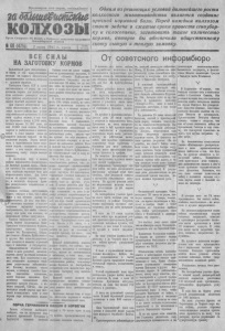 П р о л е т а р и и вс ех с т р а н , со е д и н я й т е с ь ! 2аШтиШетШ& КОЛХОЗЫ О р г а н С е в е р н о г о Р К ВКП(б> и Р а й с о в е т а д е п у т а т о в т р у д я щ и х с я _______________ Н о в о с и б и р с к о й о б л ас т и 1 6 0 ( 4 7 5 ) 1 2 июля 1941 г . среда | к?коп. О дн им из р е ш а ю щ и х у с л о в и й дальнейшего р о ст а к о л х о з н о г о животноводства является создание прочной кормовой базы. Перед каждым к о л х о з о м стоит задача в сжатые сроки провести с ен о у б о р к у и силосование, заготовить такое количество кормов, которое бы обеспечило общественному с к от у сыт ую и т еп л ую зимовку. В С Е С И Л Ы НА ЗАГОТОВКУ КОРМОВ го с Д к а о л т ь а нейш и ий его рост пр о о б д щ ук е т ст и в в е н н о н с о ти зависит от полного обеспечения животноводства грубыми, сочными н другими кормами. Совнарком Союза ССР в своем л с п к т и о у в ч с ю а т е а н н и с к о и ю о в с л л т х е е к о м н о з и р у о м и в м » ов е < р 0 р о д а п з м л р в я и е е р я р ж а т н х и и у и в л от п п н о о ш ов и с у о о р в д з о е данию прочной кормовойбазы. м хо а з м а Д и х ля об н щ а п ш о ес д е т п г в о о е ю н р н а о о й г б о о е н с а п ск е н ч о а е т м н а ия в в э к к о то о л м р годунеобходимо заготовить 57.610 л т е он с н тра г х р о у в б о ы г х о ф ко о р нд м а ов 4 , .2 в 8 т 0 ом то ч н и н с , сочных кормов 13.100 тонн, из них 11500 тонн силоса. Райком с п т а в р и т и ии с и э р т а и й м исп п о л л а к н о о м м в с д о о от в в ле ет д о каждого колхоза задание е к за з о н м п а и л я ен п и з ю ад ко а к л ч о х а р о — м зн о в и в ы к . п а о м л и П н е и р с т т е ь о д ит эт п к и с о о е л р з н х ь а о а дания и тем самым обеспечить колхозному скоту сытую теплую зимовку. В нынешнем году в пашем р н ц о а о йо б и н о м е га е т ю н ы т а й с б я лю у в р д с о а е ж ет а в с й о я зм и т о с р к ж а л н в ю о . ч ст и и т Н е с а л о л ь з и дать прочную кормовую базу для общественного скота. Для этого только ие нужно терять н т си о а л , м ос р а о а и з н в а а н е ч р и и т е ы н . а в т ат ь ь ш се и н р о о к к о и ш м ен в и ф р е е р м он е и Однако сигналы, поступающие с мест, говорят о том, чтос этим ш б о д л е й л а о г п м о о п л о у о л в у и п ч л а н и с о. к о Д б ол о ст х о о с з и и о т в х д и п а о л се р ек д б ь о о и л н с ь - е нолкомов заражены вредвымп настроениями, что якобы «косить траву еще рано, опа молодая, ее невозможно сейчас подсушвть». Т н р о о с Т и ти а ц к , к и о б г м о о и ле с е е н т л а ь с и т п с р р п о е о е д л н с к е и о д я м а м т а и ел Ф , ь ед в о Н р ч о о в а в с о , - т председатели колхозов Сурков ( д к о о в л ( х к о о з лх и оз м. «П К а а м г я а т н ь ов К и у ч й а б ), ыш С е в в и а р » и ) н и вр ы е д д е ру т и е г н и д е к е . о н л ц Э х и т о и и зам и а а п н т о п и с г я о т г с о у с о д у г а д р р о а с м р т с н в т ы е в н у й . в ч о е д н с и И т е с в к а л в ю и д ч м е и е л т е е т ел р ь з а н а з г о в о и т т о и в о я к г а ро в м ж и н и т о а в е м от и з н н н о а м м д н а и а о ю х . г т о в с П и е о р т п э а а а т м з . о л и м и н П ч у о р н в и ым з н а ж и г е и о д в т о о о с т з в т н а а к б ы т а о к е л е ев в а с н к т о р и р я а таких к ш о о р е мов, в ко к л о и т ч о е р с ы тв х о имее в т и ся там б в ол п ь о в, имеет большое значение. При заготовке витаминного сена растения следует убирать лодом возрасте. Сейчас, как в м ра о з т н о а в с к т и уп в и и л та т м а и к н о н й ог п о ери с о е д на для и за э г т о от п ст е ь р ю ио . д надо использовать полноПОРЧА ГЕРМАНСКОГО Газета «Свенска дагбладет» с в Х о е а о ж у б г с щ е к с а и у е х т н , д п ч р т о о ви н н н а а ц л и о н й ж а е с н ел Р е у 