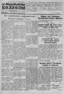 З А Б О Л Ь Ш Е В И С Т С К И Е К О Л Х О З Ы 6 4 (4 7 9) Все для фронта! Все для победы! Б ольш е п родукт ов д л я К р а с н о й А р м и и Н а - д н я х коллектив работн ико в Б и а з и некого маслозавода собралс я для т о го , чтобы п р о с л у ш а т ь т е к с т речи Председателя Г о с у д а р ст в ен н о г о К о м и т е т а Оборони тов. С т а л и н а . К а ж д ы й из п р и с у т с т в у ю щ и х с г л убоч айш и м в н и м а н и е м п р о с л у ш а л т е к с т речи. В ы с т у п и в ш и й мастер ц е х а то в . К а с ь я н о в за я в и л : <Мы уверены , что н а ш а героиче ск ая К р а е в а я А р м и я , А в и а ц и я , Военно-Морской флот вдребезги разобьют подлого в р а г а , р аздавя т ф а ш и с т с к у ю г а д и н у . М ногие из н а ш и х т о в а р и щей у ш л и на фровт з а щ и щ а т ь р о д н ую землю . М ы , о с т а в ш и е с я в т ы л у , должны с ч и т а т ь се бя т а к ж е м о би л изо в а нны м и , ра ботать с у д е се те р е ч но й ан ер гией , тем с а м ы м мы поможем Красной А р м я н бы с т р е е р а з г р о м и т ь подлого в р а г а . Я обязуюсь досрочно вы полн ит ь производст венную п р о г р а м м у , дать Красной А р м и и вы со кокаче ствен ные п р о д у к т ы , а если потребуется в иойду на фроит, буду бесиощадво г р о м и т ь ф аш и с т с к и х варваров, з а щ и щ а т ь нашу честь, свободу». — Я беру обя за тел ьст во работа ть за д в о и х ,— з а я в и л д а б о р а в т завода тов. Глебов, — пом им о своей основвой работы буду т а к же выполнять х о з я й с т в ен н ую работу. Затем вы ст уп али т . т . Ч а б ы к и и , Р ом ан ен ко , Гр игорьев и др. Весь коллекти в завода взял па себя обязательство работать и с к л ю ч и тельно нап р яж ен н о , п о к а з ы в а т ь вы со кую производительность т р у да, всеми енх&мн со д ей ст в о в а ть победе Красной А р м и и . И. С е в е р и н , управляющий р ай м а с л о п р о - ма. Б у д ь т е в бою первыми (П и с ь м о т оварищам в Д е й с т в у ю щ у ю А р м и ю от членов сельхо зарт ели ы.и. 6-го с'езда Советов) Дорогие н а ш и б р а ть я , с ы н о в ь я , м у ж ь я о т о в а р и щ а ! Суровы е д н и п е р е ж и в а е т п а ш а Р о д и н а . Г е р м а н о - ф а ш и с т с к и е варвары н а п а д и на н а ш у ц в е т у щ у ю р о д и н у . П р е зр ен ны е ба нд и ты , п р о к л я ты е р а з б о й н и к и , они х о т я т поработить с о в е т с к и х людей, надеть на н а с я р м о кап ит али с ти ч е ско г о раб ства, о т в и т ь у нае бога тство, радость, с ч а с т ь е . Но никогда э то м у не бы в а т ь ! Н и ко гд а ие о с ущ е с т в и т с я к о в а р в м е зам ыслы подлых ба нди т о в . Н а ш а героиче ская К р а с н а я А р м и я беспощадно бьет в р а г а я она его у н и ч т о ж и т ок ончательно. В е с ь м н о г о м и л л и о нн ы й со в е т с к и й народ поднялся на з а щ и т у своей любимой родины. Н а ш е дело пра вое . В р а г будет разбит, у в п ч т о ж е н . Недавно мы проводили вае в К р а с н у ю А рм ию . Мы даем вам т а кой н а к а з — будьте достойными г е р о я м и , бейте беспощадно подл ы х разбойников , п осме вш и х н а р у ш и т ь св ящ ен ны е рубежи н а ш е й с т р а н ы . М м , ос тавшиес я в т ы л у , т а к ж е сч итаем себя мобилизованными на трудовом фронте. Мы будем р а ботать т а к , чтобы бо га ты й урож а й был убран во-время и без поте рь. У шедших на фронт замен яю т ж е нщ ины . Сейч ас все колхозники от мала до в елика т р у д я т с я на п о л я х . В . Ло сева на прополочных работах в ы р а б а ты вает в день 3 нормы, т . т . Х о р к и н а , Кравченко на сенокосе в ы по лн яю т норму на 125-130 п р о ц . , т . т . Д е ы ч в х в в а , А л е ш к и н а еж едневно вы к аш иваю т по 0,78 га вместо 0,60 по норме. Е с л и бу дет надо, то все мы