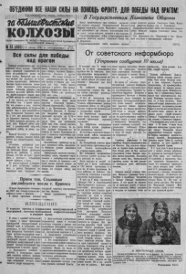 ОБ'ЕДИНИМ ВСЕ НАШИ СИЛЫ НА ПОМОЩЬ ФРОНТУ, ДЛЯ ПОБЕДЫ НАД ВРАГОМ! П р о л е т а р и и всех с т р а н , соединяйтесь: П П ТУ / ~ \ ^ ^ _ — £> I о с у д а р с т в е н н о м К о м и т е т е Обороны за Ш т ёФит мие КОЛХОЗЫ Орган С е в е р н о г о РК ВКП(б) и Р а й с о в е т а д е п у т а т о в т р у д я щ и х с я Н о в о с и б и р с к о й о б л а с т и I 6 5 ( 4 8 0 ) 1 13 июля 1941 г . в о ск р е с ен ь е | Все силы для победы над врагом Грозныеисторические два переживает наша родина. Подыл й враг, кровавый германский фашизм по-разбойничьи напал на нашу страну. Коварный враг думал застать нас врасплох, во он глубокопросчитался. Доблестная Красная Армия встретила непрошенного гостя сокрушительным ударом. Отборные дивизии германского фашизма разбиты. Сотни тысяч немецких солдат нашли себе могилу на полесражения. В эти грозные дни Отечествен- ной войны тыл и фронт едины. Тог кто остался в тылу считает себя мобилизованным на трудовом фронте. Как и весь советский народ, трудящиеся Северного района в эти дни показывают образцы трудового героизма. Ушедших на фронт заменили женщины, старики, дети. Каждый сейчас работает с удесятеренной энергией, выполняет работу за двоих, тро- ■х. Каждый заявляет о готовности работать столько, сколько потребуется для удовлетворения нужд армии. 60-летняя колхозница сельхозартели им. 6-го с'езда Советов Алешкина Елена Архиповна раньше не работала, а сейчас заявила, что она не будет сидеть дома, а наравне с остальными желает работать в поле. Не только взрослые и старики, но и дети поб- оевому включились в работу. Ежедневно на колхозные поля выезжают все!врагом, Цена 10 коп. новые и новые бригады школьников. Учащиеся колхоза«Советская Сибриь» Сергеева, Блинова, Матвеева, Яковлева и другие заявили: «Мы также считаем себя мобилизованными на трудовом фронте и отдадми все свои силы для того, чтобы помочь взрослым в работе». Они организовали специальное звено из 16 человек. Ребята уже заготовили 250 цнт. сена. С величайшим энтузиазмом работают на своих полях члены колхозов «Севреный Тартасс», «Нацмен пролетарий», «Луч-света» и др. Комсомольцы колхоза «Ударник» Цируквн и Пушкарев ежедневно на сенокосе выкашивают вручную по 0 , 7 0 — 0,80 га вместо 0,50 га по норме. Здесь уже заготовлено 2500 цнт. сена, хорошо подготовились к уборке урожая, на работу выходят буквально все от старого до малого. Колхозники готовы с меньшим количеством людей убрать урожай во время п без потерь. Фашистскому грабителю не видать советского хлеба, взрощенно- го честными руками колхозного крестьянства. Своеверменно закончим сенокос, заготовку паров, образцовоподготовимся к хлебоуброчной кампании и отлично ее проведем—это будет нашим грозным ударом но фашистским разбойникам, этим самым мы ускорим победу над Вниуд наметившихся трех основных направлении военных операций Государственный Комитет Оборони предписал ставке Верховного командования организовать три главных командования отпора врагу: северо-западное, западное и юго-западное. Главнокомандующим войкс северо-западного направления назначен маршал Советского Союза тов. К. Ворошилов. Главнокомандующим войск занадного направления назначен маршал Советского Союза, Народный комиссар оборони тов. С. Тимошенко. Главнокомандующим войск юго-заапдногонаправления назначен маршал СоветскогоСоюза тов. С. Буденный. Тов. Ворошилотво, н. Тимошенко и тов. Буденн