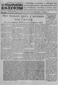 П р о л ет а р и и всех стран, соединяйтесь! заШ шеШ тснке К О Л Х О ЗЫ О р г а н С е в е р н о г о Р К В К П ( б ) и Р а й с о н е т а д е п у т а т о в Н о в о с и б и р с к о й о б л а с т и !И 70 (4851) 20 июля 1941 г. суб бота т р у д я щ и х с я I Ц е н а 10 к о п . Работницы , колхозницы и служащие! Еще у в е р е н н е е о в л а д е в а й т е мужскими профессиями, еще решительнее з а м е н я й т е у станков, т р а к торов, на у ч а ст к а х к у л ь т у р ы и и ск ус ст ва тех, кто у ш е л на п е р е д о вы е позиции. Нет больше врага у женщин, чем Г и т л е р К о в сем женщинам С С С Р , ко в с ем женщинам м и р а ! Ж е нщ и н ы Советского Союза! Ж е нщ и н ы всего ми ра, матери, сестры и ж о п ы ! Вождь Советск ого Союза и д р у г всего человечества Сталин п р и з вал народы наш ей ]юдины к разгрому Г и тл ер а и его п о л ч ищ , вероломно н а п а в ш и х на п а ш у с т р а н у . Нет большего врага у ж е н щ и н , чем Г и тл ер , чем фашизм. Это Ги т л е р , это фашизм п р и нес неисчислимые страдания ж е н щинам Е в р о п ы : он отнял у п и х сы новей , м у ж е й и братьей, он истребляет и х во имя своего постыдно го и кровавого бреда. Это Г и т л е р , это фашизм отбирает у ж е н щ и н все п рава , л и шает ее человеческого достоинства, п р е в р а щ а е т в рабыню , в домашнее ж и вотное . Чудовищные н адру гател ьотва совершают г и т л е ровцы над ж е нщ и н а м и о к к у п и р о в а н н ы х стр а н Евр о пы : н а сильно о т п р а в л я ю т матерой и ж е н в солдатск ие пу бли чные дома, под уг розой смерти отдают и х во власть любого фаш истского офицера. Это Г и т л е р , это фашизм обрек на голод и вы мирание детей Польш и , Ф р а н ц и и , Г р е ц и и , Югославии, Б е л ь г и и , Но р ве ги и . Гитлер отнял у детей детство , у матерей— мат е р и н с т в о , у с т а р и к о в — з а с л у ж е н ный имя п о к о й . Кровью отцов, слезами детей и матерей п р о п и т а н разбойничий п у т ь Гитлера. Теперь Ги тл ер напал на н а ш у родину, на с т р а н у , где детство поистине п р е к р а с н о , материнство счастливо и ж е н щ и н а свободна. Но пе о т н я ть Ги т л ер у наш ей свободы и радости! Священной ненавистью встретил весь советск и й народ наглое фашистско е нашествие. С первого дпя войны миллионы с о ве т с ки х т р у ж е н и ц па н о л я х , в п р е д п р и я т и я х заменили воинов, уш е дш и х ср а ж а ть с я . Миллионы ж е н щ и н готовы по пе рвому п р и к а з у командования и т т н иа фронт кр а сным и сестрами. П ответ па призыв своего у ч и теля и д р у г а Сталина советские ж е н щ и н ы должны еще ож е сточ е н нее бороться за победу, за создание бесстрашного боевого тыла . Ж е н щ и н ы , г р а ж д а н к и в е л и к о й с т р а н ы , м а т е р и , ж е ны и с е с т р ы ! Мы зна ем , что победа будет неле гкой . Т а к п у с т ь ж е сердце ка ждой из нас с т а н е т неисся каемым источником м у ж е с т в а . П у с ть к а ж д а я из нас, пров о ж а я на битвы любимого сы на, м у ж а или брата, вселяет в него уверенность и сп о ко й стви е . П у с т ь будет им материнским благословением наша ненавис ть к в р а г у , наш а воля защ ищ а ть родную землю до последней к а п л и кр о ви . П у с т ь твердо знают он и , ч т о мы с п о к о й п ы , бодры и н е утом им ы в тр уде т а к ж е , к а к и они в сраж е н и я х . Д о м а ш н и е х о з я й к и ! Ваши заботливые р у к и н у ж н ы сейчас производству. Идите же на фабр и к и и заводы. Р а б о т н и ц ы , к о л х о з н и ц ы и с л у ж а щ и е ! Еще увереннее овладевайте м у ж с к и м и профессия м и , еще решительнее заменяйте у с т а н к о в , т р а к т о р о в , на у ч а с т к а х к у л ь т у р 