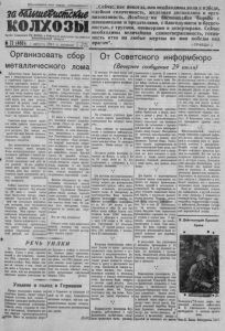 Пр о л ет а р и и всех стран, соединяйтесь! заШше&тШа КОЛХОЗЫ „Сейча с , как никогда, нам необходимы воля к победе, идейная сплоченность, железная дисциплина и организованность. Н еобх одим а беспощадная бо р ьб а с изменниками и предателями, с благодушием и беспеч н о с т ью , с трусами, паникерами и дезертирами. Сейчас орган северного рк вкп№нР.рсоаег, необходимы величайшая сам о о тверж ен н о с т ь , готов- _______________ новосибирской0 обяасгип^тат01*труляа1ихся ность итти на любые жертвы во имя победы над № 73 ( 4 8 8 ) 1 1 августа 1941 г . пятница Це на 10 коп. врагом ( « П Р А В Д А » ) О р га н и з о в а т ь сбор м еталлическо го лома т м и с и к г и и Д е м о р с и б о л й е б с в с т е а т в с р н о п в ы м р а е е р д б а е в о м л о р ь и и ю н н , ы ы тс м п я а К п м с р о а у с с ж я н т е ф о с й а т ш в в А о р и м р а с г ж т у и ды с н м о а к ш р д у н ш е от и п м т о е р р л а ь с п н т о ы е д т е лом и у у д б а у в р д р ы е а . т гу С . р к а Н а с о с з к о и ву й в н е а л р и о к д о , го к С а т к али о н д а и ” н весь че со л в о е в т е к, п м о о д й ня р л о с д я ины на . Т за о щ , и к т о у го св р о о е ди й на люб н и о призвала на передовые позиции, с мужеством бойца трудятся в тылу—на трудовом фронте. Советские люди хорошо знают, что война требует колоссального напряжения сил, мобилизации всех ресурсов. Для побеыд над / рагом пам надо больше винтовок, пулеметов, орудий, патронов, снарядов, самолетов. бует Д с л я я м п е р т о а и л з л во , дст м ва ног о о руж м и е я та т л р л е а . ш р Н у а л з ш е к н о а н й о , м ст е ь с т о а в л р е л а т б у с о р к т г и а и е е ч т ес с к м а п е я т о а л л но л п й у р р н о г м а и г ы с р ч е е д стью род в и ы н п ой ол . няю Н т о с м в ы ой д д о о л л ж г ны пе и можем дать армии еще больше п м р о с е л ы т ь а , з л у л е а м , п е о н с в а л с ш и ем и ес к в т а н н к у о тре с н л н о е и р д е г у а е н т р и е з с у у е и м с сбор металлома. м вс а е . м С е е 2 с й 6 т ч н а о с ию п со р л в о я е в т о в с д к я и т е п с а б п ш о а р т е р й м и е о т т а ы л га л з п о е о т е было напечатано письмо мольцев Тартасской МТС, к в омс к о о - / ц о е р в о , м м о о н л и оде п ж р ь и , зы в в с а е л х и т к р о у м д с я о щ м и ол х ь с я Северного райопа начать сбор металлома. Этот призыв горячо подхвачен комсомольцами ч н а а л . ся П . ох З о а д да з ч а а с з б ак о л р ю м ч е а т е а т л с л я ом в а р т а о й н м о а , чтобы по-боевому организовать эту работу. Райком комсомола должен оперативно руководить этой работой, все трудящиеся раиона должны принять самое л ак ом ти а Н в . а н д ое о п у о ч м а н с и т т и ь е , в чт с о бо ч ре ем мет б а о л л ьше у нас будет металла, тем сильнее, сокрушительнее будет у ж д д а ы р й п г о ра ф ж а д ш ан и и ст н ско н й аше б й анде р . од I: К и а н ы должен отчетливо представить себе, что помогая сбору лома, он помогает побеед над врагом» («Правда»), 27 июля в «Советской ч р ва и и» м з , а п в о о м да еще « н Т о руд п » ись к м о о все к м олле р С кт и а и б б и о раоотницам, служащим, к к ц а о а м л м х , о Н зн о ш в и о к к с о а и л м б ь , и н р и к с к о к а о м й все о м б и ла к с д о т м о и м с , о о к м хо о з к л я о ь й тормо они пишут: «Надо помнить, ч н к т и о о , го с к м н а е ж а т р д а я ы л д л й ы о , ма т к — а и н л э о к т г о и р . а н м Д о м а в д ы и с е м о п б у р ш а н н а каз доолестным воинам Красной Армии—не жалейте металла, о ч т б е с р с к к у и и ш х й ьте ш ва к с р в м в а е а л р р т о н о в а н . ос г н А о ы л й овы м м ы е ф та а л ш б л у и и д с е м п н о и с я ы , лат с ь кол ва ь м ко ст п о о л т 