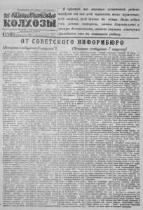 П р о л ет а р и и всех стран , соединяйтесь! ! ^ Суровый ЧАС ВОвННЫХ НСПЫШаний родиНА требует от н а с всей верност и , всего мужество, всей э н е р г и и , всей жизни до к о н ц а. Л и ш ь забыв свои лич ны е интересы, л и ч н о е бл а го п о л уч и е и л и ч н у ю безопАсность, может сказать советский граж данин , что он защищает р о д и н у . яаШтеёитМ# л х о зы О р ган С е в е р н о г о РК В К П (б ; и Райсовета депутатов тр у д ящ и хс я ______ _____ Но в ос и б и р с к о й области 3 № 11 ( 4 9 2 ) 1 1 0 августа 1941 г . в оскр есен ье Цена 10 коп. ОТ С О В Е Т С К О Г О ИНФОРМБЮРО ( В еч ер н е е сообщ ение 6 августа *) В течение С августа наши л т в и е о н в й н с с к к и а о к м ом в , ел б и п ел а оц к у е е п р к о к с р о г н в о ы с л к е ь о с м к б о ои м н , а с пр с п а м р в о о л т е а н . и Н я а х ос и т э а с л т ь о н н ы ск х ом н у а ч п а р с а т в к л е ен ф и р я он х и участках фронта крупных боевых д ц е и й я ст н ви ан й ос н и с ла ве у л д о а с р ь ы . Н п а о ш м а ото а м в е и х а - частям и артиллерии противника на различных участках фронта. м За ецк 5 их ав с г а у м с о т л а ет у о н в и . чт Н о а ж ш е и но п 1 о 4 те н ри е 7 самолетов. ния Бойцы пол и ковн ко и м ка андиры Тиш с и ое н д с и ко н г е о в р и а з з и гр й ом « и С ли С», од н н о у ся и щ з у н ю емец н к а и з х ва д н и и е г « е р Т м о о О м д а е н н е п к к э р о о т и т п о б о й ф ы р е ы г т и и е т д и л и е в п р и о о н з в д и р о с о о в к б н о о н » й й о . с д т н П и и е в е м и р з е е р и ц д а и к а з о . й л го ле б р ы ни ст ск р о о м на ч щ ас у т п и ал т и ов. Т у и б ш ег и а н в с ш к у о ю к ш о и л н о , н п н е у реп и ол у н н е и н ч н то ы ж х ил ф и аш м и н с о т г с о ким м и а с а с з л о и т а л а и в д к . н а а о т Н а з м о о а и т к б у о т о н и р о ч ч н и о о н л ф й е а н и с ф н ц ь ы а ер ш « м а п и м с с д и и т а . х с н к и о н Т ч й ы а е к с м д к и а б в я д е и » и с л ви а зи 2 я .50 « 0 мер со тв лд а а я т г и оло о в ф а и » церо п в оте у р б я и - ' тыми и ранеными. Огнем пашей а к ж р о е т н в и о л и ле 3 б р 0 р и о и н н е е м м и а е ш ц м и к и н и н , х ое 8 мт 0 л о е в гк м у и о н х т и о ч ц т т и а о к н лов, около 500 автоматов, 90 легких и тяжелых пулеметов и 45 минометов. * » « На севсрпом фронте паша П-ская часть разгромила около м ме е ц ст к е и ч х ка фа К ш . и б с о т л о ь в ш . ую Вра г г руп п п о у тер н я е л убитыми 00 солдат и 12 офице- ( В еч ернее сообщ ение 7 августа) дивизии па восточный фронт ко-1 ров. Красноармейцы захватили 3 п ц м р и а о к ш т л и и о н в в о . , т п а 1 н е 0 с к к о 0 о в л ы ь в х к ел о о о р с п у и д у п л и е е я д м , о е в т 4 , о 0 5 в, м а р о в т т а о о з личное снаряжение и ценные оперативные документы. Во-время боя за городД. группа б ц га о ем йц и о И в у в с а в т н о а о н в г о ы л в а м и в л е а за н ш а с ла в к ы р в г а о с т д н ы н о о л а й р в м р п е а о й зиции пулемет. Нод обстрел ну-' лемета попадала улица города, но которой отступали пемцы. М то е ж т е к н и о м 8 о 0 гн ф ем аш с и м ст е о л в ь , чак у о б в ега у в н ш и и ч х с в ки п С х ан п и в е к о р е й в ск ы о . х т на д с н т е у й паю от щ еч и е х ств с е о н в н е о т й з в ш р а е о и н к й с с т т н к о о и р ы в й а » у с М о п п т е Т р о ш С д я н д о к т о о « д м в И е . а с й н т с р I д т I е о I в б в . у и а е н т в т и е л е п и м а р р а ф й т д о и а и не Р. Отряд уже уничтожил 12 пе- мецких обозов с продовольствием, 22 автоцистерны с горючим, вывел м на а л н о до в ван т и о е т ж со е ве д т е ск н о ь й . Р ч а а н с о ти утр у о з м л ш е и й й тен гр ан у т ппу Сав к е р л а ь с е н в о , арм в е о й зг ц л е а в в -р л а я з в - к в о е г д о чи е к ф о р в е , йт з о а р х а вати