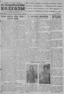 i 2 З А Б О Л Ь Ш Е В И С Т С К И Е К О Л Х О З Ы 91 (506) С большим патриотическим подъемом проходит в нашем районе с б о р теплой одежды для Красной Армии Колхозники помогают армии Как только стало известно о том, что начался сбор теплой зимней одежды для Красной Армии, и колхозе «Нацмен Пролетарий» состоялся митинг, посвященный этому вопросу. Выступивший па митинге колхозник Степанов заявил: Те вещи, которые мы посылаем для бойцов, хорошо нм там пригодятся. Надо все отдать для армия, ничего но жалеть. Я вот недавно приобрел хорошие ватные брюки, но здесь без них я обойдусь. Я с радостью отдаю их Армии. II так должен сделать каждый. Колхозники все, как одпп, решили дать Красной Армии все необходимое, обеспечить славных советских воинов теплой одеждой. Буквально за полчаса собрнао 14 овчин, 0 кож, 3,5 кг. шерсти, 5 пар теплых поскон, 10 пар перчаток, 2 новых брюк. Сбор теплых вещей для армии продолжается. Колхозники решили удвоить, утроить темпы хлебоуборки, быстрей рассчитаться с государством но всем обязательным платежам. Д Литвиненко. ®— — О б е с п е ч и м Красную А р м ию всем необходимым С большой активностью вчера прошло собрание членов колхоза им. Тельмапа, на котоорм обсуждался вопрос о сборе пещей для бойцов Красной Армии, сражающихся против озверелых фашистских банд. Колхозпикн решили принять самое активное участие в сборе вещей для Красной Армии. Тут жо была произведена запись вещей, сдаваемых для фронта. Председатель колхоза тов. Нилова решила сдать для Красной Армии теплую фуфайку, брюки, пару белья. Колхозники тт. Нопомарсв сдает валепкн, шубу, шапку, Горбылей—валонкн, 2 кгр. Шерсти, варежки, Копзалев—фуфайку, брюки. Мпогио колхозники сдают овчины, шерсть, варежки, ноекп. — Пусть пашп доблестные воины—, заявили единодушно колхозники—, беспощадно громят фашистов, мы полностью и всем необходимым снабдим армию, отдадим все своисилы фронту, 'быстрей уберем урожай, досрочно рассчитаемся с государством по хлебосдаче. К. Климов. П о м о щ ь А рм ии Коллектив работников Северного отделения Госбанка решил приобрести для бойцов Красной Армии 7 теплых фуфаек, 7 ватных брюк, носкн, шарф, перчатки. Работники типографии решили послать для бойцов Красной Арми 4 фуфайки, 3 брюк, валенки, 5 шапок, 4 шарфа, 5 пар носков, 4 пары перчаток, теплую свитру. Снабдим бойцов теплой одеждой О сентября коллектив рабо-т пиков. райпотребсоюза собрался на митинг, посвященный организации сбора для бойцво Красной Армия теплых вещей. Присутствовало 11 человек. Выступивший па митинге зав. заготконторы тов. Старков заявил: Псе наши чувства, мысли, стремления, дела посвя- 1 щспм одному—помочь Красной Армии быстрее разгромить подлого враг#. Наш народ готов от- , дать все делу победы. Сейчас проводится сбор теплых вещей, белья для красных воинов. Дело чести каждого из нас принять в этом важном мероприятии активное участие. Я решил полностью одеть одпого б о й ц а. Даю теплую фуфайку, брюки, валенки, пару белья, шапку и призыпаюпоследовать поему примеру всех остальных товарищей. Предложение тов. Старкова было встречено с огромным одобрением. На митипгс было принято решение, что каждый член коллектива даст для Красной Армии фуфайку, брюки, валенки, шапку, но парс белья. Я Кузьменко. Все для фронта Коллектив работников райисполкома решил приобрести для 15 бойцов фуфайки, брюки, валенки, шапки, 