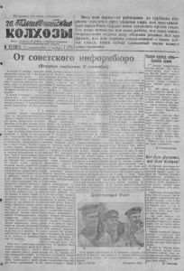 « П р олетар и и всех ст р а н, со единяйтесь! зв Ште$?шпснке колхозы Орган С е в е р н о г о РК ВКП(б) и Р а й сов ет а депутатов тр у д ящ и хс я Новосибир ской области i 92(507), 13 сентября 1941 г . с у б бо т а i uV^ón. В есь наш народ— от ребятишек до глубоких стар и к о в—предстал пред взорами мира, как неустрашимый народ -боец . Сердца наши сделались крепче стали. Все наши помыслы, вся наша работа, вся наша жизнь безраздельно отданы делу обороны родины. Все для фронта, все для дорогих сынов-воинов! — таков сейчас смысл, таков сейчас священный закон нашего существования . О т советского информбюро (Вечернее сообщение 11 сентября) В течение 11 септлбря паши войска пели упорные Гюи с про- тивником на всем фронте. с н т о в с и и Н и л а а ш с у а д н а а р з а ы е в м и н а п ы ц о и м я и мо н т в о о о м йс е в к х з а ч а м а и и с м т о я н д м а е , й пехоте и артиллерии противника н уничтожала авиацию на его родромах. душ В ны т х ече б н о и я е х, 9 сентября н а в э о зогнем зенитной т а и рт в и н л и л к е а ри у и ни н что н ж а е а н эро 8 д 1 ро н м е а м х ец п к р и о й л са е м т. олет. Наши потер # и # —41 само Советские летчики наносят удары по немецко-фашистским Т т р к о л а й с х с т к и а ф к м о р в о а н и та з а а . ви Л а 1 ц е 0 т и ч и д и н к е н и й а ч в а с с с е т е н и х тя у б т ч р о а я в с , . во взаимодействии с наземными частями, уничтожили и вывели из строя 15 танков, более сотни автомашин, 5 к зо ол к ьк с о б ц о и е ст п е р р и н па с са о м б р и е у н , д з и и с й о н , ж ом г 2 л . 5 и Гр п н у о е п с в о п к го а ов С п в о и о ю к з и г а р л у а с ю в т е а щ р и ш с х и Г м ер б о о е м м б б а а т р а д С л и о ь р в о о е н в т н щ с ы к и м о л т к л а а о и р м е и н л и с е е с . м а т р е ч О ц о и д м к к и и и н е К н з о а а а с р ты т д в и л р р л е у а л в г ж и е ы е р м м с и к й п и с а и е к т к и а и к е р о б о в а б в т а а а а реи. Взрывами бомб уничтожено 12 тяжелых орудий. Летчик т ш е т н у а р н м т ово Н й ахи ав м иа Р ц е и й и те с р тар т ш р и и й ле р й а за упорно атаковал аэродром немцев, л л ун у уч и и ч п л т р о о ж ти а п я в р н о с б и а о к м и а о н . ле ы С т а ы м и ол п е н т ж а и е о в г у б о ю ра с т п о и н о м пути подвергся нападению «Мес- сершмиттов». Старший лейтенант пошел в лобовую атаку. Один ф я г с о а ь ш й и о с с т к т р с б ы к о и л я й с , я. и в с р т В е р з е а а б л к и с т я т и е в л в е ь, л у а е к в с л и , о а н д ч я р а у сти, которйо командует тов. Белов, числится 96 ж м е ол нн ет ы о х в. н О а тд з е е л м ь л с н б е ы и е ф ты а л ш х е и т с ч т и и с к к и у и н х и у ч ж с т а е о сбили но нескольку т т е о л в ь . С к р ап ед и и тан них С л а е в т ч ч е и н к к — о, и у с с т н а и р м е ч б о т и л о еживший 10 бомбардировщиков и истребителей, стрелок—радист тов. Ткач, сбивший 8 самолетов. Л ю е щ т е ч г и о ки на по з д а р п а а з д д н е о л м ен н и а я п , ра д в е л й е с н т и в и у, л т р к т и о о й . з н Б а С а о о р м в о е е в п т с ч я с о е к ц д н о с к г т п о о у о п С и а 5 о х ю Г з с к а а а б м т а о о д л Л в у е е . л т н и о и Б н в н р . , г п с р п б а Г ь и д е - у сбил 12 самолетов # , # Наши части, действующие на з н а е п с а л д и ном тяж н е а л п ы р й авл у е р н о и н и 4 ф 7 ронт п а ем н е а ц - н ж к о о а м м в у у в а т р а т н к и к л л о е л в щ е о р и м и у ей к т и о ан р п к п е о у х в с о ы у т , е ой у . си п л о е З н л а к и врага, рых мест в а к х ли в ни р в а ш сп и о е л с о я ж в ение неко п т а о - ших частей, советские войска от-1пасамп и продовольствием, уннч- резали их от пехоты и методи- тожнли 6 грузовых автомашин. ч ки по сты уни ч ч а