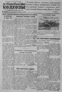 Пролетарии всех стран, соединяйшсь! t a Ш т & и т & Л е КОЛХОЗЫ Орг а н С е в е р н о г о РК ВКП(б) и Р а й с о в е т а д е пу т а т о в т р у д я щи х с я Но в о с ибир с кой обла с т и 1 9 7 ( 5 1 2 ) 1 25 сентября 1 9 4 1 г . четверг Цена 10 к о п . „Т о в а р и щ и рабочие, крест ьяне , интеллигенты! Р а б о т а я в тылу, приобретайте военные з н а ния, научитесь громить и и ст реблят ь ф а ш и стов, готовьте боевые р е з е р в ы К р а с н о й А р м и и : “ (•ПРАВДА.) БЫСТРЕЙ РАССЧИТАТЬСЯ ПО НАТУРОПЛАТЕ ЗА РАБОТУ МТС Сейчас , в суровые дни Отеч ественной войны, когда социалист и ч е с к а я родина мобилизовала все силы и ресурсы для разгрома н е навистных нем ецко -ф аш и ст ски х орд, дорог к а ж д ы й килограмм зерна . Чтобы обеспечить бесперебойное с наб жени е хлебом бойцов героической Красной Армии и население страны перед колхозами и совхозами стоит большая о тве тс твенная з ад а ч а— бистро рассчитаться с государством не только по обязательным поставк а м , но и по всем дру гим н а т у ральным зерновым обязательствам. Хлеб должен поступать па го с у дарственные п у н к т ы непрерывным потоком. Одной из в а ж н е й ш и х обязанностей колхозников перед государством являетс я своевременная сдача высококачественного зерна в счет пату роплаты за работу ЫТС. Колхозы наш его района прон и к н у т ы единым стремлением оказа ть ¡Юдине к а к можно большую помощь в унич тож ен ии к ро вавого ф ашизма , широко развернули хлебосдачу. Многие колхозы по казывают в этом деле образцы высокой патриот ической сознательности. Одновременно с хлебопос тавками , они рассчитываются но натуропла те с МТС. Однако, пе мало сшс у нас в районе колхозов, которые сдавая зерно в государств енные хлебоп о с т а в к и , пы таются отложить ра счет по па туропла те с МТС во вторую очередь. Безусловно, это нкорне неправильное явление. З атраченные м а ш и н н о -тр а к тор ными с та н ци ям и на обработку колхозных нолей средства и материалы должны быстро возмещ а ть с я . Поэтому ни на один л иш н ий день нельзя з ат я ги в а т ь сдачу зорпа в счет натуроплаты з а работу МТС. Н у ж п о н а прячь все силы на то , чтобы еще более высокими те м п а м и вести обмолот и п ро с у ш к у хлеба, вести эту работу на всех т о ч к а х и всеми средствами к р у гл ы е с у т к и . Только т а к а я постановка дела обеспечит быстрое завершение уборки урож а я и хлебосдачи государс тву. Боевая задача всех колхозов з аклю ч ае тся в том, чтобы в ближ а й ш и е дни полностью ра ссчи т а ть с я с государством по н а туро пл а те за работу с МТС одновременно с обязательными государственными хлебопоставками. Дело чести руководителей колхозов и колхозн иков по-боевому выполн и т ь э т у по четную задачу . Колхозы Федоровского сельсовета закончили косовицу хлебов Д е й с т в у ю щ а я а р м и я . Федоровские колхозы самыми первыми в Северном районе за кончили косовицу хлебов. 2 0 сентября был связан последний спои . Хлеб убран с площади 7 0 0 г е к та ров . Одним из первых в сельсовете косовицу хлебов з а к о н чил колхоз им. М а к с и м а Горького (председатель правления тон. Леонтьев), затем косовицу закончили колхозы им. Свердлова, «Тр уд ов ик » . Охваченные п а т р и о т и ч е с к и м стремлением быстро и без поте рь убрать у р о ж а й , дать К р а с ной Армии, нромышлеиныы ц е н т рам к а к можно больше сельхозпродуктов, колхозники па хлебоуборке работают от те м н а до т е м п а . Многие товарищи выполняют по 2 