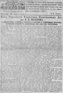 О р г а н С е в е р н о г о Р К В К П ( б ^ и Р а й с о в е т а д е п у т а т о в т р у д я щ и х с я Н о в о с и б и р с к о й о б л а с т и Й I) “ " 7 (557 — 558) 15 января 1942 г. четверг „ У ж е одн о т о, что в св оей морал ьн ой деграда ции немецкие захват чики, поте ряв челов еческий облик , давно у ж е пали до у р о вн я диких з в е р е й ,— у ж е одно это о б с т оя т ел ь с тв о говорит за то, что они обрекли с ебя на немину емую г и б е л ь " . И. В . Сталин. Но т а На родно г о К о м и с с а р а Ин о с т р а н ных Де л тов. В. М. МОЛОТОВА О ПО ВСЕМ ЕСТНЫ Х Г Р А Б Е Ж А Х , РА ЗОРЕНИИ НАСЕЛЕНИЯ И ЧУДОВ ИЩ НЫ Х ЗВЕРСТВАХ ГЕ Р М АН С КИ Х ВЛА СТЕЙ Н А З А Х В А Ч Е Н Н Ы Х ИМИ СОВЕТСКИХ ТЕРРИТОРИЯХ Разор яя н а ш и города и седа, неме цко е и все о с т ав ш ее с я для дет ей п и т а н и е - в ком ан дов ан ие т реб уе т от своих во й с к соз- том же селе г е р м а н с к и й офицер и нее- да иат ь « з о н у п у с т ы н и » по все х с о в е т е - : ко ль ко солдат, во рв ав ши сь в дом у ч и - к и х м е с т н о с т я х , о т ку д а с у сп ех ом и з го н яю т , те льни цы М а т я е я к о В. И. забрали у нее з а х в а т ч и к о в воГп ка Крас но й А р м и и . Н о ‘ всю ее одеж ду и де т с ко е вещи, а мебель. * . КОТОр ую не см ог да у Еести> изру би ли т о пором. В деревн е П ру дпое, Т у л ьс к ой обл а с т и , не мец ки е солда ты , в ор ва вш ис ь r дом, г де по мещ ал ос ь 1 5 0 чел овек и е в а л л - дов, отобрали у н и х всю т е п л у ю о де жд : и п р о д у к т ы , у г р о ж а я бесномощпым люд я ! о р у ж и е м ; незадолго до освобождения ча- ст ями Кр ас н ой Ар мии деревни Колодезноб Т у л ьс к ой обл ас ти , немцы 7 декаб ря р а с стр ел яли в это й деревне 3 2 м у ж ч и н и н н е п од вер га ет ся без у де рж н ом у г р а б е ж у и | ж е н щ и н яко бы за то, что они сдали н ей р а з б о ю :К р е с т ь я н е л иш а ю т с я сво ег о и м ущ е- цам не все те п л ы е вещи- в деревне Вл с т в а , н а ж и т о ю у порным тр удом цещах де- сово, Мо ско вск ой области одна из к о л ю с я т и л е т и й , ли ш а ю т с я из бы, с к о т а , хлеба, ! н п ц , о к аз ав ш ая граби тел ям с оп ро ти вле пи i одежд ы, — всег о, вп ло т ь до п ос л е д н е й : п ри кр а ж е нм и К а п у с т и н карт офеля 6п де тс ко й р у о а ш с и к и , до последней го р с т и да ра не на из ав т ом ат а, а ко г д а р а н ен .л з ер на . Во м н о ги х с л у ч а я х с ель ск ое на ев - женщина* н ач ала к р и ч а т ь и п р о к л и н а т ь л е н и в , в к л ю ч а я с т а р и к о в , ж е н щ и н и дс-1 немцев, н аз ыв ая и х ба нд ит ам и и г р а б и т е т е й , сра зу ж е после З а н я т и я села и з г с Н л я м и , немцы И с с т р е л я л и ее оче ред ью i П ТАТЙ.Л А гt v n « b i • м ir т» « ______ г л Народный Коми сс ар И н ос т ра нн ы х Дел тов. В. М . Молотов вап ра в пл всем послам и п ос ла н ни ка м с т р а н , с которы ми СССР имеет дип ло мат ич ес ки е от п о ш е п и я , п от у следующего с о д ер ж ан ия : Y > c l Io п о р у ч е н и ю П ра в ит ель ст ва Союза Со в ет с к их С оц и а л и с т и ч е с ки х Р ес п у б л и к имени,че с т ь довес ти до Ваш его сведен ия следующее: Освобождение ча с т ям и Краевой А р м и и , в процессе ее прод олж ающ ег ос я у с п еш н ого к о н т р н а с т у п л е н и я , ряда городов и с е л ьс к и х м ес тно ст ей, на хо ди вш и х с я вре- меино в р у к а х г е р м а н с к и х з а х в а т ч и к о в , в ыя ви ло и с ка ж ды м днем все более п р о дол жа ет в ы я в л я т ь не с лы х ап ну ю к а р т и н у п ов с ем ес тн ою гр а б е ж а , всеобщею разор ен и я , г н у с н ы х н а с и л и й , вз девательств я массо вых у б и й с т в , у ч и н я в ш и х с я н емецк о- ф аш и с т с ки м и о к к у п а н т а м и над мирвы м на селением пр и и х н а с т у п л е 