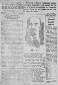 l e m a p u u в се х с т п а н г с о е д и н я й т е с ь ! колхозы О р г а н С е в е р н о г о РК В К П ( б ; и Р а й с о в е т а д е п у т а т о в трудящихся Новосибирской области * № 9 (560 ) 21 января 1 9 4 2 г. среда [Ц е н а 1 0 к о п | „Товарищи - рабочий, товарищи - красноармейцы! Напря гай т е все силы! Во что бы то ни стало преследуйте о т ст уп ающ ие войска , бейте их, не д а в а й те им ни часа, ни минуты о тды ха 11. ______ _______ в . И. ЛЕНИН. ПОД ЗНАМЕНЕМ ВЕЛИКОГО ЛЕНИНА МЫ ПОБЕДИМ 18 лет том у назад перестало бить ся сердце ве л ич айш ег о челов ек а всех времен и народов, во ждя и зн аменосца т ру дяще го ся человечества Владими ра Ильича Л еп и на . Зна мя , выпа вш ее из р ) к Лен ин а, — победоносное К расное Знамя освобождения т р ; щихся ст экс пла от ац ии и г и т , от нищет ы и голода, зн ам я освобождения народов — высоко попсе вперед вел и к и й с о р а т п и к и д р у г Ленина това рищ Стали н. Гер оич ес ко е Леая нек ое зн амя ! Оно осеняло ряды бес страшны х революционеров - ё' л ь ш е ш ко в , нял а под руководством то ва ри ща Сталин а бессмертные заве ты Л е н и н а , процв етала и креп ла с к а ж дым годом. Но во т с запада па н а ш у лю би му ю родину н а д в и п у л ю ь г р о з ная че рн ая т у ч а . Д ик и е орды нем е ц к и х фашистов ворвались в Сов е т с ку ю с т ра н у, чтобы час ть ю ист ре би ть п ас , а час ть ю пре кр а т и т ь в сво их рабов. И в э г п дн и гр оз ных ис п ы т а н и и со ве тс ки й н а род, к а к н ик ог да Сдлотплся в о к р у г п а рт ии Дейинр'тСталинй. Под пабедогоспым яп амеие м вел ик ог о Лен ин а мы ведем во йн у чободптсльвуго, сп ра ве дл и ву ю глу бок ом подполье ведших бо р ь б у ]м ы отст аив аем e r f ® че ст ь, свою ( ‘ царизмом. Иод сен; ю . т щ и п с т - »свободу, свою независимость. Мы * г о з н амен и на одн ой шестой ч а е - . защищаем бвою л вб пм ую родину т и земного ша ра народы' осущс- от рабс тва, свой дам от разоре- с твили с т р а с т н ую многовековую м ечт у л у ч ш и х люд ей. мира— сверг л и власт ь ца рей , помещиков и к а п и та ли с то в и, взя в власть в свои собственные р у к в , создали великое цар ство т ру да , бр ат ску ю . семью народов СССР. Т яж ел и тр у д е н был п у т ь к этой славной победе. Советский народ п ер еж и л тр ех ле тн юю г р а ж д а н с к у ю во йн у и иптервен ци ю. Ге н и й Ле н ин а руководил борьбой молодой Советской Респ у бл ик и п р о т и в ин т ер ве н ци и , бе- л о г ва рд еп щ н пы , голода, холода. «Д у х ве ли ко го Л ен ин а вдохновлял нас то гд а на во йн у прот ив и н т ер ве н т ов . И что ж е ? Мы раз- / " 1 м и и н т ер ве н т ов , верн ули все V - - п о т е р я н н ы е те р р и т о р и и и доби лись победы». (С т ал ин ). Н о м е разг ром а контрр ево лю ции и ин т ер ве н ци и пачалось вел икая ст ро йк а соци а ли с ти че с ко го го с у дарства. Под зн аменем Ле н ин а, под руководством това рищ а Стал ина н аш а с т ра п а из пище й и отсталой п ре вр ат ил ас ь к вели кую ин ду с т ри ал ьн ую д е рж а ву , в ст ран у с самым передовым в мире со ци а ли с т ич ес ки м земледелием. Рабочие з аб или безработицу, к р е п ил , своих ж ен и :етей от г н у сного н ас ил ии и кро вавой р а с п р а вы. Мы защищаем разданные п р е кр ас ные фабрики п заводы, воздел а н н у ю нами пдодо) Одну го з е м л ю ,! па ш у расцве тшую ^ к у л ь т у р у . В ' этой смертельной сх ва т ке с пол - ! ч е д а «_ гс г; ш щ Х . ш щцг иадя с-, j той нас осеняет великое непобедимое зна мя Ленина. Лен ин а п е г среди вас. По его героическое зн амя освобождения | :ародов реет иад вам и. Оно зовет иас любить свою ро ди н у
