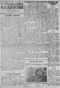 'т Ш ё ш Ш а с Ш колхозы О р га н Сев е р н о го РК ВК П ( б ; и Ра й со в ет а д е п у та то в т р у д я щ и х с я Н о в о с и б и р с к о й об ла сти №10 (561) ^ 3 я н в а ря 1 9 4 2 г, п я т н ица j Цгиа 10 коп БОЕВЫЕ З А Д А Ч И На-днях >закончил свою работ у VI пленум Новосибирского областного комитета ВК Щб), который обсудил следующее вопросы: 1) 0 выполнении задач, поставленных товарищем Сталиным в докладе Ът 6 ноября 1941 г ., ^ 2 ) Об ито гах 1941 сельскохозяйственного года и плане сельскохозяйственных работ па 19 42 г . 3 ) 0 состоянии общественного жи вотноводства в колхозах, 4) Орг- вопросы. * * Задачи, которые стоят в нас-» тоящее время перед колхозной деревней, исключительно огром ные. Товарищ Сталин поставил перед сельским хозяйством Советского Союза боевую задачу,— давать фронту и стране «. .. все больше и больше хлеба, мяса, сырья для промышленности». Выполняя это указание своего вождя тру женик ки колхозной деревни работают ОТ СОВЕТСКОГО И Н Ф О РМ БЮ РО В е ч е р н ее со о бщ е н и е 2 0 я н в а р я ние их . С этим необходимо немедленно покончить. Семена — основа высокого урожая и они должны быть подготовлены повсеместно. В связи с тем, что объем весенне-полевых работ (^удет значительно увеличен необходимо сейчас же начать готовить к весенним работам рогатый скот. А надо сказать, что с этой работой дело у нас обстоит исключительно плохо. Необходимо быотрее устра нит ь этот недостаток, начать в к а ж - .дом колхозе обучать' коров, гот овить их к полевым работам. Исключительно серьезное вн и мание надо так же уделить подготовке к севу лошадей. Необходимо принять все’ меры к тому, чтобы инфекционные заболевания В течение 2Q я н в а р я Даши войска продержали теспвть немецко-фашистские войска на запад. Про тивник несет большие потери. Наши части заняли г. Можайск. Захвачены- пленные. За 19 января уничтожено 16 немецких самолетов. Наши ноте ри— 5 самолетов. За 19 января части нашей авиации уничтожили 39 немецких танков, 2 брооеюап ины, более 730 автомашин с во й е т м и и грузами 12 орудий с ирис: угой , 6 пени тоо -цул еме тнг /! то 1вк , подожгли 2 железнодорожник эшелона, разрушили 21 железнодорожный вагон, рассеяли и частью истребили 7 батальонов пехоты противника. лошадей были Oucigo ликвидированы. В этом направлении должны крепко поработать ветеринарный персонал райзо и все Заняв районный центр Оста- шево, часть тов. Алексеева зах ватила 15 вражеских тан ков . 101 автомашину, 2 склада с боепри пасами и другие трофеи. ЛЕНИНСКИЕ ДНИ В СЕВЕРНОМ РАЙОНЕ С Е В Е Р Н О Е не иокладая р у к , отдают все с и - : колхозники, лыфропту , самоотверженно помо -; Исключительно большую потают Красной Армии. Сейчас, в мощь должны оказать колмз;»м связи с приближением весны п е - 1 в сельхозработах 1942 г . рабо- ред колхозной^ деревней стоят з а - 1чие и служащие. Сейчас, по ре- дачи огромной важности. ! шению бюро обкома ВКЩб), паВесенний сев этого года будет до начать обучение сельхоарабо- проходить в особых условиях Мпо- там рабочих и служащих , кото- г о код хознн кои _ у шло .на фронт с , рые -будут сведаны в .ллхоэы, оружием в р у к а х защищать роди- Помощь сельхозартелям надо ну от фашистских варваров. Вместе с этим в предстоящую посевную кампанию необходимо значительно расширить посевные площади, сев надо провести быстро, по-военному, добиться высокого урожая. Для того, чтобы выполнить это, надо развернуть деятельную подготовку к севу. Необхо