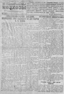£ П р о л е та р и и всех с т р а н , с о ф м я Х ] ж с ^ колхозы О р г а н С е в е р н о г о Р К В К П ( М н Р а й с о в е т а д е п у т а т о в т р у д я щ и х с я Н о в о с и б и р с к о й о б л а с т и И11 (562) 2 5 я н в а р я 1 9 4 2 г . в о с к р е с е н ь е Щепа 10 коп ТОРЖЕСТВНЕНО-ТРАУНРОЕ ЗЛСЕЛАНМЕ, посвященное XVII годозщйне соШ сМерти в. И. ЛЕНИНА - -С м е р т ь о т д е л и л а о т н а с т о в а р и щ а Л е н и н а , н о е г о о б р а з з а п е ч а т л е н н а в е к и в в е л и ч е с т в е н н о м з д а н и и с о в е т с к о г о с т р о я , в с т а л ь н ы х р я д а х н а ш е й к о м м у н и с т и ч е с к о й п а р т и и , в н е р у ш и м о м с о ю з е р а б о ч и х и к р е с т ь я н , в д р у ж б е н а р о д о в С о в е т с к о г о С о ю з а , в н а ш е й д о б л е с т н о й К р а с н о й А р м и и , р а з я щ е й ф а ш и с т с к и е п о л ч и щ а , п р о б р а в ш и е с я н а н а ш у з е м л ю " . ________________ Ж . ОТ СОВЕТСКОГО И Н Ф О РМ БЮ РО В е ч е р н ее с оо бщ е н ие 2 2 я н в а р я 21 я н в а р я , в депь X V I I I г о д о в щ и н ы со дня смерти Владими, ра Иль ича Ле н и н а . в Мо скве состоялось то рже с т ве н н о- т ра у рн ое заседание Ц1£ В Ш б ) , Моско вск ог о областного и Моско вск ого г ор одского ко м и т е т о в ВПП ( б ) , Исп о л к о м а Ком и н т е р на , Пре зидиумов Ве рх овн ог о Совета СССР я Ве рх овн ог о Совета РСФСР, Моско в ск о г о областного и город ского Советов де п у т а т о в т р у д я щ и х с я , Ц К ВЛ КСМ , МК и Н Т К ВЛ КСМ, П рез иди ума ВЦСПС, раб очих*стах ан овц ев, у да рн ик ов и ин теллиг е н ц и и ст оли цы. В 0 часов 5 0 м и н у т за сто лом през ид иу ма поя вл яю тся т ов ари щи Ста лин , Молотов, К а ли н ин , Андреев. М и к о я н , Каг а н о ви ч , Бер ия , Ма ле нк ов , Щерб ако в, Возн е се н с ки й , Ку зн ец ов , Ш к и р я т о в , Бадаев, Яро сл ав ски й, Щ , ц е п к о , Понов, П р о н и н , Черноусое. Появление тов ар ищ а Сталпв а, ру ков од ит еле й п а р т и и и п р а в и тел ьст ва вст ре ча е тс я долго нес малкаяпдсй ова ц ие й. Все вс та ют , с ис кл ю чи те ль н ой те плотой при ве т с т в у ю т ве ли ког о вож дя Совет с ко г о народа и Краево й Армии т ов ар ищ а С т али на и его сорат н и ко в . Г р е м и т мощпое « у р а » , со всех к он цо в зала раз даются воз г л а с ы : — Да здра вст вуе т то вар ищ С т ал ин ! — Да зд ра вс т ву ет н аш вождь и ио лк ово дец ! Тов. М. И . К а л и н и н о т кр ы в а ет т о р ж е с т ве н н о- т ра у рн ое заседание к р а т к о й вст у п ит ел ьн ой речью. — Т о в а р и щ и , — го во ри т о н , — прошло 18 ле т со дни смерти Влад имир а Ил ь ич а Л ен ина. Прош у п о ч т и т ь ег о п ам я т ь вс та ван ием . Все в с т а ю т . Орке стр и с п ол н я ет т р а у р н ы й ма рш . Мысля всех в э г у бе зм олв ну ю м и н у т у обращены к т ом у , к т о всегда с на ми, * в Л е н и н у , чье з н ам я , чьи вели к и е иде и, чей бессмертный образ ос еняет н а ш народ в его г е роич ес кой борьбе за свою незав с и и о с т ь , че ст ь и свободу, — Тов ар и щи , — продол жа ет М. I I . К а л и н и н , — 1 8 годов щи ну со дн я смер ти то вар ищ а Ле нина в р а г а — ге рм ан ск ог о им п ер иа ли з м а — на ш народ, ко м м у н и с ти ч е с к а я п а р т и я - ч е р п аю т сил ы в не иссякае мом и с т о ч н и к е — л е н и н и з ме. Смерть отделила от н ас то в а ри щ а Ле н и н а , по его образ за - ц еч ат ле н н ав ек и в вел ич ествен- н ос з дан ии с ов ет ско го с т ро я , в с т ад ьп ы х ряда х н аш ей к ом м у ни с т и ч е с к о й п а р т и и , в н ер уш им ом сорзе рабоч их и кр е с т ь я н , в д р у жбе пародов Советского Союза, в нашей доилест вой Красн ой А рм ии , ра зящей ф аш ист ски е п о лч ищ а, п ро бра вш иес я ва н а ш у землю. То ва ри щи , свя щ ен но й об яз ан но 