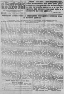 З А Б О Л Ь Ш Е В И С Т С К И Е Н О Л Х О З Ы _ 2 7 _ я н в а р я 1 9 4 2 г . № 12 (5 6 3 ) Развернем соревнование за образцовое проведение весеннего сев» за высокий у р ож а й О Б Р А Щ Е Н И Е СЛЁТА П Е Р Е Д С Т И К О В С Е Л Ь С ^ О Г О Х О ЗЯЙ СТВ А Н О В О С И Б И Р С К О Й о б л а с т и к о в с е м к о л х о з н и к а м и к о л х о з н и ц а м, КО ВСЕМ' РАБОЧИМ И Р А Б О Т Н И Ц А М М Т С , С О В Х О З О В И СПЕЦИАЛИС ТАМ С Е Л Ь С К О Г О Х О ЗЯ Й СТ В А (Окончание. Н а ч ал о на 1 стр.) Т о в а р и щ и к у р с а н т ы ! Мы призывае м вас со всем с т а р а н и ем из у ч а т ь т р а к т о р , ко м б а й н , а г р о т е х н и к у . Д о м н и т е , ч т о вам буд у т в р у ч е ны дорогостоящие сл ож ные се ль с к ох оз я йс т ве н ны е м а ш и н ы , и от вас п от реб ую т бесперебойной высо ко пр ои звод ит ел ьн ой работы на в и х . П р е д с е д а т е л и к о л х о з о в ! К щ е и еще раз проверьте, к а к о р г а н и з о в а н а п од го то вка к се ву к к а ж д о й полевой бр иг аде , подоб- ра п ы лн звеньевые, п а х а р и , сея л ь щ и к и . Смелее вы дв и г а й те ж е н щ и н на все сель с ко х оз я йс тве нн ые работы! Самое главное на весеннем сев е — п р а ви ль н ая о р г ан из ац ия т р у да, работа по п л а н у в каж до м ко лх оз е, в ка ж д о й полевой б р и г аде , звен е. Каж ды й к о л х о з н и к и ко л х о з н и ц а , к а ж д ы й раб от ни к совхоза и МТС до лже н то чно з н а т ь сво и обя за нности к а к в п о д г о т о в ке к весеннему се ву, т а к п н а весе нн их п оле вых работах и с п ол ны м по н им ан ие м своего до лг а перед родиной самоотверж е н н о в ы п о л н я т ь п о р у ч е н н у ю раб от у . П р е д с е д а т е л и к о л х о з о в , к о л х о з н ы е с ч е т о в о д ы ! Не ме длите с составле нием р а бо ч их план ов весеннего сева, у с т а н о в и т е ч е т к и е задан ия к а ж д о й б р и г а д е , з в е н у , ка ж дом у к о л х о з н и к у . О р г а н и з у й т е ст р о г и й у ч е т работы ка ж д о г о ко л х о з н и ка , ш ир ок о п р и м е н я йт е для п оо щрен ия передов и к о в з ам еча те льн ый з а к о н о доп ол ни те льн ой оплат е т р у д а за п овышен ие ур о ж а й н о с т и зе рн ов ых к у л ь т у р и п р о д у кт и в н о с т и ж и вотноводства. Т о в а р и щ и к о л х о з н и к и и к о л х о з н и ц ы , р а б о ч и е с о в х о з о в , М Т С ! В а ж ны е и от ве т с т ве н ны е задачи пос тавлены п а р т и е й в п ра ви тел ьс твом перед п аш ей восто чно й областью. На пр ош ло м слете передов ико в сел ьс к о г о хо зя йс тва здесь, в Новосиби р ск е , в ы с т у п ал с е кр ет ар ь Ц К п а р т и и то ва ри щ Андреев. Он дал .. пам исч ер пы ва ющ ие , яс ные у к а з а н и я , к а к доби ться в б л и ж ай ш и е годы да ль нейш ег о зн ач ит ел ьн о г о роста зернового х о з я йс тв а и под-ема у р о ж а й н о с т и . Вып олн яя э т и у к а з а н и я , мы вы рас тила в прошлом году более вы с о ки й урож а й , чем год том у назад. Но сделано далеко и далеко не все. Надо еще много и н еу то ми мо ра- ми доби ваться общего ботат!», ч т ) б ы обе с аэ чи ть реш п- т щ ь е ы й подъем всех отраслей Земледелий, чт об ы собир ать во всех ко лх оз ах и со вхозах вы с ок и й у рож ай. На нашз м слета то ва ри щ Анд- рае вго во рил : « З в е н ь я в б р и г а д а х д е й с т в и т е л ь н о я в л я ю т с я д л я к о л х о з о в в а ж н е й ш и м с р е д с т в о м к п о в ы ш е н и ю п р о и з в о д и т е л ь н о с т и т р у д а . . . » . В звен е, сост оящем из небольшого ко ли чес тва ко л х о з н и ко з , им ее тс я в о з м ож н ос т ь1 более полно и пра ви ль н о о р г а н и зовать т ру д, в звене больше простора для прояв лен ия и н и ц и а т и вы и способностей ко л х о з н и ко в , звено не дает возможно сти от ст 