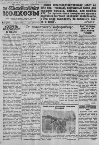 J L ( i f u u j * БИБЛИОТЕКА?; П р о л ет ар ии aeex етр л н , ы ь д и н л йпЫль-l T ~ ------- Ц д д ц шШЗте&итмЬе колхозы О р г а н С е в е р н о г о РК В К П (б ; и Ра й со в е т а д еп ут ат о в т р у д я щ и х с я Нов о си б и р ск о А ^ о б л ас т я 1115 (566 ) 4 февраля 1942 г . среда |Цена 10 коп сель ск ох озяй ственны х работ на 1942 г о д — твердый, нерушимый занон для к а ж д о г о колхоза, совхоза, дл я к аж д о й МТС. Он продиктован Интересами фронта, задач ами разгрома немецких за хватчиков, и -его надо в ыпо лня ть по-военному, т оч но в срок „ПРАВДА* УСКОРИТЬ ПОДГОТОВКУ К ВЕСНЕ В ус л о в и ях великой О т еч е ст венной войны советского народа с германским фашизмом особое значевпе в обеспечении страны пр од укт ам и продовольствия и се льскохоз яй ств ен ног о сырья приобрет а е т да льнейшее расширение по севных площадей и повышение ур о жа йн о ст и зерновых, те х ни че ск и х к у л ь т у р и к ар тофе ля . В соо тв е тс тв и и с постановлением Но иосибирского облисполкома и бюро обкома ВК П (б ) о т 5 янва ря 1942 года исполком райсовета и райком В К П (б ) ут в е р д и ли нлан се льск о х оз яй ст в е н н ы х работ по к о л хозам Северного района на 1942 год. Посевная площ адь в районе доджп а бы ть увелич ена на 4. 500 г ек та ро в . Зерновых яро вых бу де т посеяно 21.330 г ек та ров вместо 19 т ы с г ек та ро в в 1941 г о д у . На 100 про центов уве ли ч ив ае тся посев к ар то ф ел я , т а к же з начи те л ьн о расш иря ет ся посев т е х н ич ес к и х к у л ь т у р . А всего у б о рочная пл ощ адь 1942 года соста в и т 3 2 -1 10 гект аро в, вместо 27.6 96 гект аро в в прошлом ГОДУ- •План сельхозработ 1942 год а— это государс тве нн ое задание, продиктованное условиями военног о времени и оно до лжно быт ь безоговорочно вы полнено всеми к о л хозами. На вы полпен ве этого боевого зад ания должно бы ть н а п равлено ус и ли е всех п а р т и й н ы х , со вет ски х о рг ани зац ий, всех к о л хозни ков , работников МТС, спе ци али сто в сельского хоз я йс тв а, все х т р у д я щ и х с я района. Несмотря на то , ,ч то в этом год у н а г р уз к а на живое т я г л о , машины бу де т больше чем в пр ош лом, у нас е ст ь все усл ови я к то м у, чтобы с честь ю в ы п о л н и т ь 1 дн я ^ б о е а все задачи, добиться нового а о дъ - О т с о в е т с к о г о информбюро Ве че рнее с ообщ ение 1 ф е вр а л я В те ч е н и е 1 ф е в р а л я н а ш и це ры 196 п е х о т н о г о п о л к а 68 в о й ск а , у н и ч т о ж а я у з л ы с о п р о - ( н ем ец кой п е х о тн о й д и в и з и и со - т и в л е н и я п р о т и в н и к а , п р о д о л - о б щи ли , ч т о со в е т с к и е п а р т и з а - ж а л и п р о д в и г а т ь с я в пе р ед . З а 31 ян в а р я у н и ч т о ж е н о 7 н е м е ц к и х с а м ол е то в . Н а ш и п о т е р и — 2 са мо ле та . З а 31 я н вар я ч а с т я м и н а ш е й а в и а ц и и у н и ч т о ж е н о 17 т а н к о в , 210 а в то м а ш и н с п е х о т о й и г р у з а м и , 40 пов озо к со с н а р я д а м и , 1 а в т о ц и п е р н а с г о р ю ч е м , 33 п о л е в ы х и з е н и т н ы х о р у д и я , по да в ле н о 9 з е н и т - н о - п у л е м е т н ы х т о ч е к , у н и ч т о ж е н о и расс еян о до 2 - х б а т а л ь оно в п е х о т ы п р о т и в н и к а . 31 я н в а р я ч а с т ь п о д к ом а н до ван и ем т о в . На ум о ва ( З а п а д н ы й ф р о н т ) с о вм е ст н а с т а н к и с т а м и т о в . Ч е р ны ш е ва п о л н о с т ь ю у н и ч т о ж и л а 3 -1 п е х о т н ы й б а т а л ь о н 4 -г о п о л к а « С С * . З а х в а ч е н ы п л е н н ы е . Н а д р у - у ч а с т к е о дно и з п о др а з д е л е н и й ч а с т и к ом ан ди ра Ор а ст ов а , о т р а ж а я к о н т р а т а к и 1п р о т и в н и к а , у н и ч т о ж и л о 158 н е м е ц к и х с о л д а т и Оф иц е р ов . П 