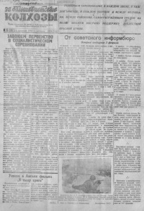 t h p a u , р м д и н я й щ с ь У ] т Ш ш а ^ т т Ш / е колхозы А р г а и С е в е р н о г о Р К B K F T ( 6 j и Р а й с о в е т а д е п у т а т о в т р у д я щ и х с я Н о в о с и б и р с к о й о б л а с т и >16 (567 ) 6 ф е в р а л я 1 9 4 2 г , п я т н и ц а j i l a a l о к о п . ЗАВОЮЕМ ПЕРВЕНСТВО В С О Ц И А Л И С Т И Ч Е С К О М СОРЕВНОВАНИИ Р А З В Е Р Н ЕМ СО РЕВНО ВАНИЕ В КАЖДОМ З В Е Н Е , В КА Ж Д О Й 'Б Р И Г А Д Е , В КАЖ ДОМ К О Л ХО ЗЕ И М Е Ж Д У КОЛХО ЗА- ' „ л " * * МИ, М Е Ж Д У РАЙОНАМИ. С А М О О ТВ Е РЖ ЕН Н Ы М ТРУПОМ НА ПОЛЯХ ОКАЖЕМ МОГ У ЧУк) П О Д Д Е Р Ж К У ДО БЛЕСТНОЙ КРАСНОЙ АРМ ИИ . I В е л и к и и п оч ет ны зад ач и к о л хо зн ог о произво дств а в дни О т е че ст в ен но й войны с о в е т с к о г о . н а - У » д а с ге р м а н с к и м фа ш и зм ом . То в а р и щ С т а л и н ч е т к о и яс но определил э т и й а . и ч и в с гоем ис то ри ч ес к ом д о с а д е 6 ноябр я . На д о, говорил т ов ар ищ ^ С т а л и н ,— чтобы « н а ш и ко л хо з ни к и , м у ж ч и н ы и ж е н щ и н ы , ра бот а л и н а св оих п ол я х н е п о к л а д ая р у к и д ав ал и бы фро нту и с т р ан е все бо льше и больше х л е б а, м я с а , сы рья для пр ом ышле нн а ш е г о ра й о н а был об су жд ен и п р и н я т т е к с т договора. Се го д н я в н а ш е й г а з е т е п у б л и к у е т с я эт о т договор. По ч ет ны об яз ат е ль ст в а в а ш и х к о л хо з ни к ов . Надо р а ч и т е л ь н о р а с ш и р и т ь п ос ев н ую площадь з е р н о в ы х , т е х н и ч е с к и х , к ор м овы х, ово щных ку л ь ту р * , до биться п о л у ч е н и я 1 0 0 - пудо вых у р о ж а е н , з а - ' да 2 февра ля сб ит о в в оз д уш - КОНЧПТЬ COB В 8 - 1 0 д н е й , ЬЫНОЛ-'иит боях й и упитгажЬнп пя яяОт сове тского информбюро Вечернее сообщение 3 февраля В т е ч е н и е 3 фе чр ал я н а ш и За х в а ч е н о м но го сна рядов в в и н - 6 декабря. 11 о б м ор ож ен ны х во йс к а н а б оль ши нст ве у ч а с т к о в тово чны х п а тр о н о в . 1 1 фронта продо лжа ли в е с ти n a c T y i нат ель ные бои. П р о т и в н и к вводил в бой новые ре зервы. 11а н ек о то рых у ч а с т к а х фронте, в р а ж е с к и е во й с к а пер ех од ил и в к о н т р а т а к и , которы е были отб иты с бо льшими для н ем цев п о т е р я м и . В а ш и во йс к а вновь п ро дв ин ули сь вп ен н т ь п л а н з е рн оп ос та во к и н а т у ро п ла ты з а работы J lt jC к 7 но яб р я , добит ьс я нового п од ъ е ма в н о с т и » . С а м оо тв ер же нн ым т р у - ! п р о д у к т и в н о с т и ж и в от н ов од с тв а , дом, г е р о и ч е с к и м и дел ами от в е- у с ил ит ь по мо щ ь фр онту. т е л о к ол хоз ное к р ес ть я нс тв о п а Д л я т о г о , чтобы с че сть ю вы- пр из ыв во ж д я , всю свою ра боту п о лн ит ь в з ят ы е о б яз ат е ль ст в а, за - п од ч и н и в ип те ре с ам фр он та , и н - ; во ев ат ь пер ве н ств о в со рев но еа - т е р ес ам р а зг ро м а в р а га . ! н пи с В е н г е р о в с к и м ра йо но м , а к П ро шл ы й се л ь ск о х о з я й ст в ен 1эт ом у у н а с на л ицо рее ус л ов ия , ный год з а к о п ч е н у с п е ш н о . О г - н ад о' о б рл п ов о по дг от ов и ть с я к ромные з ад ач и п р ед ст о ят ре«ввть с е ву , пр ов е ст и ег о в а редельво р а б о т н и к а м се л ьс к ог о х о з я й с т в а с ж а т ы е ср о ки , н а высоком а г р о - в этом го д у . Оеобеппо огро мные т е х н и ч е с к о м у р ов н е, ст ро го соб- зад яч и п ос та вл ены п ер е д во ст оч - лю ст и все тр е бо в ан ия а г р о т е х н и - нымн ра й о н а м и с т ра ны в дел» к ч в послед ующем уво де за посе р а с ш и р е н и я п ос ев ных п ло щ ад ей , . ^ а м м , быс тро , ц б е з ^ т е р ь , уб ра ть осво ени я новь.ч . т у р , но.тня- у р о ж а й . Зв ен ь ев ая о р г а н и з а ц и я т и я у р о ж а й н о с т и . Обком В К Н ( б ) ра боты, вы сок оп рои зв од ит ель ны й " л , г л ' г ” <‘ " л