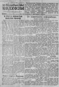 ' i b i V : r Пролетарии всех eiiipbu, соединяйтесь!, колхозы #• * О р г а ц С е в е р н о г о Р К В К П ( б ^ и Р а й с о в е т а д е п у т а т о в т р у д я щ и х с я Н о в о с и б и р с к о й о б л а с т и 119(570 ) ' 1 3 феьрпля 1 9 4 2 г . п я т н и ц а [ Ц е н а ! Исключительно больш ая задач а в нынешнем г о д у в о зла г а ет ся на тракторные парки МТС. Трактора д о л жны б у д у т работ ать чет ко , б е с п е р е б о й н о , б е з о с т а н о вочно. Ничто не д о л ж н о задерживать их ни на минуту . Таков за к аз фронта , таков о треб о в а ни е родины. О со б е н н о важно в свя зи с этим в нынешнем г о д у в срок и полностью за в е зт и в машинно-тракторные станции го рюч ее , з а б ла г о врем ен но ра з в ез ти е г о по кол хозам , в тракторные отряды. В СРОИ и полностью ВЫВЕЗТИ ГОРЮЧЕЕ И с клю чит ель но большая задача сельхозартели имени К а г а н о в и ч а в нынешнем год у возлагается на вместо го рючего для МТС возит т р ак т ор ны е п а р к и МТС. Т ра кт о р а из Бараб ин ска cojtf. райпотреб- должны буд ут работать че т к о, | союзу. На вопрос, „ т о позволил бесперебойно, безостановочно. Н и - ; и г н о ри ро в ат ь и срыват ь г р а ф и к че го не должно з ад ерж ив ат ь и х райиспо лко ма и ра йко ма п а р т и и , ни на м и н у т у . Особепно в аж но председатель колхоза Пав люч ен ко в связ и с э ти м в нынешнем г о - го во ри т, что ему интереснее заду в с р о к и пол ностью завезти в [ р а б о т а т ь д ен ьги , маш ин н о -т р а кт о р н ы е ст ан ц ии г о - к „ „ „ „ рюч ее, эабЛ5Говреиешю L . “ Г его во к о лх оз а» , > Ж т о р в ы е | м" н № от рады. Н и к о и » ивризон «ель»» ? ™ . , " Т " m m ‘ m ' "Р 6' « Г у с т и т ь „ ы е в ш А и прошло» м И ш а т ь “ ш ж е " “ ые » J 1 н и х г с су дар ст вея ные з ад ан ия, п од ч ин я ть госу дар ст вен но важ ные дела своим корыст ным интер ес ам , дол жны при мен я тьс я су ровые меры. \ Не н ач ат а еще . к а к следует О т с о в е т с к о г о информбюро Веч ерне е соо бщ ен ие 9 ф е в р а л я году сл уча ев , ко гд а машины с у т ка м и и больше проста ива ли т оль ко из -з а несвоевременной доставк и го рю ч ег о. Вр ем ен и до весенни х работ оста ет с я у ж е н ем ног о, но т ем пы в ы во з ки горюч его из Бар аб ин с ка вы во з ка горючего в колхозы, в н аш и ма ш ия п о- тр ак то рн ые э то й работе п р и с т у п и л и п ок а с т ан ц ии далеко нс обеспечивают т ол ьк о сельхозартели Новотроацко- вып олн ен ия этого ва ж ног о дела го сельсовета. Ру ков одители же к с р о к у . Чу в а ш и н ск о г о н Би аз ин ск ог о сельТ а рт ас с ка я МТС обязана до 15 советов все еще ч ег о-то вы жи даю т, марта выве зти из Бара бин ска 1 2 0 Они не подумали еще о вывозке то н н г о рю ч ег о, вывезено ж е до с усадьбы МТС и та ры для за- с их по р т ол ьк о 3 5 то н н. [ л и в к и го рю ч ег о на ме стах. Вы полн яя э т у работу па г а з о г е н е - ! , ' ра т ор пы х т р а к т о р а х , руков од ит е-1 Та рт ас с ка я МТС им еет 7 газо- ла МТС не обеспечили и х н е о б - ; г е н е Рат 0Рп ы х т ра кт ор ов , для ходимым запасом тоилпеа ( ч у р о - К0Т0РЫХ п от реб ую тс я ва посев- п е к ) . В ре з ул ьта те т р а к т о р ы ИУЮ де с я т кн центнеров ч у р о ч е к, пр ос т аи ва ю т в п у т и В течеп ие Л 1'р е к ц и я МТС з ак лю ч ил а с кол - и с т е к ш п х дней февраля машин а хоз ами Договора на з а г о т о в ку 85 т р а кт о р и с т а то в. Антон ова долж- я е н т н е Рбв э ти х ч у р о ч е к , но к а к на была с ‘ ез ди ть в Бар аби ес к за ИДУТ дела- в м т с Н0КТО точно го рю ч им т ри раза. Однако о я а / к аз ат ь не М0Ж<1Т- П ри емк а за го- еще не вернулас ь и из перв ог о рейса, в которы й отп рав ила сь в начале ф