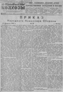 Л ! « г г л MLbf 4. о б л а с т н а я №24 (575) 1 2 0 ф е в р а л я 1 9 4 2 г . ч е т в е р г j Ципа 1 о коп. P ° " ^ V Г О Д О В Щ И Н А К Р А С Н О Й А Р М И И ТОРЖЕСТВЕННОЕ ЗАСЕДАНИЕ В МОСКВЕ КОЛХОЗЫ О р г а н С е в е р н о г о РК ВКЩб, ) и Р а й с о в е т а д е п у т а т о в т р у д я щ и х с я Н о в о с и б и р с к о й об л а ст и 2 2 февраля в зале имени Чайковского С0СТ0ЯД1 сь торжественное заседание па >тийных, советски х п обществе! н и х ор ганизаций столицы совместно с бойцами и командира* и воинских частей, посвященное X X I V годовщине Красной Армии и Военно- Морского флота. С докладам вы с т уп ил замес титель народного комиссара обороны арме йс кий комиссар 1 ранга тов. Е . А Щадепко. С ог ромным воодушевлением собравшиеся приняли пр ив ет ствие товарищу Сталину. После окончания тз рж ес т- еч- но го заседания состоялся большой конц ерт , в котором пр и н яли участ ие лучшие ар т ис те че ткие силы столицы. (ТАС С) . П Р И К А З Н а р о д н о г о 23 февраля 1942 К о м и с с а р а О б о р о н ы № 55 г. Москва. Тов арища* красноармейцы и краснофлотцы, командиры и политработники, партизаны и 'парти занк и! 24 ю годовщину Красрой Арм ии пароды нашей страны встречают в суровые ( дпи Отечественной войны против фашистской Германии, нагло и нодло посягающей на жизнь и свободу пашей родины. Па протяж ени и громадного фронта от Северного Ледовитого океана до Черного моря бойцы Краспой Арм ии и Военно- Морского флота ведут ожесточенные бои, чтобы из гн а ть из пашей страны немецко- фаши стс ких з ахва тч ик ов и отстоять честь и независимость нашего отечества. Не впервые Краевой Армии прих оди тся оборонять на ш у родину от нападения врагов. Красная Арми я была создана 24 года назад для борьбы с войсками иностранны х интервентов - захватчиков, стремив ших ся расчленить нашу страну и у н и ч то жи ть ее независимость. Молодые отряды Красной Арм о й, впервые в с туп ивши е в войпу, паголову разбили немецких з а х ватчиков под Исковом и Нарвой 23 февраля 1 9 1 8 года. Именно поэтому день 2 3 февраля 1 9 1 8 г. был объявлен днем рождения Красной Армии. С тех пор Красна я Армия ( осла и крепла в борьбе с иностранными иптервентами-захватчп- камп. Она отстояла нашу родипу в боях с немецкими з ахва тчик ам и в 1 9 1 8 году, изгнан их из пределов Ук раи ны , Белоруссии. Она от стояла нашу родину в боях с иностранными войсками Ан тав ты в 1 9 1 9 - 1921 г г . , изгнав их из пределов нашей стран ы. Разгром иностран ны х питервептов-эах- ватчиков в период гражданской войны обеспечил пародам Советского Союза длительный м и р и возможность мирного строительства. За эти два десятилетия мирного строительства возникли в нашей стр ане социалистическая промышленность и колхозное сельское хозяйство, расцвели на ук а и к у л ь ту р а , окрепла дружба пародов нашей стра ны . Но советский народ никогда не забыва л о возможности ново го нападения врагов на на ш у родину. Поэтому одновременно с подъемом промышленности и сельского хоз яйс тва , нау к и и к у ль ту р ы росла и поенная мощь Советского Союза. Эту мощь уже ис пы тали на своей спине некоторые любители ч уж их земель. Ее чув ствует сейчас х в а леная немецко-фашистская армия. 8 месяцев назад фашистская Германи я вероломно напал а на наш у стран у, грубо я нодло на ру ши в договор о ненападении. Вр а г рас чи тыв ал , что после первого же удара К рас на я Армия будет разбита и потеряет способность сопротивления. Но вра г жестоко просчиталс