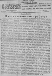 _ и О м Ъ н Ш * п р о л е т а р и и в с е х с т р а н , с о е д и н я й т е с ь ! П л « . . _______________ о ° _ * ЕЩ оценивать сейчас, в 1942 го ду, на девятом ме ся цё войны, разного вида работы в нашей стране, то весенние полевые работы можно поставить, как первоочередные. С ними может быть сопоставлено только производство боеприпасов, воор уж ен ия*. ( К А Л И Н И Н ) . ЩшФтш колхозы Орган Северного РК BKn(6 j и Райсовета депутатов т р у дящихся Новосибирской области 1 28(579) | 11 марта 1942 г. среда | ц^на 1окои. М. К А Л И Н И Н О в е с е н н е - п о л е в ы х р а б о т а х Перед деревней стоят ответственные государственные задачи. Приближается вес- * на, наступает страдная пора— начало сель скохозлйственных работ. Если лщеяикать сейчас, в 1942 году, на девятом месяце войны, равного вида работы в наци й стране, то весенние полевые работы можно поставить, ка к нвонюче родны е.' С ними может быть сопоставлено только производство боеприпасов, вооружении. w l , « с к о л ь к у сельскохозяйственные работы в своей подавляющей части надают на колхозников и не противопоставляются работе промышленности, тем самым кол ЮЗНИКВ и колхозницы стали ка к бы па передовые позиции фронта. Прорыв в сельскохозяйственных работах имел бы не менее вредные последствия, чем неудача на том или ином участке военного фронта. Наша страна с напряжением всех сил «орется за победу, и каждое утро миллионы советских людей от фронта до Владивостока пристально читают или внимательно слушают но радио сообщения Советского Информбюро, радостно ваходя в них новые успехи Красной Армии. Так «от важнейшим элементом в достижении этих успехов является удовлетворительное пит ан и е бойцов и командиров Красной Армии. Размеры пашей армии должны соответствовать достижению иостапленной "перед пей цели, т е. разбить фашистскую армию. Сле довательно, размеры нашей армьи должны быть очень и очень внушительными. Армия дол жн а-б ыи, хорошо экипвр па и в достаточной степени снабжена вооружением и боеприпасами. Эти предметы изготовляют па фабриках и заводах мил лионы советских людей. Но, чтобы армия хорошо дралась, а рабочие бесперебойно снабжали се вооружением и боеприпасами, необходимо обеспечить армию и города питанием) хлебом, мясом, овощами. Люди па фронте должны питаться сытно, разнообразно, ибо окопная жизнь, постоянная опасность быть перехитренным врагом требуют, чтобы ор тн из м бойца был в непрерывном напряжении,был жизве шнтелен II i этого простого рассуждения можпо вид«.ть, какое вначение нм<ет хлеб в достижении наших военных побед и к а к велика ответственность людей, работающих в сельском хо вяйетве. Сельскохозяйственные работы имеют свои особенности. Природа определяет порядок ^долевых работ во времени. Для весевпих работ, ка к сев, посадка овощей, в каждой местности время отводится довольно короткое. Можпо считать установленным правилом, что вёсенне полевые работы должны быть протведспы в максимально короткие сроки. Каждый опоздавший с работой, вследствие своей беспечности или нераспорядительности, рискуе т за нее ничего не получить или получить очень мало, рискует урожаем и делает пе вполне оОоспечеипым выполнение своих обя явностей перед государством, перед иародом. II вот если такой распорядитель— и ль это председатель колхоза, директор МТС, совхоза, председатель райисполкома или секретарь райкома будет уверять, что о