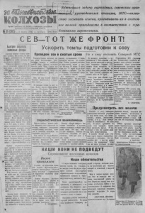 n u j i e c b Пролетарии всех стран, соединяйтесь/Ф ; *< (СЧ16Щ11 $(& чшвщ » j колхозы задача партийных, совет ских орга~ ■ руководителей колхозов, М Т С— - стью засыпать семена, приготовить и х в состоян и е пол ной пригодности в соответствии с тре* № Щ Ш П 2 Г ш р ^ 1 ^ 2 ~ Т Г с у б б о т а ; ц е . » 1 0 « ш \бованиямя______________ _________ Бысетре заспыать семенныфе онды Хорошие семе на— основа высоко г о у р о ж а я . Эта ист ипа , не т р е б ую щ а я доказ ат ель ств . В числе npfityfc'eBHux работ з асыпка сем я н — самое главное. Передовые колхозы района з а с ы п к у семфондов по до жг ли в основу основ в деле образцовой под- • r o f o T K ^ S J ie c n e . Полностью обес- печилн-себя семенами колхозы им Карла Ма рк с а, «Красно гвар дее ц», «П ам я ть Ч ап ае в а» , « У д а р н и к «Прогресс» и целый ряд д р у г и х . 18 колхозов ока за ли с оц иа лис та ч е с к у ю помощь колхозам нашего райопа, выделив им для посева сотни це нт не ров зерна. Г Но од на ко, не смотря па т о , что до нача ла сева осталось мало време ни , мп ог ие руководители к о л хозов до с и х пор до пу ска ю т п ре с т у п н у ю медлительность в деле з ас ы п ки семенных фондов. Колхозы Чеба ков ско го сельсовета за сы пали семян всего тольк о 3 5 , 2 Проц. к п л а н у . Нэ 2 7 , 6 проц. к ► пла ну з асып аны семена в кол хо зах Ч у ваши н ек ог о сельсовета, Обменные операциа некон диц и он ны х семя н па конд иц ион ные проходя т к р ай н е неудонлетворн тельно. ’ Всего обмену подлежит 7 . 1 7 1 ц е п т н ., по до с их пор обменено всего тол ько 6 7 4 цент т . е. 9 , 5 п роц . к пл ан у . Иеко торые ру ководители колхозов у п о р но нс же ла ю т выделять лошадей для вы во зк и семя н. Колхоз «П амя ть Кир ова» должен был вывез т и для обмена 14 1 це в тн . семян но до с и х пор н с вывезено ни цен тн е р а . Срыв аю т обмен семян кол хозы им. К а ли н ин а, «1 7 л е т О к та б р я » , « Крас ны й Октябрь» я др Край не неудовлетворительно идет прове рк а семян на посевные кач ес тв а. К 15 марта надо было полностью за ко н чи ть про вер ку семян в контро льн о семенной лабо р ат ор оп , т е. проверить около 21 ты с. це нт , семя н, а проверено всего т оль ко 5 . 0 0 0 . Та ки е кол я хозы, к а к н ап рим ер, «Намят Л е н ин а? , «1 7 лет Ок тя б ря », го -С аб ан », «Нов ый п у т ь » до си пор нс предс та вил и образцы се мя п для повторного анализа. Надо с к а з а т ь , что ру ков од ит ели райзо еще не п ри н яли всех мер в том у, чтобы быстрее подго то ви ть семена в севу. Зав. райзо т . Ти маш к ов занимается раз говорами, но мер , п р а к т и ч е с к и х мер в т ом у , чтоб ы скорее з ако нч и т ь обменные операци и, выво в у семя н, и х о ч и с т к у не п ри ни мает. I Дальше та ко е положение т ерп им о. Н у ж н о п р и н я т ь самые срочные меры к то м у, чтобы в самые б ли жа йш ие дни семена— вто освова у р о ж а я — были за сыпаны полностью в каж дом колхозе С Е В — Т О Т Ж Е Ф Р О Н Т ! У с к о р и т ь темпы подготовки к севу Проведем сев в с ж а ты е сроки Това ри щ Стал ин п ос т ав ил перед нами, ко л х о з н и ка м и , чр е з выча йно в а ж ну ю и п оч е тн ую з а д а ч у — дать фронту и с тр ан е больше хлеба, мяса, сырья для про мышл ен но сти . При бли жа етс я ве се пп ий с ^ в — период, ко г д а мы будем п р а к т и ч е с к и реш ат ь э т у по че тн ую зада чу. К а к же наш колхо з «Па мя ть Чапаева» подготовился к весеп- нему с е в у ? ^ В основном колхоз к севу г о тов. Имеем хорошо отрем онт ир о ва н н ы х 1 5 п лу го в, 2 0 борон, 3 2 х о м у т а . В п оря дке д ру го й ин вен та рь и сбруя. Лошади име ют хорош ую у п и т ан но ст ь