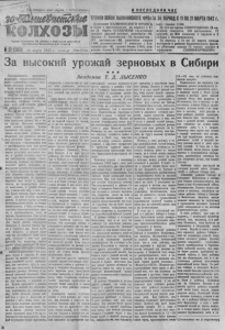 1 К Ф Л Ж О З М О р г а н С е в е р н о г о РК ВКП(б^ и Р а й с о в е т а д еп у т а т о в т р у д я щ и х с я Н о в о с и б и р с к о й об ла ст и №3 2 ( 5 8 3 ) 2 6 м а р т а 1942 г . ч е т в е р г ЦЦена 10 к о п . В П О С Л Е Д Н И Й ч а с ТРОФЕИ ВОЙСК КАЛИНИНСКОГО ФРОнГА ЗА ПЕРИОД С 1 ПО21 МАРТА 1942 Г. В о й с к а м и К А Л И Н И Н С К О Г О Ф Р О Н Т А в б о я х с п р о т и в н и к о м з а п е р и о д с 11 п о 21 м а р т а З А Х В А Ч Е Н Ы с л е д у ю щ и е т р о ф е и : о р у д и й р а з н ы х к а л и б р о в - 6 6 , т а н к о в - 5 , м и н о м е т о в — 5 4 , п у л е м е т о в - 25 7 , а в т о м а т о в — 8 8 , в и н т о в о к с в ы ш е 1 .0 0 0, р а д и о с т а н ц и й —7 , п о в о з о к с б о е- п р и и а с а м и — 42, г р а н а т б о л е е 2 . 0 0 0 , с н а ря д о в б о л е е 5 .0 0 0 , п а т р о н о в в и н т о в о ч н ы х - с в ы ш е 2 .0 0 0 З а э т о ж е вр ем я У Н И Ч Т О Ж Е Н О : 2 3 н е - м е ц к и х с ам о л е т а , 2 4 0 а в т о м а ш и н , 17 о р у д и й , д о 2 0 0 п о в о з о к с г р у з о м и 2 с к л а д а с б о е п р и п а с а м и . З а п е р и о д с 11 п о 21 м а р т а н е м ц ы п о т е р я л и в р а й о н е К а л и н и н с к о г о ф р о н т а у б и т ы м и о к о л о 12 ты с я ч с о л д а т к о ф и ц е р о в С О В И Н Ф О Р М Б Ю Р О З а высокий урожай зерновых в Сибири * * Ак адем ик Т. Д . Л Ы С Е Н К О Своевременность проведения р а з л ич ны х с ел ьск ох озя йс твен ны х р аб от — г л а вн ей ш ее условие по лу че ния выс око го у р о ж а я . Особо ва ж но е з н а ч е н и е имеет свое_вреуп рн ыи с р о к посева. Й з в & т н о немало сл уч ае в , к о г да запоздание с весенним посевом, н ап ри м ер , зе рн овы х хлебов, на т р и — п я т ь дн ей с н и ж а е т уролсаи на неск оль ко цен тнеров. 3hU $ I л и это , что , борясь за ра нн ие, с ж а т ы е ср ока посева зерновых хлебов, можно пренебрег а т ь ка че ст вом работы? 11и в к о ем сл уча е. К а че с т во весенних работ нел ьзя с н и ж а т ь . Н у ж н о п р и н и м а т ь все ме ры , чтобы соз дав ат ь н а и л у ч ш и е ус ло ви я, не обходимые для ра з в и т и я посеян ' н ы х ра с те ний. Стоит тольк о весной за поздать с боронованием или с шлейфованием зяби или плохо вабороиить, з а к р ы т ь вл аг у и этим самым д о п у с т и т ь иссушение иоч- в и , и ур о ж а й п а т ако м поле бу дет зн ач ит ел ь но с н и ж е н . Стоит, н ап ри м ер , ссылаяс ь на спешво ст ь ве с ен ни х работ, не бре жно , не- * а к к у р а т н о п ро из вес ти весновспашк у , ме лко в с и а х а т ь да еще с пло хим оборотом плас та , "вдобавок плохо забороновать, не разделать ве рх н ег о слоя почвы и, следовате льно, не пред ох ра н ит ь п очв у от вы сых ан ия , и у ро ж ай п ш е н и цы , я ч м е н я ил я овса в этом с л у чае будет п л о х и м , буде т намного н и ж е , чем п р и лу чш ем кач ес т ве работы. В даппом случае лу чш им кач еством работы буде т не мелкая вес н ов с п аш ка , а более i лу бок ая, с х ор ош им переворач ива нием пласт а, с одн овременным, вслед за п лу го м , боронованием. Еще лу чш е будет в с п а ш к а с п р е д пл уж н ик ом . Для т а ко й работы потребуется вн им ан ие и пем ного больше т р у да и го рю ч е г о для более глубо к о й в с и а ш к н . А у ро жа й будет п олу чен з н ач ит ель но более высок и й , нередко в дв а— т р н раза больший. Т а к , на п ри мер , вместо ш е с т и— семи це п тн еро в он будет 15 и больше центн еро в с ге к т а р а . я Плохая а г р о т е х н и к а — это ра с т рата т р у д а и ср едств. В т еп ерешнее же военпое время в сельском х оз яй ств е н у ж н о мобилизова ть все вн им ан ие, тр уд и средс т ва для по лу че н ия наибольшего валового у р о ж а я . Поэтому к весен ней посевной ка м п а н и и 1 9 4 2 года надо подго то вит ьс я тщ ате льно, к а к н и к о г д а , в пр