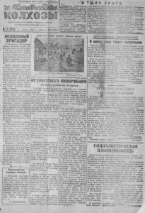 П р о л е т а р и и в с е х с т р а н , с ое ди н яй т ес ь ! I i : . ■ ж . Орган Северного РК BKFT(6j и Райсовета депутатов тр у дящ ихс я Новосибирской области j t, 1 l B Т Ы Л У В Р А Истедз^цдое - гитлеровскими гами население о кк уп иГ А № 37 ( 5 8 8 ) 1 п апреля 1942 г . с у бб ота [^Цепа 1 0 коп. рованных немцами районов расправляется с Фашистами. Так поступили крестьяне села Н. Орловской области. Они перебили топорами и вилами гр у п пу немецких солдат и офицеров, размещенных у них в селе, и целиком влились в партиза нский отряд. В другом селе партизаны и колхозники устроили засаду, готовясь встретить гитлеровс кий карательный отряд. Вне ов с флангов и тьма советские патриоты перебили (ве грети ка ротелей, а осталы six обратили в бегство. На поле 5оя осталось более 100 в р а же ск их трупов. Захвачены и с к л ю т гельно боль шие трофеи—10 ста нковых и 4 лег ких пулемета 1 орудие 2 миномета, 400 снарядов, 120 винтовок, 6 автоматов, 70 ты сяч патронов и м /о г о друго го вооружения и вое: ного иму щества. После уда чного он стихийно возник митинг. Население села КОЛХОЗНЫЙ Б Р ИГАДИР В соревновании с Вепгеровским районом ко л хо зн ик и нашего района взяли обязательство вырастить в этом году стопудовые урожаи. Эго обязательство будет выполнено с успехом теми колхозами, где будут правильно укомплектованы бригады, поставлены к их руководству честпые, проверенные люди. .Немало передовых колхозных бригадиров из нашего района уш ло па фронт с оружием к рука х громить немецких варваров. К руководству бригадами пришли по- в&с люди, порою еще не имеющие достаточного опыта в работе. Естественно, что правления колхозов, сельские советы, партийные организации должны оказать этом людям всяческую помощь делом и советом. Многие колхозные бригадиры в дни подготовки к секу показывают высокие образцы труда, сумели полвоегью подготовить бригады в севу. Демобилизованный красноармеец тов. Крпчев сейчас работает бригадиром в колхозе «Северная заря». Его бригада полностью го това к л щ е з д у н поле. Образцово подготовились к севу молодые бригадиры т т . Слесарсв (колхоз им. Ворошилова), Харитопова(кол- хоз «Красногвардеец»), Столетов (колхоз им. Карла Маркса) и многие другие. Однако в некоторых колхозах роль бригадира еще стоит не на высоте. В бригаде колхоза «Советска я Сибирь» еще пе подобраны люди, нс закреплено тягло. Подобные явления имеют место в колхозах Чебаковского сельсовета. В колхозе «Новый Сибиряк» полеводческая бригада еще совер шенно пе го тов а к севу. Необходимо к бл ижайшие дни полностью укомплект овать бригады, поставить перед бригадами, ее руководителями задачи, которые надо решать на севе. Сейчас райзо проводит курсы колхоз- пых бригадиров. Люди, выделенные па ку р с ы , должны со всей серьезностью отнестись к за ня ти ям. Эта учеба— сослужит им огромную пользу. ♦ ----------- ♦ .... и , г п«- oujumk ih im- н ; запным нападением на фашис поклялось продол к а п , воору Д Е Й С Т В У Ю Щ А Я А Р М И Я ( Ю ж н ы й ф р о н т) Жйнную борьбу с немецкими ок куп ан тами до их полного разгрома. Т у г ж е в партизанский отряд вступили десятки людей. которых вооружили отб и тыми у гитлеровцев вин тов ками и автоматами. Через несколько часов над селом появились 5 немецких бомбаодировщиков. Они сбро сили 55 бомб, превратив село ,! ГРУДУ развалин. Однако на селение и партизаны своевре- м с ю укрылись в лес и среди них жер тв не было. Ы>ЯН( 