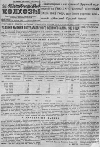 П р о л е т а р и и в се х стран, соединяйтес >! колхозы Орга н Сев ер н ог о РК ВКП (Л; и Райс ове та депу тат ов тру дящих ся Ново си би р ск ой области I I 39 ( 5 9 0 ) ; ; 1 8 апреля 1 9 4 2 г . с у б бо т а j Ц е н а ! О к о п . и 0 - 1 ' • • ' ' I мьКолховрики и колхозницы! Д р уж н о й подпиской на Г О С У Д А Р С Т В Е Н Н Ы Й В О Е Н Н Ы Й З А Е М ! 9 4 2 Г О Д А еще более укрепим мощь нашей доблестной Красной Армии! У Т В Е Р Ж Д Е Н О С О В Е Т О М НА Р О Д Н Ы Х К О М И С С А Р О В С О Ю З А С С Р 13 АПРЕЛ Я 1942 ГО ДА УЛС ВОИЯ ВЫПУСКА ГОУСДАРСТВЕННОГО ВОЕ ОГ ЗАЙМ1А942ГОДА Ч 1. Государственный Военный В1ем 1 94 2 года состоит из дв ух 1 в ь пу с к ов : выигрышного Н П О / ЦентнОП*. В ы к г | м ш п ы й вы пу с к займа 2. Двадцатилетии!! срок в ы и гры шн ою ныи>с>*а Государствен иого Воснно о займа J9 4 2 года ус тан авливается с 1 сентября 194 2 ю , а по I сентяб ря 1 9 6 2 r e ia . 3. В ы и гр ы ш н ы й выпу ск займа дел т с я на разряды по 10 0 миллионов рублен в каждом разряде. Каждый разряд состоит пз 20 ты сяч сери й. Серии каждого раз ряда име ют номера с А1 0 0 0 0 1 по & 2 0 . 0 0 0 . Облигации в каждой серии имее т номера с Л» 1 по Л* 5 0 . 4. По выи гр ыш ном у выпи ску за йм а выпу ск аются облигаций достоинством в 5 0 0 , 2 0 0 , 1 00 , 5 0 , 25 и 10 рублей. 5. Облигации достоинством в предназначен для раз ш ц е н и я среди н а с ’ лен р. Процентный вып у с к займа раз уещае тг я ср-л и сельскохозяйствен ш х , к у .т а , н.> промысловых и рыболовецких ар тел й, смешан ны х проыьклово сел'ск охо afcci ве нн ы х артелей, а т лей кооперации инвалидов, л снай, кооперации и т<нариществ но совместной обработке земли. В Ы И Г Р Ы Ш Н Ы Й В Ы П У С К 5 0 0 и 2 0 0 рублей состоят соот ветственио из 5 или двух 100 р блевых облигаций одной серпа с пит ью или деумя номерами и да юг право на 5 или дна вы и гр ыш а, которые ош в р е м е н н о падают на каждый из номере1 обозначенных на облигации. Облигация достоинством в 50, 2 5 я 10 рублей явл яются частя ми с орублевых обгигаций и да- юг право на соответствующую долю (одну вторую, одну че тверт ую , одну десятую) вы иг ры ш а, п авше ю на сторублевую облита цию. П Р И М Е Ч А Н И Е : Облигации достоинством в 25 н 10 рублей предназначены для расчетов с подписчиками лишь в тех случаях, когда го сумме подписки не могут быть выданы облигации более крупного достоинства. 6 . Выигрыши но выигрышному вып ус ку займа устанавливаются в размере 5 0 ты с яч , 2 5 т ы с я ч , 1 *10 тысяч, 5 ты с яч , 1 .0 0 0 , 5 00 и 2 0 0 рублей на сторублевую облигацию, включая нарицательную стоимость облигации ( 1 0 0 р у б л е й ). , В течение двадцатилетнего с рока займа вы иг рывает одна треть всех обли гаций, а остальные дне тр ети облигаций по гаш аю тся но их нар ицательной стоимости. Вы игр авша я облвгация погашается и ис ключается из дальнейших тир ажей. По облигациям выигрышного вып ус ка весь доход выплачивается в форме выи грышей, а по обляг, цням процентного выпус ка — в виде процентов по купонам. 7. В течение двадцатилетие!о срока по выиг рыш ном у выпус ку производится 40 тиражей вы и гры ше й— по два тиража каждый год Тиражи выиг рышей производятс я, на чи на я с 1 9 4 3 года, в с роки , устанавливаемые Народным Комиссариатом Финансов Союза ССР . Общаг, с умма выигрышей уста новлена в среднем за двадцчти- ле тн ий сро к займа из расчета 4 процентов в юд. 8. В каждом тираже в ыи гр ышей на кажд ый разряд выигрыш н о ю вы п у с к а , т. е. на каждые 1 0 0 миллионов рублей этого вып у с к а за йм а, разыгрывается следующее количество выигрышей: Р А З М Е