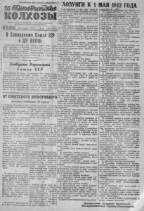I UjO Пролетарии всех стран, сбёдцняЯтсь шШтФтшЫ колхозы Орган Севе рн ого РК В К П ^ и Райсовета депу татов т р у дящихся Новосиб ирск ой области * 4 2 (593 ) j 2 9 ап ре ля 1 9 4 2 г . среда ЦЦ е п а ! о к о п в Совнаркоме Союза СР и ЦК ВКП(б) В ви д у м н о г о ч и с л е н н ы х з а я в - о б о р о н у с т р а в ы , С о в е т Н а р о д л е н и й т р у д я щ и х с я о ж е л а т е л ь - н ы х К о м и с с а р о в С о н г и Г Г Р ■ п о с т о б ъ я в л е н и я в т е к у щ е м г о д у 1 и 2 М а я р а б о ч и м и д н я - 4 н т р а л ь н ы й К о м и т е т В К П ( б ) м и в с в я з и с в о е н н о й о б с т а н о в - п о с т а н о в и л и : о б ъ я в и т ь в т е к о й , т р е б у ю щ е й о т в с е х т р у д я - 1 к у щ е м г о д у 1 . и 2 М а я р а б о ч и щ и х с я н а п р я ж е н н о г о т р у д а н а | и и д н я м и . Сообщение Наркомфина С о ю з а С С Р В ы п у щ е н н ы й 1 4 а п р е л я с . г . Г о с у д а р с т в е н н ы й В о е н н ы й за е м 1 9 4 2 г о д а н а с у м м у 1 0 м и л лиа р до в р у б л е й р а з м е щ е н н а 2 3 а п р е л я в к л ю ч и т е л ь н о , т . е . з а 1 0 д н е й , н а 1 2 м и л л и а р д о в 8 6 0 м и л л и о н о в 8 3 1 т ы с я ч у р у б л е й . У с т а н о в л е н н а я с у м м а з а й м а п р е в ы ш е н а н а 2 м и л л и а р д а 8 6 0 м и л л и о н о в 8 3 1 т ы с я ч у р у б л е й . В с в я з и с э т и м Н а р к о м ф и н СССР, н а о с н о в а н и и у к а з а н и я с н к СССР, р а с п о р я д и л с я д а л ь н е й ш у ю п о д п и с к у н а Г о с у д а р с т в е н н ы й В о е н н ы й з а е м 1 9 4 2 г о д а с 2 5 а п р е л я 1 9 4 2 г о д а п р е к р а т и т ь п о в с е м е с т н о . О Т С О В Е Т С К О Г О И Н Ф О Р М Б Ю Р О В е ч е р н е е со о бщ е н и е 26 а пр е л я В т е ч е и в е 2 6 а п р е л я н а фрон т е - ч е г о - л и б о с у щ е с т в е н н о г о не про из ошл о. За 2 5 а п р е л я у н и ч т о ж е н о 2 1 н е м е ц к и й с а м о л е т . В а ш и п о те ри — 1 0 са м оле тов . Н а ш а ко ра б л и п а Ба реп цок ом море п от о п и л и подво дну ю ло дку п р о т и в н и к а . За 2 5 а п р е л я ч а с т я м и н а ш е й ав и а ц и и у н и ч т о ж е н о ил и п о в р е ж дено 2 0 н е м е ц к и х а в то м а ш и н с во йс кам и и гр у з а м и , 6 полевых о р у д и й , вз ор ва н аселезнодоро_ ны й эш ел о н , р а сс ея н о и ча сть ю у н и ч т о ж е н о до 2 рот пех оты п р о т и в н и к а . Н а ш а ч а с т ь , д е й с т в у ю щ а я н а одном из у ч а с т к о в К а л и н и н с к о г о Фр он та, у с п е ш н о от би ла 2 а т а к и г и т л е р о в ц е в , п о д д е р ж а н н ы х т а н к а м и . Н а ш и бо йцы , не дав возмож н о с т и н е м ц а м оп ом н ит ь ся и п р и ве ст и себя в п о р я д о к , ворвались и выбили ги тл е ро вц ев из д ву х н ас е л е н ны х п у н к т о в . У н и ч т о ж е н о 3 н е м е ц к и х т а п к а , 5 м ин о ме тн ы х б ат а ре й и о р у д и е . За хв а че ны тро феи п п л е н н ы е . Н а поле боя осталос ь св ыш е 3 0 0 в р а ж е с к и х т р у п о в . Н а одном и з у ч а с т к о в Запа дно т о фро нта ог н е м со ве тс ко й а р т и л л ер ии р а з р у ш е н о н ес кол ько н е м е ц к и х Д ЗО Т' о в и у н и ч т о ж е н о до 1 6 0 н е м е ц к и х ' солдат и оф и ц е ров. Н а д р уг о м у ч а с т к е фронта н а ш и а р ти л л е р и с ты расс еял и боль Шую ко л о н н у в р а ж е с к о й пе х от ы . М е т к и м ог н е м б ат а р еи п о д о ж ж е н к р у п н е й с к л а д боеприп ас ов п р о т и в н и к а . Взрывы был а с л ы ш ны в т е ч е н и е 2 0 м и н у т Азобко ва у н и ч т о ж и л а 3 5 н е м е ц к и х ттр от ив от а вк ов ы х ор у д и й , 1 2 т я ж е л ы х о р у д и й , 8 з е н и т н ы х о р у д и й , 9 т а н к о в и б р о н е м а ш и н , 1 9 п у л е м е т н ы х г н е з д , р а з р у ш и л а 1 7 Д З О Т 'о в и н ан ес ла боль шой у р он ж и в о й силе п р о т и в н и к а . 1 8 кр ас но ар м ей ц ев ра зв ед чи к о в , воспользовавшйсь т у м а н о м , п р о н и к л и в тыл п р о т и в н и к а . В р а й оне н ас ел ен н