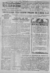 луси&ъч ¿tecL. П р ол ет а р ии в сех стра н , соединяйт\ 2йЩ%А колхозы О р г а н С е в е р н о г о Р К ВКП(б,| и Ра й с о в е т а д еп у т ат о в т р у д я щ и х с я Н о в о си б и р ск о й обла сти i 45 (596) ; 7 % а я 1 9 4 2 г , четве рг ¡ Ц е н а Ю т . О Б Л А С Т Н А Я I !>ИеК<?лхо^|^ки и колхо зницы, агрономы и зоотехники! -‘Уен ешное проведение весеннего сева равно крупной победе на фронте. Р або тайте на полях не покладая рук! Бори тесь за высокие урожаи и продуктивность животноводства! Давайте фронту и стране больше х леба , мяса , сырья для промышленности! ( И з л о з у н г о в Ц К В К П ( б ) к 1 М а я 1942 r o í a ) . ПАТРИОТИЧЕСКИЙ ПОЧИН САМООТВЕРЖЕННЫМ ТРУДОМ ОЕБСПЧЕИМ ПОР ВДЕНЕ ИЕСЕВА В СЖАТЫЕ СМИ! З А Г Р И Г п п ^ Е А1 « Т ? и Ь^ Лг1й 0 Л Н У Ю М О Щ Н О С Т Ь , М А К С И М А Л Ь Н О И С П О Л Ь З О В А ТЬ НА П О Л Е В Ы Х Р А Б О Т А Х Ж И В О Е Т Я ГЛО РАБОТАЙТЕ ТАК, К А К РАБОТАЮТ ВОРОШИАОВЦЫ! В к о л х о з е им . В о р ош и л о в а зако нч ил и сев пшеницы Нц -д н ях в наше й газ ете было он убл и кона но обращение членов сельхозартели им. 11. К. К р у п ск ой, В ы се л к ов '' к ог о района, Кр ас но дар ско го к р а я , ко всем ко л хо зн ик ам Советского Союза о посеве сверх пла н а ге кт аро в в фонд обороны и помощи к ол х оза м н ко л хо зн ик ам районов, осво божденных от немец ких з а х ва тчиков. Пр из ыв кра сн од арс к их к о л х оз ни к ов нашел- живейший о тк лик во всех кол хозах нашей стр ан ы. Т ы с я ч и колхозов уже засе яли дл я этой цели определе нны е у ч а с т к и с к от оры х они обязал ис ь весь урожай передать для Кр ас н о й Ар м и и и о к аз ани я по мощи к о л хо зн ик ам районов, осв обож денных от фаш ис тс к их из вер го в. В на ш ем районе п ер вы м и на пр из ы в краснода рск их кол хозни ков о т к ли к н у ли с ь кол хозы Би- ази нс ког о сельсо вета. Здесь уже н а ч и н а е т с я посев гек та р ов сверх пл а н а , ур о ж ай с к о т о р ы х по йдет в фонд Кр а сн о й Ар м и и и помощи осво божденным колхозам и кол хо зн ик ам. Нет ни к ак ог о сомнения, что пат р ио ти че ск ий при ме р пер едовых колхозов б у дет по дхв аче н всеми колхо зами райо на. Во зможнос ти для этого вм ею тся по всю ду . В каждом колхозе им еет ся в достаточном кол иче ст ве земля. На йд у тс я и семена. Боевая за дача па р т и й н ы х , сове тс ких, ком сомольских о р г а н и з ац и й, политотделов М Т С — о р г ан из ов а ть в каждом колхозе обсуж дение обращения кр ас но д а р с к и х колхозн иков , пом очь в ор га ни з аци и св ер х пл ано вы х п о севов в каждом колхозе. Т о вари щ и к о л х о з н и к и! Усили м по мощь фро нт у. Посеем в каждом колхо зе све рх план а у ч а с т к и в фонд обороны и по мощи кол хоз ам и к ол хо зн ик ам, п о стр ад ав ш им от фаш ис тск их изве рго в. Дружно к ипи т работа па пол я х колхоза им. Ворошилова, Биа- зинского сельсовета. Люди работают по -военному, с темна до темпа, не считаясь со временем. Лошади, рогатый скот используются на полевых работах с макси мальпой нагрузкой. Все колхозники борются за ту, чтобы быстрее ‘закончить сев, обесп.-чить получение высокогс урожая, дать страпе, фронту как можпо больше хлеба Подавляющее большинство колхозников перевыполняют пормы выработки. Ста ха вовсквй тр уд дает свои результаты. Вчера колхоз закончил сев пшеницы. Ее посеяво 100 гектаров. Кроме того засея по свыше 30 га овса. Сев овса продолжается нарастающими темпами. Заготовленной земли имеется около 10 0 гек таров. Колхозники решили сверх плана засеять в фонд обороны и помощи колхозам, освобожденным 