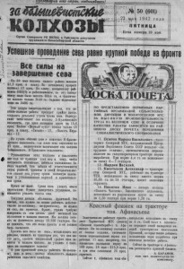 З А Б О Л Ь Ш Е В И С Т С К И Е К О Л Х О З Ы 22 мая 1942 г. № s6 ( Ш ) ТЕКУЩАЯ ДЕКАДА—ФРОНТОВАЯ! Р або та ть по-военному, день и ночь, завершить сев в каждом колхо зе ! 1 Успешно идут полевые работы О р г а н и з о в а н н о ид ет ра бо та н а н о л я х к о л х о з а « П р а в д а » , П р в б с л в н с к о г о сель» с о в е т а . К о л х о з н и к и р а б о т а ю т п о - в о е н н о м у , бое вы е з а д а н и я в ы п о л н я ю т с я . Т р а к т о р и с т ы т т . Г е р л и ц и Р е п в с п а х и в а ю т з а с м е н у на к ол ес н ом т р а к т о р е но 4 г е к т а р а и б ольш е, п р и но рм е 3 , 4 , Х о р о ш о и д е т бо ронован ие н а кор ов а х . Бо рон ов од ок и т т . И л ь де ри ва , С м и р н о в а , А н д р е е в а с и с т е м а т и ч е с к и п е р е в ы п о л н я ю т н о р м ы в ы р а б о т к и . Х о р о ш о по с та в л е н а а г и т м а с с о в а я р а б о т а . Е е п р о в о д я т п о л и т р у к Д е й с т в у ю щ е й а р м и и т . К у л а ч к о в , в е р н у в ш и й с я в к о л х о з с фронт а по сле р а н е н и я . В . П О Д Ж У Н А С , ПривлечьМорозова к ответственности 1 7 м а я в 11 ч а с о в в е ч е р а в кол хо зе 1м. 6 - г о с ъ е зд а Со вет ов у т р а к т о р а в ы ш ло м а с л о . Ср о чно Оыл в ы с л а н н а базу у ч е т ч и к Мор озов, к о т о р ы й д ол ж ен был не м ед л ен н о п р е д с т а в и т ь м ас ло к т р а к т о р у . Н о Морозов п о с т у п и л не ч е с т н о . Он обм а н у л б р и г а д у , подвел с в о и х т о в а р и щ е й . С а м о е большое он до лжен был в е р н у т ь с я с м а с лом че рез ча с . Н о Мор о зо в д о с т а в и л м а с ло к т р а к т о р у т о л ь к о че ре з 1 0 ч а с о в . О к а з ы в а е т с я , чт о, п о л у ч и в ма с ло , еа з а в а л я л с я на с т а н с н а т ь . И т о л ь к о у т р о м к 8 ч а с ам п р е д с т а в и л м ас ло к . т р а к т о р у . П о с т у п о к Морозова— эт о п о с т у п о к ч е л о в е к а , у м ы ш л е н н о с р ы в а ю щ е г о пл а н се ва . Н у ж н о п р и в л е ч ь Мор о зо ва к с т р о гой о т в е т с т в е н н о с т и . и . П Е Т И Н . Д у м а ю т ли с е я т ь в к о л х о зе „ В е р н ы й п у т ь " С а м ы м о т с т а ю щ и м по с е в у в ра йо не я в л я е т с я Б - К у л и к о в с к и й се ль с о ве т , а в се ль с о ве т е с а м ы м о т с т а ю щ и м — к о л хо з « В е р н ы й п у т ь » ( п р е д с е д а т е л ь т . М и л о ви д о в ) . П л а н с е в а по кол хо з у с о с т а в л я е т 9 6 7 г е к т а р о в . Н а 1 9 м а я б ы л о п о с е я но вс ег о т о л ь к о 1 3 7 г а . Боевое з ад а ние н а ч е т в е р т у ю п я т и д н е в к у с о с та в л я л о 3 2 0 г а . В с р е д н е м в д ен ь надо был о з а с е в а ть 6 0 г е к т а р о в . С ро к о к о н ч а н и я се в а — 2 9 м а я . В к олхо зе и м е л и с ь все у с ло ви я к т о м у , чт об ы с ч е с т ь ю с п р а в и т ь с я с з а д а н и е м , з а к о н ч и т ь се в в у с т а н о в л е н н ы е с р о к и . З д е с ь и м е е т с я 5 т р а к т о ров, 3 3 л о ш а д и , в ра б о ту м о ж н о в к л ю ч и т ь до 7 0 — 8 0 к оро в . Р а б о ч и х р у к т а к ж е х в а т а е т . Но од н а к о , в с я э т а с и л а не и с п о л ь зо вана . Н а п а х о т е вс ег о з а н я т о 1 8 лош ад ей , п а к о р о в а х п о ч т а по ра б о т аю т . З а л о ш а д ь м и н е т на д л е ж ащ е г о у х о д а , хоро шее с е н о с к о р м л е н о зим ой , а с е й ча с л о ш а д е й к о р м я т г н и л ы м се ном . Т р у д о в а я д и с ц и п л и н а о т с у т с т в у е т . П р е д к о л х о з а М и л о в и д о в не п р и н и м а е т м е р к т о м у , ч т о б ы в ы п р а в и т ь п о л о ж е н и е , он л е г к о по дд а ет с я о т с т а л ы м насъ» р о е н и я м , ие д а е т о т п о р а л о д ы р я м , р в а ч а м . 2 0 м а я на в ы ез д но м з а с е д а н и и рай» к о м а п а р т и и бы л и в ы я в л е н ы п р и ч и н ы о т с т а в а н и я к о л х о з а н а с е в е , у к а з а н ы п у т и пр ео до ле ни я э т и х о т с т а в а н и й . Пред* се д а т е л ь к ол хо 