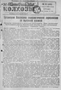 П р о л е т а р и и в с е х Ор ган С е ве р н о г о РК ВКП(б^ и Ра йс ов ета д еп у та т ов т р у д я щ и х с я Н о в о с и б и р с к о й об лас ти Ш Организуем Всесоюзное социалистическое соренвование за высокий урожай Обращение колхозников и ко лхозниц сельхо зартели „ Чи стоозерного ра йона , Новосибирской ко всем к о лхо зникам и колхозницам Советского Союза > Д о р о г и е т о в а р и щ и ! ^ Весь наш народ , к а к о ди н че ло ве к , * подняло-« п р о т и в г и т л е р о в с к и х меряая- M i e B . К а к о й заво д, ф а б р и к у , ш а х т у ни в о з ь м и , — везде одна заб ота , одно ж е л а н и е — п оса дить на цепь бе ш е н ны х н е ме цко ф а ш и с т с к и х пс ов, п р о у ч и т ь и х , чтобы пе з а р и л и с ь ва н а ш у с о в е т с к у ю землю, б и т ь и х , о к а я н н ы х и з о всех сил д* полпого и с т р е б л е н и я . П р и к а з в о ж д я н а ш е го тов а р ищ а Стали на — e c u . па ш е к р о в н о е , к о л х о з ное ж е л ан и е . Н е м е ц к и е помрщики, коя- и ба р оны и и х ф а шист ск ие и р в х в ъ е ш и мн о го п р ол ил и дорогой с о в е т с к ой к ро в и . Мало ли о н и детей н е в и н н ы х з а г у б и л и , дочерей н а ш и х обе сч ео т и л и , с т а р и к о в ос ра ми ли и за м у ч и л и . ш ь Наше кол хо зн ое слово коротко е и всем ^ Р ж е л а п п о е : Довольно р ы с к а т ь пеме цс им волкам по со в е т с к о й земле. В ся н а ш а ст ра н а с т ен ой п о д н я л а с ь на раз гром в р а г а , рабочие де нь и н о чь , не с м ы к а я гл а з , у с т а н к о в , у доме н, у м арте но в, в р у д н и к а х т р у д я т с я . А разве м ы , к о л хозное к р е с т ь я н с т в о , о тс т а н е м , разве мы си лы своя дл я общего народного дела, для с ч а с т ь я своего, для детей > св о и х п о ж ал е е м ? ! То в ар ищ и к о л х о з н и к и ! Продовольствие, с е л ь с кох о з я й с т в ен н ое сы рь е н у ж ны фр о н ту т а к ж е , к а к во ор уж ен и е и бо е п ри п а сы . Н а ш у до р о гу ю К р а с н у ю Арм ию надо с ы т н о к о р м и т ь , одевать , обув ать , всем необходимым сн а бж а ть . Хлеб и м я с о , — это п и т а п и е н аше го за щ и т и л ка - б о й ц а . Х л о п о к — это порох и одежда. К л е щ е в и н а — эт о смазочное для самоле ов, м а с л и ч н ы е к у л ь т у р ы — это пр од ов оль стве нн ы е и т е х н и ч е с к и е масла, к о к - с а г ы з - э т о рези на . От н а с , к о л х о з н и к о в , зав и с и т во м н о го м , н а с к о л ь к о хорошо буд ет с н а б ж а т ь - ' ся наша родная К р а с н ая А р м и я х л е бом, мя сом , маслом, овощами, к ар т о фелем, от на с з а в и с и т во многом бу д у т ли с ы т ы рабочие пром ыш ле нн ос ти и т р а н с п о р та и м и сами и наша дети. Наш кол х о з « П у т ь к р е с т ь я н и н а » реши л впес тл свою долю в э то общенародное дело. Н а г р а ж д е н и е п е ре до в и к ов сель ског о хо зя й с тв а Сибири и К а з а х с т а н а воодуш евило всех нас на новые трудов ые п о ш и т . С к а ж д ы м днем у н ас р а с т у т ряды двухсо т пи к о к , т р е х с о т н и к о в . Не кот о ры е н а ш и к о л х о з н и к и в ы р а б а т ы в а ю т па по левых работах т р и и более н о рм ы. С большим усердием и у м ени ем т р у д я тс я н аши к ол х о з н и цы В дни войны ж е н щ и н ы в колхозе с т з л и особенно в а ж н о й . реша ющ ей сил о». Они заменили м у ж ч и п . уТпедших ^ о р у ж и е м в р у к а х на фронт защ ищ а ть родную землю. Все т р у д н о с т и готовы и ере не ст и ж е н щ и н ы н а ш е го колх оза, л иш бы ск ор е й п о к о н ч и т ь с п е м е ц к о -ф иш и с т с ко и сворой в о т п л а т и т ь ей за все г о р ь к и е ма т е р и п - с к в е слезы . Мног ие из в а ш и х колх озн и ц к а ж д ы й день п е р е в ы п о л н я ю т задан и я , но рм ы, т р у д я т с я не п о к л а д а я 