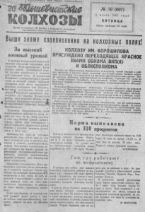 п р о л е т а р и и в с е х ст р а н, с о е д и н я й т е с ь ! к о л х о з ы О р г ан С ев ер н о г о РК ВКП(б> и Райсов ета д еп ут а т о в т р у д я щ и х с я Н о в о си б и р с к о й об ла ст и " № 56 (607) 5 и ю н я 1942 г о д а П Я Т Н И Ц А Ц е н а н о м е р а 10 к о п . Выше_знаия соревнования на колхозных полях! З а высокий в о ен ны й у р о ж а й И пр ош ло м н о м е р е на ш е й г а з ет ы оп уб л и к о в а н о о б р а щ е н и е к о л х о з н и к о в с е л ь х о з а р т е л и « П у т ь к р е с т ь я н и н а » , Ч и с т о оз ерно го р а й о н а , Нов о си бир ск ой облас т и , ко вс ем к о л х о з н и к а м и к о л хо з н и ца м С о в е т с к о г о Союза об ор г а н и з ац и и В с е с о ю з н о ю с о ц и а л и с т и ч е с к о г о с ор ев н о ва н и я за в ы с о к и й у р о ж а й , образцовое пр о ве д ен ие в с е г о ц и к л а с е ль х о з р а б о т , д ос р оч но е в ы п о л н е н и е в с ех об язат ель - ■ с т к * п е Т О г о с у д а р с т в о м . С е го д н я п у б л и к у е т с я о б р а щ е н и е к о л х о з н и к о в с е л ь х оз ар тели им. С т а л и н а , К у с а л и н е к о г о р а й о н а , А л м а - А т и н с к о й об лас ти, об <>»*• I Г а н и з а ц и и Вс е с ою з в о го с о ц и а л и с т и ч е Ы Ь - го с о р е в н Ш п и я р а б о т ни к о в к о л х о з й ш ж и во тн о во д с тв а . Т р у ж е н и к и с о ц и а л и с т и ч е с к и х по лей с а м о о т в е р ж е н н о ра бот аю т на п о л я х , о т д аю т все с и л ы н а то , чтобы п о л у ч и т ь в -этом году в ы с о к и й у р о ж а й , с на бд ит ь с т р а н у , ф р о н т всем не об ход имым , с ч е с т ью в ы п о л н и т ь п р и к а з т о в а р и щ а С т а л и н а о ра з гр о ме н е м е ц к и х з а х в а т ч и к о в в 1 9 4 2 го д у . Мобилизуя , вс е с ил ы на у с п е ш н о е з а в е р ш е н и е с е в а , с е й ч а с надо во вс ю ш и р ь р а з в е р н у т ь ух од за п о с е в а м и , подг о т о в к у к с е н о к о с у , хле бо убо ро чн ой к а м п а н и и . Побе ди те ле м с ор ев н о в ан и я б у д ет с ч и т а т ь с я т о т ко лхо з , к о т о р ы й п е р е вы п о л н и т г о с у д а р с т в е н н ы й пл ан у р о ж а й н о с т и / р а з в и т и я ж ив о т н о в о д с т в а , дос рочно в ы п о л н и т свои о б язат ельс тва перед ю с у д а р с т в о м . О б р а щ е н и е с е л ь х о з а р те л и « П у т ь к р е с т ь я н и н а » в с тр е ч е н о вс ем и к о л х о з н и к а мп с о г р о м н ы м п одъ ем ом . З а д а ч а п а р т и й н ы х о р г а н и з а ц и й , по ли то тдело в МТС з а к л ю ч а е т с я в том , чтобы обс удит ь обр а щ е н и я о со р е в н о в а н и и я к аж д ом колхозе , д о б и т ь с я , чтобы вне э т о г о зам е ч а т е л ь н о г о с о р е в н о в а н и я пе ос тало с ь ни одного к ол хо з а , к о л х о з н и к а , к о л х о з н и ц ы . . В ы ш е со р ев но в ан ие за в ы с о к и й во енн ы й у р о ж а й ! Да дим фронту и с т р а не с т о л ь к о с е л ь с к о х о з я й с т в е н н ы х п р о д у к т о в , с к о л ь к о эт о надо для ра з гр о ма в р а г а ! КОЛХОЗУ ИМ. ВОРОШИЛОВА ПРИСУЖДЕНО ПЕРЕХОДЯЩЕЕ КРАСНОЕ ЗНАМЯ ОБКОМА В К П (б ) И ОБЛИСПОЛКОМА Ко лх оз им. Вор ошило ва , Бназинского с ел ь с ов е т а самый пРт<».й о Ш Ш Ш Ш Щ ттшшшшт Почетными г р амо т ам и облисполко ма награж дены т ак же к о л х п м ш . . « С и р т . f«eBL ° e X ae 7 Г т Г 7 Т ^ Т « 1еЛЬНоГ° ’" * Г в г му на 170 про,,. Ь о р о Г о в о л о к Г т т Р Исак^ва А Рл В^ Г П° ЛНЯЙШИЙ " ° Р - на к о р о в а х на 150 п р о ц ш Г л м . д г ^ ; . / ' ' выполнявщая нормы норму выраб отки „а 160 п роц ' выполнявшая t о рм а в ы п о л н е н а на 310 процентов Б ри г а ди р по ле во дч ес кой б р и га ды с е л ь х о зар тели « П а м я т ь Ки ро ва» В а с и л ь е в Л. II. по п р а в у с ч и т а е т с я л у ч ш и м с е я л ьщ и к о м к ол хо за . Н а р учн ом севе он с и с т е м а т и ч е с к и в ы п о л н я е т нормы вы р аб о тк и на 1 5 0 — 2 0 0 п