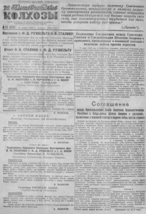 Пролетарии всех стран, соединяйтесь! Ш а Ф ш В к Ы Ни яжозьв Орган Северного РК ВКП(б^ и Райсовета депутатов трудящихся Новосибирской области „ П р и в е т с т в у я м у д р у ю п о л и т и к у С о в е т с к о г П р а в и т е л ь с т в а , н а п р а в л е н н у ю к п о л н о м у р а з г р о м у г и т л е р о в с к и х р а з б о й н и к о в , с л а в н ы е п а т р и о т ы н а ш е й р о д и н ы о б я з у ю т с я е щ е б о л ь ш е н а п р я ч ь с в о и с и л ы , е щ е с а м о о т в е р ж е н н е е т р у д и т ь с я д л я т о г о , ч т о б ы у с к о р и т ь п о б е д у н а д . “ №59 (610) 18 июня 1942 г. четверг ЦЦенаЮвон. ( „ П р а в д а " ) . Послание г. Ф . Д . Р У З В Е Л Ь Т А И. В . СТАЛИНУ Я очень благодарю Ва с за посылку господина Молотова с ще т н е и м я , ч о то е б г ы о б п л о а в г и о д п а о т л ь уч м н е о н м я, и пр я иб с ы ^е ти те и рп о ен бр и а е т м но ож в и С д о аю в ет с с о к о и б й С о ю з . Ви зит к нам был весьма удовлетворительным. Подписание Соглашен ия между Советским С о ю з о м и Соединенными Штатами Америки о принципах , применимых к взаимной помощи в веденнии войны против агрессии 3 Ответ И. В. С Т А Л И Н А г. Ф. Д. Р У З В Е Л Ь Т У у Сов ет ск ое Пр авительс тво т а к н « , как и Вы , господин Пре- 4 зидент, счита ет , что результаты визЬта В. М . М ол ото ва в С Ш А ^ были вполне удовлетворительны. 5 По ль зу ю сь случаем, чтобы от. имени С ов ет ск ог о Праии- * тельства выразить Вам, господин Президент, искреннюю бла- V годарность за тот сердечный прием, который Вами был ока- ^ зан В . М . Молотову и его спутникам за все время их пребы- ч:> вания в С Ш А . В . М . Мол ото в сегодня вернулся в М о с к в у . Те легр ам мы Н арод ног о Комисс ара Инос транных Дел В. М. М О Л О ТО ВА г. У . ЧЕРЧИЛЛЮ и г. А . ИДЕ НУ г. У И Н С Т О Н У Ч Е Р Ч И Л Л Ю Премьер-Министру В ь т к о б р ш п а н ш , л о н д о » - * Покидая приделы Великобритания, я сч -таю своим долгом выразить нскревнюю благодарность Брит анскому Пра вительству п Вам лично за тот сердечный прием в 'адушпое гостеприимство, которые были оказаны мае в Ва ше й стране. Выражаю уверенность в том, что заключенный между Советским Союзом и Великобританией Союзвый Договор а дос тигнутая »договоренность по вопросам, относ ящим ся к созданию второго фронта в Е в р о н П н 1 9 4 2 го ду, значительно у ск ор ят полный разгром гитлеровской Германии и являюцСя выражением глубокого стремления н аш и т народов к тесной дружбе и широкому сотрудничеству. Примите, господин Премьер-Мипистр. мои луч ше е пожелания Вам и народам Великобритании. В . М О Л О Т О В . г. А Н Т О Н И И Д Е Н У , Ми ни стру Иностранных Д е В е л и к о б р и т а н и и , Л О Н Д О Н Перед тем, к ак по кв пу ть Великобританию я пользуюсь случаем выразить Вам сердечпую благодарность за Ваше дружественное »сотрудничество во время переговоров в Лондоне, столь успешно закончи вш ихс я подписанием Договора между СССР и Великобританией о Союзе и взаимной военной помощи. Я не сомневаюсь, что этот Договор явит ся прочной базой для дальнейшего разви ти я союзпых др ужественных отношении между на шим и странами и послужит общему делу свободолюбивых пародов, к а к во время г.ойпы с гитлеровской Германией т а к и в послевоенный период.. В . М О Л О Т О В . Т е л ег р ам мы На ро д ного Комиссара Ино странных Дел В . М. М О Л О ТО В А г. Ф . Д. Р У З В Е Л Ь Т У и г. К. Х ЭЛЛУ Г о с п о д и н у Ф р а н к л и н у Д . Р У З В Е Л Ь Т У , Президенту Соединенных Шт ат ов Америки , В А Ш И Н Г Т О Н . Возвращаясь на родину, я позволяю себе еще раз выр