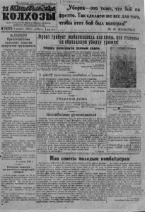 колхозы О р г а н С е в е р н о г о Р К В К П ( б ) и Р а й с о в е т а л о п у т а т о * т р у д я щ я х с в Н о в о с и б и р с к о е о б л а Л и 1 7 0 ( 621) 8 авгуота 1942 г. суббота | цеНа J БЙб/И0ТЕК/? | „У б о р к а— это то ж е , что бой на ф ронте. Т ак сделаем ж е все для того, чтобы это т бой был выигран!“ М. И. КАЛИНИН. М . К А Л И Н И Н Председателям сельских советов депутатов трудящихся Т о в а р и щ и пред с ед ат ел и с е л ь с к и с о вето в д е п у т а т о в т р у д я щ м х е я ! В э то м г о д у я в т ор ой раз о б р а щ а ю с ь к ва м . Перв ое мое о б р а щ е н и о ка с а л о с ь п р о в е д е н и я в е с е н н е г о се ва . К а к в вд ет е, п р и рода х о р о ш о в о з н а г р а д и л а к о л х о з н и к о в я вас з а х о р о ш и е т р у д и . У р о ж а й в ы ш ел о т л и ч н ы м . Т е п е р ь з а д а ч а — у б р а т ь е г о с во ев ре м ен н о* у б р а т ь б е з т а к н а з ы ва ем ы х п р о и з в о д с т в е н н ы х п о т е р ь . Э т о сд ел ат ь п с т а к л е г к о , п р и н и м а я во в н и м ан ие и с к л ю ч и т е л ь н у ю до ж д л и в о с т ь и это м г о д у . Мне и з л и ш н е н а п е н и т ь вам от ч е г о и гд е п р о и с х о д я т п о т е р и . Эт о вы з н а е т е л у ч ш е м е н я . Одно м о г у с к а з а т ь , что п о т е р я д е с я т и ко ло сь ев н а к в а д р а т н ы й м ет р с о с т а в л я е т , п о п одс чет ам н а р к о м а т а зе м л е д е л и я , в целом п о с т р а н е , з д т н н м и л л и о н о в - п у д о в . Т а к о й р о с к о ш и в это м г о д у м ы н и в ко ем с л у ч а е п о з в ол и ть себо н о м о ж е м . П от ер ь б ы т ь н е д о л ж н о , д о п у щ е н и е п от ер ь п р и у б о р к е о т ч е г о бы т о н н б ы - ло в э то т р у д н о е дл я с т р а н ы вр е м я о з н а ч а е т п р е д а т е л ь с т в о ин т е р е с о в р о д и н ы , н о ж в с п и н у К р а с н о й А р м и я . Г и т л е р о в с к и е р а з б о й н и к и в в е р г л и с п о ю с т р а н у и в с ю Е в р о п у в м у к и г ол од а. О ни т о п ч у т в а ш и Самые б о г а т ы е хл еб ные р а й о н ы н дум? ю т т х е р и т ь н а с г о лодом. Н о э т о м у не б ы в а т ь , н а ш н а р о д н е д о п у с т и т . Т о в а р и щ и п р е д с с д .г е л и с е л ь с к и х с о в е т о в , в а ш д о л г п ер ед р о д и н о й об е с п е ч и т ь с в о е в р е м е н н о е н а ч а л о у б о р о ч н ы х ра бо т , п р и в л е ч ь все тр у д о с п о с о б н о е н а селение к у б о р к е у р о ж а я , и с п о л ь з о в а т ь все в о з м о ж н о с т и дл я т о г о , чт о б ы о в а л ь ны й у р о ж а й бы л со б р а н без п о т е р ь . Это к а с ае т с я в е ^ т о д ь к о з е р н о в ы х к у л ь т у р , не и о в о щ е й . Х о р о ш а я у б о р к а у р о ж а я , э к он ом но е р а с х од ов ан ие п р о д у к т о в п в т з н н я , э т о в ы и г р ы ш з н а ч и т е л ь н о г о с р а ж е н и я а вой не в ф а ш и с т с к о й б а н д о й . У б о р к а - э т о т о ж е , чт о бой н а фр он те. Т а к сделае м ж е вс«, ч т об ы э т о т бой бы л в ы и г р а н . П р о ш у о з н а к о м и т ь с м ои м * п и с ь м о * * п ред с ед ат ел ей к о л х о з о в , а если в о з м о ж но и все х к о л х о з н и к о в . 4 а в г у с т а 1 5 4 2 г . Успешная подписка на д е н е ж к о - в е щ е в у ю л о т е р е ю В иашг-м рабове подп ис ка на 2 - ю ден ежн о-в ещев ую ло т ер ио прошла с бо ль ша я успехом. На 5 ай Г ус т а сумма поди с к и дост игла 2 0 « ' т ы с . р у б ., что па 10 т и с руб. превыс ило перс опач альвое предположен ие. Рабочие -п с л у ж а щ и е под писали сь на 35 т и с . р у б . , ко лхо зн ики - «а 6 5 тыс . рубВ с чет оп ла т ы подписки п ос ту пил о 5 2 т ь с . руб. н а л ич ны м и. Впереди идет Ир вб ел вн ск я й сельсовет, где на ли ч ны ми в с че т п о д п и с А по ст уп ал о 76 проц. Фронт требует мобилизовать все силы, все розелвы _ _ _ на образцовую убориу урожаи! - У б о р к у разв ерн ул и полным х одом В Б и а з