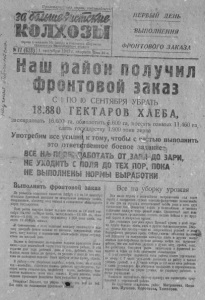 __ П р о л е т а р и и тех с о е д и н я й т е с ь ! к о я ж о з и П Е Р В Ы Й Д Е Н Ь В Ы П О Л Н Е Н И Я 1 О р г а н С е в е р н о г о И{ ВХ н Р н Н м в е т а ^ п Г т а т о в $ —С- —— ________ ТРУДЯДЬИ^см Н о в о с и б и р с к о й о б л а с т и * !^77-(6^8)¡1 1 с е н т я б р я 1 9 4 2 г . в т о р н и к Ццена 1<Гк7 Ф Р О Н Т О В О Г О З А К А З А | Н а ш р а й э :й » г фрокт ов® п о л у ч я л т заказ г С ! П О Ю С Е Н Т Я Б Р Я УБРАТЬ Г 18 .880 Г Е К Т А Р О В Х Л Е Б А , заскирдовать 16.600 га, обмолотитьяГхбОО га, посеять озимых 11.460 га сдать го сударству 1.900 тонн зерна Употребим все усилив к тому, чтобы с «г^тью выполнить За о о гвет^гйенное боевое задание?? ВСЕ НА> ^ А Б О Т А Т Ь О Т ,М Р Л ДО ЗАРИ НЕ УХО ДИ ТЬ С ПОЛЯ ДО Т Е Х ПОР, ПОКА НЕ ВЫПОЛНЕНЫ Н О РН Ы ВЫ РАБО ТКИ Выполнить фронтовой заказ П о р о ш е п и ю обла стн ого к о м и т е т а В Щ б ) с 1 п о 1 0 с о п т я б о з о б ъ я в л е н фро н то во й д е к а д н и к п о з а н е р щ е ш т к о с о в и ц ы Злобой Г ■— , г “ " *>> П015?лл (,оевое э д п л е своситв за 10 дней ееи- к 1 ^ ^ 16^ 08 Н О б а , » ' “ Р д а ^ т к - 1 6 . 6 0 0 г а , обмог м т , и Л1 - п . *• с д а т ь т У И р с т в у 1 . 9 0 0 т о н н х л е б а , п о - с с я г ь 1 1 . 4 Ъ 0 г а о з и м ы х . 4 Л с о о т в е т с т в и и е э т и м з д о и е и к а а д о и у с е л ь с о в е т у и к о л х о з у до ве де но боевое з а д ан ие п о к о с о в и ц е , с к и р д о в а н и ю обмо- л о т у , с е в у е ; т ш х н в ы по л н е н и ю об я з а т е л ь с т в п ер ед и с т д а п - с т в о и п а к а г д ы н де нь . * , * По л но е п безу сл овн оз в ы п о л н е н и е з а д а н и я фронт ово го д е к а д н и к а — дело в е л и ч а й ш е й ч е с т и в с е х т р у д я щ и х с я р а й о н а В э ш г о р я ч к е д п и падо р а б о т а т ь , д е нь к н о ч ь , ра б о т а т ь т а к к а к б ь ю т с я , „ а и , а бо й ц ы н а фр о н т е , по уходить- с ноля До т е х п о р п о к а не в ы по л н е н о за д а н ие . Это го т р е б у е т от н а с фр он т, с т р а н а ! В Г а б о т у - н е е убо рочны е м а т й ш , с е р н ы , к о с ы , н а г о д н ы й х о д —- к о м б а й н ы , мо л о ти л к и до л ж ны ра б о та ть к р у г л о с у т о ч н о бы - с т р е о в е с т и с к и р д о в а н и е , п о д р а б о т к у з е р н а , х л е б о с д а ч у й 0я - я ™ ВаЫП0ЛНиГЬ ПЛЯЯ * “ озяШьсХ. ¿ у х н о д о О и тс я ,' что бы за д а н и е фр он то во го Д е к а д н и к а было в ы по л н е н о с ч е с т ь ю . Т о в а р и щ и ! П о м н и т е , что убо рка у р а Ц т - эт о т о г ж е бой. 1>се с и л ы н а в ы п о л н е н и е фрон товог о в И з а ! Все на уборку у р о ж а я „ В £я на1яа с т Ра н а с в е л и ч а й ш и м н а п р я ж е н и е м с и л ве дет ;;°Рь б У с о ^ е р е л ц м и ор да ми н е м е ц к о - ф а ш и с т с к и х з а х в а т ч и к о в И э т и дн и н а ф р о н т а х оте ч е с тв е нн о й п о й п \ д е н ь п н о ч ь и д у т г и г а н т с к и е бо а. С о в е т с к и е в о и ны с в е л и ч а й ш и м м у ж е с т в о м з л ц и г ц а ю г к а ж д у ю п я д ь родн ой зе мл и . С в я щ е н н ы й д олг к а ж дого с ов е т с ко г о г р а ж д а н и н а — п омо чь н а ш и м б о й ц а м в и х т о у л- пои борьбе е о з в е ре л ы м в р а г ом . Д л я у с п еш н о го р а з г р о м а в р а г а К р а с н о й а р м и и п вс ей с т р а не п у ж п о бо льше х л е б а , м я с а и д р у г и х с е л ь х о з п р о д у к т о в . Убо р - ла у р о ж а я без п о т е р ь — одно и з н е п р е м е н н ы х у с л о в и й в д е л » бы с т р е й ш е г о р а з г р о м а к р а г а . С е й ч а с , * к о г д а о б ъ я в л е н ф р о н т о Ш вой д е к а д н и к но з а в е р ш е н и ю к о с о в и ц ы хл еб а и д р у г и м * н е о т- л о ж н ы м с е л ь х о з р а б о т а м на пол е д о л ж щ а в ы й т и все т р у д о с п о с об н ые, все к т о сп о с о б ен д е р ж а т ь в р у к а х к о с у , гр а б л и , с е р п . М ы . р а о о т л и к ы С ев ер но г о райЗо в к л ю ч а е м с я в фронтовой д е к а д н и к