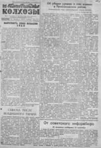 * 1*’ П р о л е т а р и и в с е х с т ра н , соеди няйте сь ' 2й колхозы Орган Северного РК ВКП'б/ и Райсовета депутатов ____________ т р у д я щ и х с я Н о в о с и б и р с к о й о б л а е т * 8 3 ( 6 3 4 ) [ 24 сентября 1942 г . че тв ер г ЦЦепа ю а. ВЫПОЛНИТЬ ПЛАН ВСПАШКИ З Я Б И Косовица хлебов в колхозах н а шего района до сих пор еще не закончена. На 2 0 сентябри скоше . по 0 1, 3 процента к план у. Хлеб, который стоит на корню, подвергае тс я огромным потерям от осыпания. Скошенный хлеб еще далеко не весь заскирдован, обмолочен. Следовательно потери зер- с каются огромные. В су- 4-Д-уто годину войны »то являет ся тя жк ам ириступлснием. Роди на не простит нам этого. Необходимо в ближайшие 2 — 3 дня ля к видировать это позорное отставание. Каждый должен про никнуться чувством ответственности за честь своею колхоза, района, работать в эти дги та к , чтобы буквально пару дней закончи ть косовицу, тирдование, обмолот, широким • потоком дв инуть хлеб на заготовительные пу нк ты . У нас имеются все основания работать т а к , ва к работают в передовых райо- DÍrX области, к а к работают в Венгеровском районе, с которым мы соревнуемся. Мы позорно от . стали в соревновании. Венгеровс к и й район уже закончил косо вицу, заканчивает скирдование, обмолот. Тем больше усилий должвы папрячь мы, своей самоотверженной работой смыть позор отс тавания, Наряду с завершением уборки и др у ги х важнейших хоз яйственно-политических работ, сейчас необходимо позаботиться о судьбе бу дущ ею уро жая , употребить все усилия к тому, чтобы к ак можно больше заготовпть зяби. В прошлом году у нас было позорно мало поднято зяби. Н результате весенний сев недопустимо з а тя нулся , мы недобрали ты сяч и пу дов зерна. Подобной ошибки нельзя допу с тит ь вторично ни в коем случае В наше м районе нужно за:ото вить 1 4 . 4 7 0 га. зяби. Это количество зяби нужно поднять во стоятельствах. Самое суровое па-' капание должны понести те ру-, ководптели, которые попытаются не выполнить план вспашки зяби. А факты уже свидетельствуют о том, что отдельные руководители колхоюв и сельсоветов, работники М1С, ссылаясь на трудности уборки, озимого сева, ничего не делают для организации вспашк и зяби. С подобным явлением надо покончить самым решительным образом. В своей телеграмме ЦК В КП (б) СП К СС СР разъясняют, что зяблевая вспашк а в этом году имеет особое значение и требуют выполнение плана вспашьи зяби по каждому колхозу. Работа по подъему зяби должна уже развертываться полным ходом и не пре кращаться вплоть до замерзания почвы. Не менее 4 0 процентов живого тя гла , все тр акторы пе за нятые на уборке, должны быть немедленно переключены на в спашк у зяби. Надо широко Ирак тиковать работу на сменных лошадях, быка х, применять метод знатного пах аря Нагорного. Для пахарей, трактористов, занятых на вспашке зяби, установлена поощрительная система оплаты труда. Все колхозника, ра ботающие на вспашк е зяби, , получают авансирование зерном в размерах, установленных для колхозников, за нятых на уборке урожая. Об этом необходимо довести до созпания каждого работника. Военная обстановка требует от каждого работника максимального г- напряжения сил. Умелая органп- •• зация труда, рациопальпое иегюль- е зование машин, хозяйское, забот- - липое отношенве к т я г л у — помо- - жет успешному проведению всего комплекса осенних работ. И в - этой работе одной из главных за-