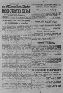77 р олетарии всех ал ран, соединяйтесь! ж КОЛХОЗЫ О р г ан С е в е р н о г о РК В К В Д и Р а й с о в е т а д епу та то в т р у д я щ и х с я Н о в о с и б и рск ой о б л а ст и |']4 октября 1942 г. воскресенье | Цепа ю Е. Выполним свои обязательства по хлебосдаче в Октябре Вс е ши ре р а з в е р т ы в а е т с я соци а л и с ти ч е ск о е соре вн ова ни е име - ви Х Х Т - о й го д о в щ ин ы Ве л и ко й О к тя б рь с кой с оц и а л и с т и ч е с ко й р евол юции . В от ве т па п р и з ы в бой цов, команди ров и пол и тр а б о тн и к о в Н-с кой б р и г а д ы с и б и р я к о в , колхозники И колхозницы подлинный п а т р ио т ы н а ш е й родины, с а м оотв е рж ен но ге ро и ч е с к и борют с я за у с п еш н о е о к о н ч а н и е с е л ь с к о х о з я й с т в е н н ы х р аб о т, о к а з ы вая с во им т р у д о м п о м о щ ь героич ес ко й К р а с но й А р м и и в разгр о ме н е н а в и с т н ы х гра б и те лей г и т л е р о в ц е в . О п и э т и з а м е ч а т е льный с и п ы и до ч е р и родины пре кра сн о с оз на ю т, ч т о и х т р у д необходим дл я победы над в р а гом . П рим ер ом э то г о трудо во го г е ро и зм а, с т р е м л е н и я б о л ь ш е ок а за ть по мо щи фр о н ту я в л я е т с я работа бой ц а-фрои то ви кл тов. Б у г л е р в а , ко т о р ы й в е р н у в ш и с ь с фронта, где он в борьб е с фаши ст а ми п о т е р я л н о г у , с ум е л убр ать н а ж а т к е само сб роске 1 5 0 ге к т а р о в и с е й ча с о бя за лс я уб р а т ь ещ е 5 0 г е * т а р о з . Ком бай нер Се ве рно й М Т С , то в. Д о в г у л е в на своем комба йне у б и р а е т п я т у ю сотню ге к т а р о в хл еб а . Колх озы Б н а з и н С к о г о , Федоровского сельсоветов з а к а н ч и в а ю т убо р к у х леба и п о -б о л ы п е в и с т с к и в е д у т хл ебос да чу . Пр им ер о м и с т и н ной п ре д а н н о с т и род и не ,с тр ас тн о г о ж е л а н и я помочь ф р о н т у , при меров подлинн ого тр у д о в о го г е ро и з м а мо ж но п ри в е с т и мн ого . Ко лхо зы н а ш е г о р а й о н а чес тно в ы по л н яю т свою п е р в у ю за по ве дь перед г о с уд ар ст в ом , дос рочно р а с с ч и т ы в а я с ь по х л е б оза го то вк ам . Т а к н а п р и м е р , к о л х о з « Л но -Ю л» , Пово -Е ли за ровс к сг о с е льс ов ет а, в ы полнил п л а н х л е б о с д а ч и на 1 0 0 п роц ен то в, к о л х о ? « П р о г р е с с » , н а 7 2 , 8 про ц е н т а , колдо з « Ге ро й» , на 3 0 про ц е н то в , « Е н п я ш » , на 2 3 п р о ц е н т а , «К р а с но г в а р д е е ц» , на 4 9 пр оц ен то в, им. К а р л а М а р к с а , на 3 0 п роц ен тов. У к олхо зн ико в и руко во д и те л ей э т и х колхозов с ле за не ра с х о д я т с я с делом. Но о д н а к о , в целом по р а й о ну хл еб оза го то вк и иду т к р а й не н е у дов ле творительно. Н а 1- е о к т я б р я 4 2 - г о д а п л а н ш п о л п е н па 6 , 9 проц ент а. До с и х по р дв а д ц а ть колхо зов не п р о с т у п и л и к хлебо сдаче . В числе л х т а к и е к а к : « 1 7 де т О к т я б р я » , < 1 7 -й п а р т с ъ е з д » , « Б о е в и к » , « К р а с н ы й о х о т н и к » , им. М а к с и м а Горь к о го . Р у к о в о д и те ли э т и х колхозов не п о н и м а ют , ч то в т а к о е вр^мя ко гд а идет в ойна за ж и з н ь , чес ть и свобо ду, с ов е т с ко ю н ар ода , ко гда л ь е т с я с в я щ е н н а я к р о в ь л у ч ш и х сынов и дочерей родины ’ в борьбе с к р ов а в ы м х и щ н ы м зв е ре м — фа- ши ст см и. П р е с т у п н о не в ы п о л н я т ь свои о б я з а т е л ь с т в а перед г о с у д а р с т в о м . Ко лхо зы н аш е го р а й о н а в о з м о г у т о с т а в а т ь с я в п озо рн ом с п и с к о д о л ж н и к а м и фронт у. Н ео бхо димо п о ко н ч и т ь с м е дл и т ел ьн ост ь ю в вы п о л н е н и и с л а н а хл ебоза го то во к . Р аб ота мол оти лок, с у ш и л о к до л ж на бы ть обе спе че на к р у