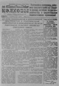 Пролетарии всех стран, соединяйтесь: Орган Се нерного РК ВиГ1(б^ н Райс овета депутатов ___________ тр уд ящихся Н овосибирской области 7 октября 1942 г. среда |ц«а 10 s' К о л е т м иколхозницы, рбатоники пльсиого хозяйства! Следуйте нрвюру алтайских патриотов— вклигашгь в предобкрьтсякое социалистическое соревнование! КО ВСЕМ КОЛХОЗНИКАМ И КОЛХОЗНИЦАМ, ТРАКТОРИСТАМ И ТРАКТОРИСТКАМ, КОМБАЙНЕРАМ И КОМБАЙНЕРКАМ, КО ВСЕМ РАБОТНИКАМ СЕЛЬСКОГО ХОЗЯЙСТВА СОВЕТСКОГО СОЮЗА Дорог ие т о в а р и щ и ! U т я ж е л ы е п гр озн ые д н и в с т р е чае м мы X X V г о д о в щ и н у В ел и кой вы пол пит ь свои о б я з а т е л ь с т в а пере д г о с у д а р с т в ом . М ы п р и з ы в а ем по л но с ть ю у б р а т ь т е х н и ч е с к и е О к т я б р ь с к о й с о ц и а л и с т и ч е с ко й ре- Е ) д ь т 1 РУ - Собр ать I г Х г ’. “ “ 5 ^ вот у ж о бол ьше года в а р в а р с к и ° ‘ ^ * ,Х ®Р0 Ш 0 : <^ Р а в и ? ь р а з р у ш а е т ’ п а ш и к о л х о з ы , жили-» • у в 0В° Щ Р 2 р а м л и щ а х , щ а я ш к о л ы , т о п ч е т с воим по -1 » 6 * Ч “ * Полаго с т * ° г а н ы м сапо го м н а ш и плодородные * ^“ б ь * ^0Р0Ш0 обоспен и в ы , и з м ы в а е т с я и г л у м и т с я над с ов е т с ки м и лю дь ми . С к о л ь к о л ю дей п е р е с т ре л я л и а п е р е в е ш а л и ио де ЦК к е в р о в р п у й щ л , с к о л ь к о з а г у б и л и м а л ы х д е т е й , ск олья о р у с с к и х , у к р а и н с к и х и б е л о ру с с к и х людей полов ил и и у г н а л и в неволю на к а т о р ж и ы е ра бо ты ! ч и т ь с к о т к о р м а м и на з и м у и по дг ото ви ть е м у т е п л ы е ш а е щ е . ния . П р и в е с т и в поря д о к , в ы ч и с т и т ь , с м а з а т ь и уб р а т ь у вс е сельски>;огайствен’ные- м а ш и н ы . *]ем с ко р е е м ы эт о в ы п о л н и м , те м л у ч ш е пойду а д е л а на. фро нт а х и т е м л е г ч е бу д ет ра зб ит ь п с л а Б и с т л ы х н е м е ц к и х за хв ат - Т ов а р ищ и к о л х о з н и к и ! Н е у ж е л ! * ч и ко в . 8 а ’ : ?л чи и коеопицу зе р н о в ы х хлебов в о зн ам е нов ан и е X X V г о до вщ и н ы Ве лико го О ктя б ри , м ы б г уе м п а с еб я до полни те льные об я за те л ьс тв а и в ы з ы в а е м последова ть й а ш е м у п р и м е р у ь х ех мы* и д а л ь ш е д о п у с т и м , чтобы н а ш а ¿ р а т ь я у м и р а л и п о д нем ец к и й и г о м , чтобы п о т о к а м и рро в и н а ш и х д е те й , ж е н щ и н и ст а р ик о в з а лива лис ь у л и ц ы с о в е т с к и х гор одов и се л , чтобы н а ш хлеб у во зили н е м е ц к и м п с а м в Г е р м а н и ю ? Но т , то в а р и щ и ! К а ж д ы й , в к о м бь ет ся сердце с о в е т с ко г о п а т р и о т а , н ик о г д а н с до лжен у с п о к о и т ь с я , п о к а в е у н и ч т о ж и т послед нег о н е м ц а , при ш е дш ег о гр а б и т ь п а ш у с т р а н у . В с е с и л ы п олож им па то , чтобы с в е р п у т ъ ш ею лютому в р а г у ! А т л а с , от к о л х о з н о г о к р е с т ь я н с т в а , во мно го м 8 а к в с п т победа К р а с но й А р м и и над вр аг ом . К а ж д о м у я с н о , ч то б е з хлеба , без т е х н и ч е с к и х к у л ь т у р , без ово щей , м я с а , ж о р о в и ш ер е тр в о е в а т ь н е л ь з я . М ы п р и з ы в а е м в с е х колхо знико в и к о л х о з н и ц , вс е х раб о тн и к ов м а ш и н н о - т р а к то р н ы х с т а н ц и й Со в е т ск о го Союза уд во и ть и у т р о и т ь с во и у с и л и я н а по лев ых ра б о т а х и в к р а т ч а й ш и й с р о к со б рат ь без п оте рь до единого з е р н ы ш к а ве сь у р о ж а й хл ебов, по лно с ть ю з а в е р ш и т ь ски р д о в а н и е , обмолот и с че с ть ю колхо зн ико в и ко л хо зн и ц , в с е х раб отник ов с е л ь с к о г о х оз я й ст в а Со ве т ск о го Союза. 1 . З а к о н ч и т ь с ки рдо ва ние х л е бов к 1 о к т я б р я . 2 . З а в е р ш и т ь обмолот в с е х к у л ь т у р к 2 0 о к т я б ря 3 