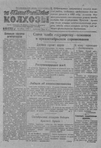 Пролетарии* ваех (рпран, сосдичяьтесь О р г а н С е м е р н о г о Р К ВКП(б^ н - Р а й с о в е т а д е п у т а т о в т р у д я щ и х с я H o p o f и б и р с к о й о б л а с т и №88(639)1 j O октября 1942 г. пятница |цем Юн. % ^О бразцовым завершением о се нни х поле вы х работ, созданием п редпосы лок д ля выс о к о г о у р о ж а я в 1943 го ду , к о л хо з ы д ол жныумнож ить свои нынешние у с п е х и , чтобы создать для госу дарства , 4Кр а с ной Арми и еще более мощные продовольственные р е с у р сы , чтобы этим ускорить п о б е ду над не мецко-фашист ск ими банд итами. Боевые задачи агитаторов С к о р о н а р о ды С о в е т с к о г о С о ю з а б у д у т о т м е ч а т ь з н а м е н а т е л ь н у ю д а т у в и ст о р и и нашей с т р а н ы » - Х Х У г о д о в щ и н у В е л и к ой О к т я б р ь с к о й с о ц и а л и с т и ч е ск о й р е в о л ю ц и и . Н а п р е д п р и я т и я х , в к о л х о з а х , у ч р е ж д е н и я х вы с о к о п о д н ят о ЗН-МЯ п р е д о к т я б р ь с к о г о с о ц и а л и с т и ч е с к о г о с о р е в н о в а н и я . Т р у д я щ и е с я С о в е т с к о г о С о ю з а в с т р е чаю т г о д о в щ и н у В е л и к о г о О к тяб ря новыми ' п р о и з в о д с т в е н ными п о б е д а м и , г о т о в я т м а т е р и - р о д и н е п р о и з в о д с т в е н н ы е п о д а р к и . В к о л х о з а х , М Т С , на п р е д п р и я т и я х , в ^ г ч р е ж д е н и я х н а ш е го р а йон а- с е й ч а с п р о х о д я т с о б р а н и я , н а к о т о р ы х т р у д я щ и ес я б е р у т о б я з а т е л ь с т в а , кл я н у т с я р а б о т а т ь б о л ь ш е , л у чш е , отд ан а в с е с и лы на п ом ощ ь ф р о н т у с тем, чтоб ы у с к о р и т ь р а з г р о м п о д л о г о в р а г а . В п р о в е д е н и и э т о г о м е р о п р и ятия и с к л ю ч и т е л ь н о о т в е т с т в е н н а я р о л ь в о з л а г а е т е ^ на а г и т а т о р о в . Б о е в ы е з а д а ч и а г и т а т о р о в —д о б и т ь с я , ч тоб ы ни о д н о г о ч е л о в е к а не о с т а л о с ь вн е с о р е в н о в а н и я , . ч т о б ы в с е о б я з а т е л ь с т в а , вз я т ы е в п р е д о к т я б р ь с к о м с о р е в н о в а н и и , бы ли вы п о л не н ы . Наш р а й о н н е д о п у с т и м о з а т я н у л х л е б о с д а ч у , до с и х по р не з а к о н ч е н а м о л о т ь б а , с к и р д о в а н и е , м е д л ен н о идет в с п а ш к а з ябн . Д е л о ч ес т и в с е х т р у д я щ и х с я р а й о н а — н а п р я ч ь в се с и л ы , д о б и т ь с я , что бы к X X V г о д о вщ и н е О к т я б р я были п о л н о с т ь ю з а к о н ч е н ы в с е с е л ь х о з р а б о т ы , в ы п о л н е н ы о б я з а т е л ь с т в а по в с е м п л а т е ж а м . Т о в а р и щ и аг ит а т о ры ! И дит е в б р и г а д ы , к мо ло ти л ь ны м а г р е г а т а м , в т р а н с п о р т н ы е зв е н ь я , в ж и в о т н о в о д ч е с к и е б р иг а ды Р а с с к а ж и т е там о в с е н а р о д н о м п р е д о к т я б р ь с к о м с о р е в н о в а ‘ ¿ и , д о б е й т е с ь п о с л о в н о г о у ч а с т и я в с о р е в н о в а н и и , б о р и т е с ь за т о , чт об ы в с е о б я з а т е л ь с т в а бы ли вы п о л не н ы . П о к а ж и т е са м и о б р а з ц ы г е р о и ч е с ко г о т р у д а , з а ж г и т е св о им пр и мером на с а м о о т в е р ж е н н у ю р а б о т у д р у г и х * д о б е й т е с ь , чт обы в дни п р е д о к т я б р ь с к о г о с о р е в н о в а н и я р а б о т а шла д е н ь и но чь, что бы в с е р а б о т а л и д е й с т в и т е л ь н о не п о к ла да я р у к , т а к , к а к б ь ю т с я наши во ины с в р а г ом на у л и ц а х С т а л и н г р а д а , в п р е д г о р ь я х К а в к а з а . Ни ш а г у н а з а д ! Т а к о в п р и к а з Р о дин а д а л а б о й ц а м на ф р о н т е . Р а з ф р о н т т р е б у е т - с д е л а е м ! — т а к о в л о з у н г д о л ж е н с тат ь з а к о н о м с о в е т с к о г о п а т р и о т а в ты лу1 В колхоз,-, Н е в е р н а » з я у я » , О с т я ц к о го с ел ьсо ве та, по-во 